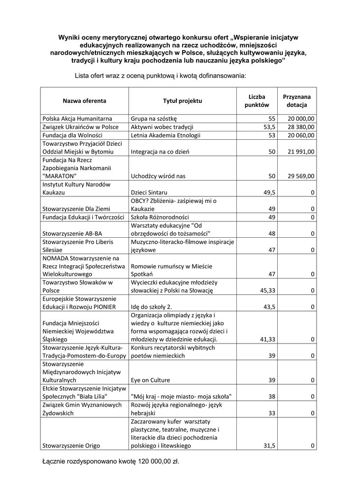 Wyniki oceny merytorycznej otwartego konkursu ofert „Wspieranie inicjatyw edukacyjnych realizowanych na rzecz uchodźców, mniejszości narodowych/etnicznych mieszkających w Polsce, służących kultywowaniu języka, tradycji i kultury kraju pochodzenia lub nauczaniu języka polskiego” Lista ofert wraz z oceną punktową i kwotą dofinansowania: Nazwa oferenta Polska Akcja Humanitarna Związek Ukraińców w Polsce Fundacja dla Wolności Towarzystwo Przyjaciół Dzieci Oddział Miejski w Bytomiu Fundacja Na Rzecz Zapobiegania Narkomanii "MARATON" Instytut Kultury Narodów Kaukazu Stowarzyszenie Dla Ziemi Fundacja Edukacji i Twórczości Stowarzyszenie AB-BA Stowarzyszenie Pro Liberis Silesiae NOMADA Stowarzyszenie na Rzecz Integracji Społeczeństwa Wielokulturowego Towarzystwo Słowaków w Polsce Europejskie Stowarzyszenie Edukacji i Rozwoju PIONIER Tytuł projektu Grupa na szóstkę Aktywni wobec tradycji Letnia Akademia Etnologii Liczba punktów Przyznana dotacja 55 53,5 53 20 000,00 28 380,00 20 060,00 Integracja na co dzień 50 21 991,00 Uchodźcy wśród nas 50 29 569,00 49,5 0 49 49 0 0 48 0 47 0 47 0 45,33 0 43,5 0 41,33 0 39 0 39 0 38 0 33 0 31,5 0 Dzieci Sintaru OBCY? Zbliżenia- zaśpiewaj mi o Kaukazie Szkoła Różnorodności Warsztaty edukacyjne "Od obrzędowości do tożsamości" Muzyczno-literacko-filmowe inspiracje językowe Romowie rumuńscy w Mieście Spotkań Wycieczki edukacyjne młodzieży słowackiej z Polski na Słowację Idę do szkoły 2. Organizacja olimpiady z języka i Fundacja Mniejszości wiedzy o kulturze niemieckiej jako Niemieckiej Województwa forma wspomagająca rozwój dzieci i Śląskiego młodzieży w dziedzinie edukacji. Stowarzyszenie Język-Kultura- Konkurs recytatorski wybitnych Tradycja-Pomostem-do-Europy poetów niemieckich Stowarzyszenie Międzynarodowych Inicjatyw Kulturalnych Eye on Culture Ełckie Stowarzyszenie Inicjatyw Społecznych "Biała Lilia" "Mój kraj - moje miasto- moja szkoła" Związek Gmin Wyznaniowych Rozwój języka regionalnego- język Żydowskich hebrajski Zaczarowany kufer warsztaty plastyczne, teatralne, muzyczne i literackie dla dzieci pochodzenia Stowarzyszenie Origo polskiego i litewskiego Łącznie rozdysponowano kwotę 120 000,00 zł.