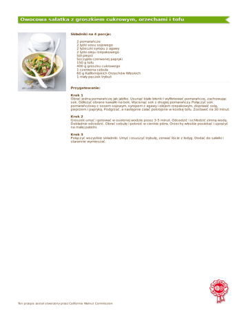 Owocowasałatkazgroszkiemcukrowym,orzechamiitofu Składnikina4porcje: 2pomarańcze 2łyżkisosusojowego 2łyżeczkisyropuzagawy 2łyżkiolejurzepakowego Sólpieprz Szczyptaczerwonejpapryki 150gtofu 400ggroszkucukrowego 1czerwonacebula 60gKalifornijskichOrzechówWłoskich 1małypęczektrybuli Przygotowanie: Krok1 Obraćjednąpomarańczęjakjabłko.Usunąćbiałebłonkiiwyfiletowaćpomarańczę,zachowując sok.Odłożyćobranekawałkinabok.Wycisnąćsokzdrugiejpomarańczy.Połączyćsok pomarańczowyzsosemsojowym,syropemzagawyiolejemrzepakowym,doprawićsolą, pieprzemipapryką.Podgrzać,anastępniezalaćpokrojonewkostkętofu.Zostawićna30minut. Krok2 Groszekumyćigotowaćwosolonejwodzieprzez3-5minut.Odcedzićischłodzićzimnąwodą. Dokładnieodcedzić.Obraćcebulęipokroićwcienkiepióra.Orzechywłoskieposiekaćiuprażyć namałejpatelni. Krok3 Połączyćwszystkieskładniki.Umyćiosuszyćtrybulę,zerwaćliściezłodyg.Dodaćdosałatkii staranniewymieszać. TenprzepiszostałstworzonyprzezCaliforniaWalnutCommission