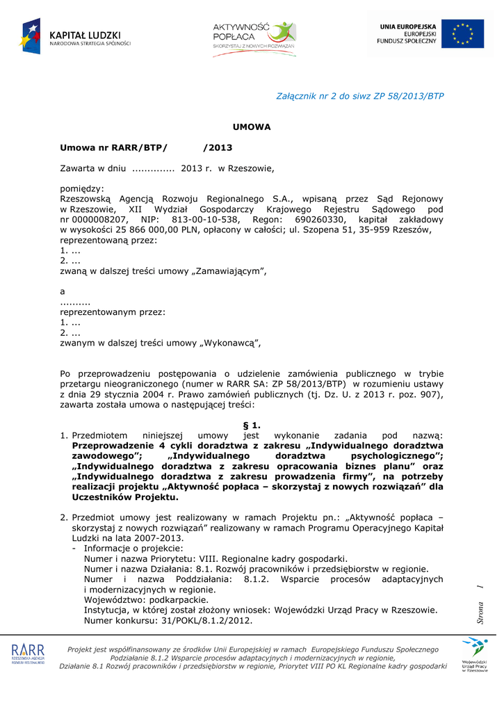 Załącznik nr 2 do siwz ZP 58/2013/BTP UMOWA Umowa nr RARR/BTP/ /2013 Zawarta w dniu .............. 2013 r. w Rzeszowie, pomiędzy: Rzeszowską Agencją Rozwoju Regionalnego S.A., wpisaną przez Sąd Rejonowy w Rzeszowie, XII Wydział Gospodarczy Krajowego Rejestru Sądowego pod nr 0000008207, NIP: 813-00-10-538, Regon: 690260330, kapitał zakładowy w wysokości 25 866 000,00 PLN, opłacony w całości; ul. Szopena 51, 35-959 Rzeszów, reprezentowaną przez: 1. ... 2. ... zwaną w dalszej treści umowy „Zamawiającym”, a .......... reprezentowanym przez: 1. ... 2. ... zwanym w dalszej treści umowy „Wykonawcą”, Po przeprowadzeniu postępowania o udzielenie zamówienia publicznego w trybie przetargu nieograniczonego (numer w RARR SA: ZP 58/2013/BTP) w rozumieniu ustawy z dnia 29 stycznia 2004 r. Prawo zamówień publicznych (tj. Dz. U. z 2013 r. poz. 907), zawarta została umowa o następującej treści: Projekt jest współfinansowany ze środków Unii Europejskiej w ramach Europejskiego Funduszu Społecznego Podziałanie 8.1.2 Wsparcie procesów adaptacyjnych i modernizacyjnych w regionie, Działanie 8.1 Rozwój pracowników i przedsiębiorstw w regionie, Priorytet VIII PO KL Regionalne kadry gospodarki Strona 2. Przedmiot umowy jest realizowany w ramach Projektu pn.: „Aktywność popłaca – skorzystaj z nowych rozwiązań” realizowany w ramach Programu Operacyjnego Kapitał Ludzki na lata 2007-2013. - Informacje o projekcie: Numer i nazwa Priorytetu: VIII. Regionalne kadry gospodarki. Numer i nazwa Działania: 8.1. Rozwój pracowników i przedsiębiorstw w regionie. Numer i nazwa Poddziałania: 8.1.2. Wsparcie procesów adaptacyjnych i modernizacyjnych w regionie. Województwo: podkarpackie. Instytucja, w której został złożony wniosek: Wojewódzki Urząd Pracy w Rzeszowie. Numer konkursu: 31/POKL/8.1.2/2012. 1 § 1. 1. Przedmiotem niniejszej umowy jest wykonanie zadania pod nazwą: Przeprowadzenie 4 cykli doradztwa z zakresu „Indywidualnego doradztwa zawodowego”; „Indywidualnego doradztwa psychologicznego”; „Indywidualnego doradztwa z zakresu opracowania biznes planu” oraz „Indywidualnego doradztwa z zakresu prowadzenia firmy”, na potrzeby realizacji projektu „Aktywność popłaca – skorzystaj z nowych rozwiązań” dla Uczestników Projektu. Okres realizacji projektu: od 01.01.2013 do 30.09.2014. Obszar realizacji projektu: Województwo Podkarpackie. Nazwa Beneficjenta: Rzeszowska Agencja Rozwoju Regionalnego S.A. - Umowa o dofinansowanie projektu nr UDA-POKL.08.01.02-18-180/12-00 zawarta w dniu 21.02.2013 r. pomiędzy Województwem Podkarpackim – Wojewódzkim Urzędem Pracy w Rzeszowie a Rzeszowską Agencją Rozwoju Regionalnego S.A. w Rzeszowie. 3. Szczegółowy opis i zakres przedmiotu umowy określa siwz wraz z załącznikami. 4. Wykonawca jest zobowiązany na wszystkich opracowanych przez siebie materiałach oraz w korespondencji prowadzonej w związku z realizacją niniejszej umowy umieścić logo i oznaczenia wskazane przez Zamawiającego. 5. Zamawiający zastrzega sobie prawo do kontroli przeprowadzanych usług podczas ich realizacji w tym w szczególności Zamawiający zastrzega sobie prawo do kontroli przygotowanych stanowisk szkoleniowych oraz warunków higieniczno-sanitarnych dzień przed rozpoczęciem doradztwa i podczas doradztwa oraz dokonania kontroli przebiegu i sposobu prowadzenia doradztwa. § 2. 1. Termin realizacji przedmiotu umowy: nie wcześniej niż do 4 tygodni od zawarcia umowy do 31 stycznia 2014 r. 2. Wykonanie przedmiotu umowy w harmonogramie doradztwa. odbywać się będzie w terminach określonych § 3. 1. Osobą upoważnioną przez Zamawiającego do kontaktu z Wykonawcą jest: ........ tel. ......... e-mail: ..........., 2. Osobą upoważnioną przez Wykonawcę do kontaktów z Zamawiającym jest: ......, tel: ...... , fax: ......, e-mail .... § 4. 1. Z tytułu realizacji zamówienia, o którym mowa w § 1, Wykonawca z zastrzeżeniem ust. 2 i ust. 3 otrzyma wynagrodzenie w wysokości nieprzekraczającej kwoty ........ zł brutto (słownie: .... złotych brutto). 2. Cena jednostkowa za jedną godzinę doradztwa dla danego cyklu doradztwa wynosi jak w ofercie. 2 Indywidualne doradztwo psychologiczne 3 Indywidualne doradztwo z zakresu opracowania biznes planu Indywidualne doradztwo z zakresu prowadzenia firmy 4 5 Razem Cena w zł brutto Cena brutto za 1 godzinę doradztwa Cena brutto za 1 godzinę doradztwa Cena brutto za 1 godzinę doradztwa Cena brutto za 1 godzinę doradztwa xxxxxxx xxxxxxx Cena brutto w zł Cena brutto za 210 godzin doradztwa Cena brutto za 210 godzin doradztwa Cena brutto za 150 godzin doradztwa Cena brutto za 120 godzin doradztwa xxxxxxx Projekt jest współfinansowany ze środków Unii Europejskiej w ramach Europejskiego Funduszu Społecznego Podziałanie 8.1.2 Wsparcie procesów adaptacyjnych i modernizacyjnych w regionie, Działanie 8.1 Rozwój pracowników i przedsiębiorstw w regionie, Priorytet VIII PO KL Regionalne kadry gospodarki 2 1 Nazwa cyklu (części zamówienia) Indywidualne doradztwo zawodowe Strona Lp. 3. Rzeczywiste wynagrodzenie Wykonawcy będzie wyliczone poprzez pomnożenie ceny za jedna godzinę doradztwa danego cyklu oraz faktyczne zrealizowanej liczby godzin doradztwa. 4. Cena jednostkowa brutto podana w ofercie jest niezmienna do końca realizacji przedmiotu umowy. 5. Cena jednostkowa brutto podana w ofercie obejmuje wszystkie koszty wykonania przedmiotu umowy. Cena brutto zawiera wszystkie koszty w tym w szczególności koszty doradców, materiałów szkoleniowych, dokumentacji z doradztwa, sprzętu, lokalu, opracowań, opłat, ubezpieczenia, uzgodnień, dojazdów doradców, oraz inne koszty związane z wykonaniem przedmiotu zamówienia zgodnie z przepisami. 6. Zamawiający nie udziela zaliczek. 7. Zamawiający nie wyraża zgody na dokonywanie przelewu wierzytelności przysługujących wykonawcy z tytułu niniejszej umowy. § 5. 1. Zapłata wynagrodzenia umownego n