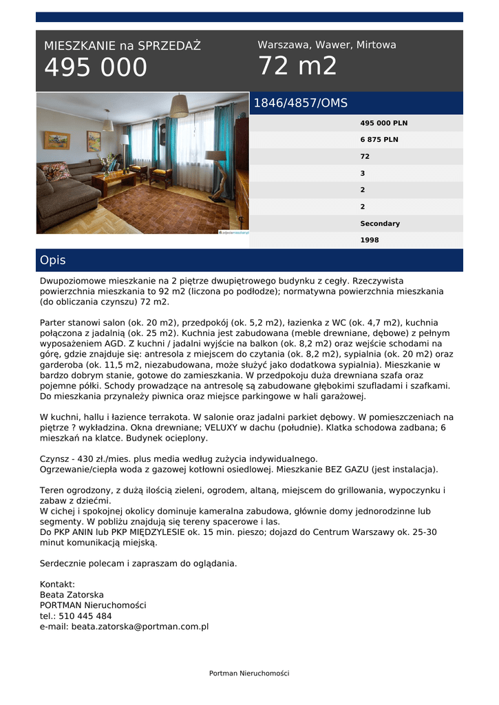 Warszawa, Wawer, Mirtowa MIESZKANIE na SPRZEDAŻ 72 m2 495 000 1846/4857/OMS 495 000 PLN 6 875 PLN 72 3 2 2 Secondary 1998 Opis Dwupoziomowe mieszkanie na 2 piętrze dwupiętrowego budynku z cegły. Rzeczywista powierzchnia mieszkania to 92 m2 (liczona po podłodze); normatywna powierzchnia mieszkania (do obliczania czynszu) 72 m2. Parter stanowi salon (ok. 20 m2), przedpokój (ok. 5,2 m2), łazienka z WC (ok. 4,7 m2), kuchnia połączona z jadalnią (ok. 25 m2). Kuchnia jest zabudowana (meble drewniane, dębowe) z pełnym wyposażeniem AGD. Z kuchni / jadalni wyjście na balkon (ok. 8,2 m2) oraz wejście schodami na górę, gdzie znajduje się: antresola z miejscem do czytania (ok. 8,2 m2), sypialnia (ok. 20 m2) oraz garderoba (ok. 11,5 m2, niezabudowana, może służyć jako dodatkowa sypialnia). Mieszkanie w bardzo dobrym stanie, gotowe do zamieszkania. W przedpokoju duża drewniana szafa oraz pojemne półki. Schody prowadzące na antresolę są zabudowane głębokimi szufladami i szafkami. Do mieszkania przynależy piwnica oraz miejsce parkingowe w hali garażowej. W kuchni, hallu i łazience terrakota. W salonie oraz jadalni parkiet dębowy. W pomieszczeniach na piętrze ? wykładzina. Okna drewniane; VELUXY w dachu (południe). Klatka schodowa zadbana; 6 mieszkań na klatce. Budynek ocieplony. Czynsz - 430 zł./mies. plus media według zużycia indywidualnego. Ogrzewanie/ciepła woda z gazowej kotłowni osiedlowej. Mieszkanie BEZ GAZU (jest instalacja). Teren ogrodzony, z dużą ilością zieleni, ogrodem, altaną, miejscem do grillowania, wypoczynku i zabaw z dziećmi. W cichej i spokojnej okolicy dominuje kameralna zabudowa, głównie domy jednorodzinne lub segmenty. W pobliżu znajdują się tereny spacerowe i las. Do PKP ANIN lub PKP MIĘDZYLESIE ok. 15 min. pieszo; dojazd do Centrum Warszawy ok. 25-30 minut komunikacją miejską. Serdecznie polecam i zapraszam do oglądania. Kontakt: Beata Zatorska PORTMAN Nieruchomości tel.: 510 445 484 e-mail: [email protected] Portman Nieruchomości Beata Zatorska tel. 510 445 484 email: [email protected] Portman Nieruchomości Powered by TCPDF (www.tcpdf.org)