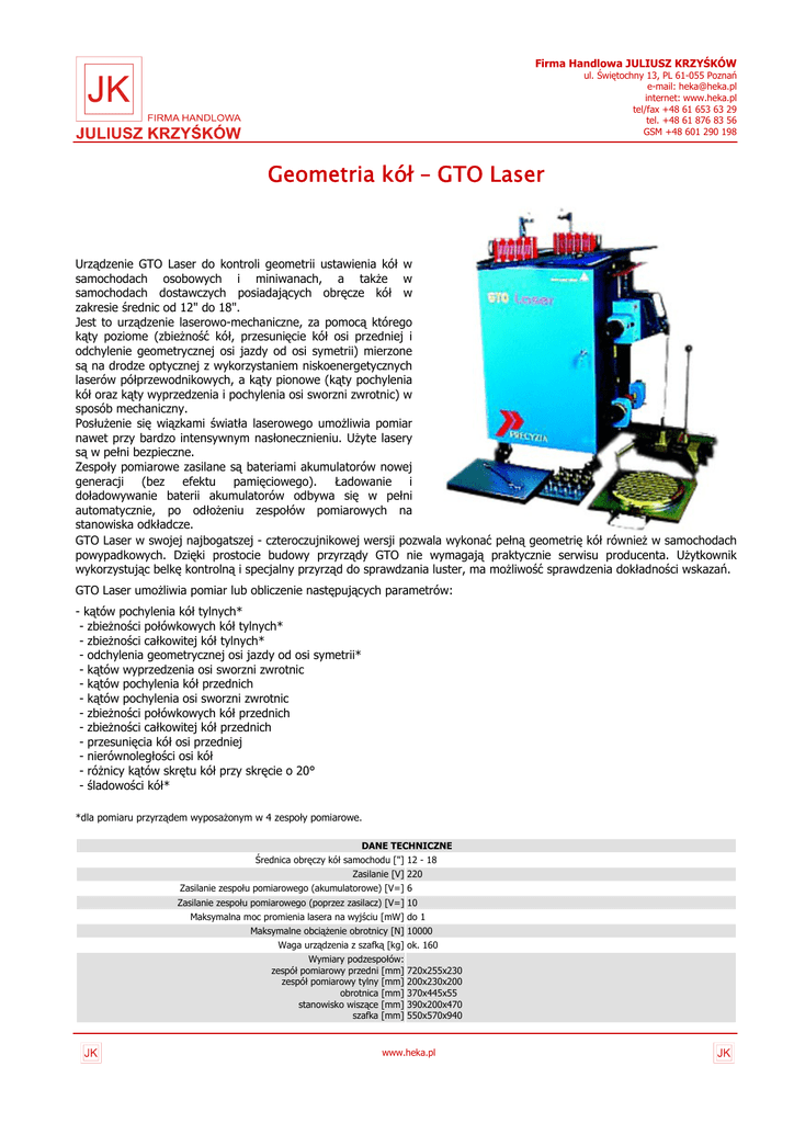 Firma Handlowa JULIUSZ KRZYŚKÓW ul. Świętochny 13, PL 61-055 Poznań e-mail: [email protected] internet: www.heka.pl tel/fax +48 61 653 63 29 tel. +48 61 876 83 56 GSM +48 601 290 198 Geometria kół – GTO Laser Urządzenie GTO Laser do kontroli geometrii ustawienia kół w samochodach osobowych i miniwanach, a także w samochodach dostawczych posiadających obręcze kół w zakresie średnic od 12" do 18". Jest to urządzenie laserowo-mechaniczne, za pomocą którego kąty poziome (zbieżność kół, przesunięcie kół osi przedniej i odchylenie geometrycznej osi jazdy od osi symetrii) mierzone są na drodze optycznej z wykorzystaniem niskoenergetycznych laserów półprzewodnikowych, a kąty pionowe (kąty pochylenia kół oraz kąty wyprzedzenia i pochylenia osi sworzni zwrotnic) w sposób mechaniczny. Posłużenie się wiązkami światła laserowego umożliwia pomiar nawet przy bardzo intensywnym nasłonecznieniu. Użyte lasery są w pełni bezpieczne. Zespoły pomiarowe zasilane są bateriami akumulatorów nowej generacji (bez efektu pamięciowego). Ładowanie i doładowywanie baterii akumulatorów odbywa się w pełni automatycznie, po odłożeniu zespołów pomiarowych na stanowiska odkładcze. GTO Laser w swojej najbogatszej - czteroczujnikowej wersji pozwala wykonać pełną geometrię kół również w samochodach powypadkowych. Dzięki prostocie budowy przyrządy GTO nie wymagają praktycznie serwisu producenta. Użytkownik wykorzystując belkę kontrolną i specjalny przyrząd do sprawdzania luster, ma możliwość sprawdzenia dokładności wskazań. GTO Laser umożliwia pomiar lub obliczenie następujących parametrów: - kątów pochylenia kół tylnych* - zbieżności połówkowych kół tylnych* - zbieżności całkowitej kół tylnych* - odchylenia geometrycznej osi jazdy od osi symetrii* - kątów wyprzedzenia osi sworzni zwrotnic - kątów pochylenia kół przednich - kątów pochylenia osi sworzni zwrotnic - zbieżności połówkowych kół przednich - zbieżności całkowitej kół przednich - przesunięcia kół osi przedniej - nierównoległości osi kół - różnicy kątów skrętu kół przy skręcie o 20° - śladowości kół* *dla pomiaru przyrządem wyposażonym w 4 zespoły pomiarowe. DANE TECHNICZNE Średnica obręczy kół samochodu ["] 12 - 18 Zasilanie [V] 220 Zasilanie zespołu pomiarowego (akumulatorowe) [V=] 6 Zasilanie zespołu pomiarowego (poprzez zasilacz) [V=] 10 Maksymalna moc promienia lasera na wyjściu [mW] do 1 Maksymalne obciążenie obrotnicy [N] 10000 Waga urządzenia z szafką [kg] ok. 160 Wymiary podzespołów: zespół pomiarowy przedni [mm] zespół pomiarowy tylny [mm] obrotnica [mm] stanowisko wiszące [mm] szafka [mm] 720x255x230 200x230x200 370x445x55 390x200x470 550x570x940 www.heka.pl