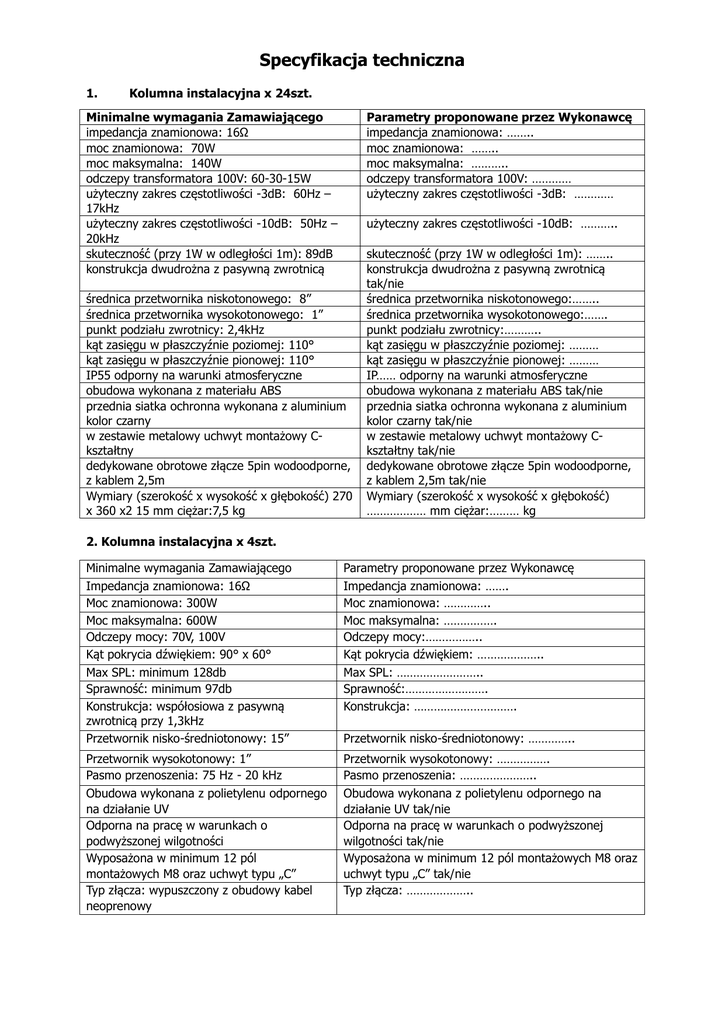 Specyfikacja techniczna 1. Kolumna instalacyjna x 24szt. Minimalne wymagania Zamawiającego impedancja znamionowa: 16Ω moc znamionowa: 70W moc maksymalna: 140W odczepy transformatora 100V: 60-30-15W użyteczny zakres częstotliwości -3dB: 60Hz – 17kHz użyteczny zakres częstotliwości -10dB: 50Hz – 20kHz skuteczność (przy 1W w odległości 1m): 89dB konstrukcja dwudrożna z pasywną zwrotnicą Parametry proponowane przez Wykonawcę impedancja znamionowa: …….. moc znamionowa: …….. moc maksymalna: ……….. odczepy transformatora 100V: ………… użyteczny zakres częstotliwości -3dB: ………… użyteczny zakres częstotliwości -10dB: ……….. średnica przetwornika niskotonowego: 8” średnica przetwornika wysokotonowego: 1” punkt podziału zwrotnicy: 2,4kHz kąt zasięgu w płaszczyźnie poziomej: 110° kąt zasięgu w płaszczyźnie pionowej: 110° IP55 odporny na warunki atmosferyczne obudowa wykonana z materiału ABS przednia siatka ochronna wykonana z aluminium kolor czarny w zestawie metalowy uchwyt montażowy Ckształtny dedykowane obrotowe złącze 5pin wodoodporne, z kablem 2,5m Wymiary (szerokość x wysokość x głębokość) 270 x 360 x2 15 mm ciężar:7,5 kg skuteczność (przy 1W w odległości 1m): …….. konstrukcja dwudrożna z pasywną zwrotnicą tak/nie średnica przetwornika niskotonowego:…….. średnica przetwornika wysokotonowego:……. punkt podziału zwrotnicy:……….. kąt zasięgu w płaszczyźnie poziomej: ……… kąt zasięgu w płaszczyźnie pionowej: ……… IP…… odporny na warunki atmosferyczne obudowa wykonana z materiału ABS tak/nie przednia siatka ochronna wykonana z aluminium kolor czarny tak/nie w zestawie metalowy uchwyt montażowy Ckształtny tak/nie dedykowane obrotowe złącze 5pin wodoodporne, z kablem 2,5m tak/nie Wymiary (szerokość x wysokość x głębokość) ……………… mm ciężar:……… kg 2. Kolumna instalacyjna x 4szt. Minimalne wymagania Zamawiającego Parametry proponowane przez Wykonawcę Impedancja znamionowa: 16Ω Moc znamionowa: 300W Moc maksymalna: 600W Odczepy mocy: 70V, 100V Kąt pokrycia dźwiękiem: 90° x 60° Max SPL: minimum 128db Sprawność: minimum 97db Konstrukcja: współosiowa z pasywną zwrotnicą przy 1,3kHz Przetwornik nisko-średniotonowy: 15” Impedancja znamionowa: ……. Moc znamionowa: ………….. Moc maksymalna: ……………. Odczepy mocy:…………….. Kąt pokrycia dźwiękiem: ……………….. Max SPL: …………………….. Sprawność:……………………. Konstrukcja: …………………………. Przetwornik wysokotonowy: 1” Pasmo przenoszenia: 75 Hz - 20 kHz Obudowa wykonana z polietylenu odpornego na działanie UV Odporna na pracę w warunkach o podwyższonej wilgotności Wyposażona w minimum 12 pól montażowych M8 oraz uchwyt typu „C” Typ złącza: wypuszczony z obudowy kabel neoprenowy Przetwornik wysokotonowy: ……………. Pasmo przenoszenia: ………………….. Obudowa wykonana z polietylenu odpornego na działanie UV tak/nie Odporna na pracę w warunkach o podwyższonej wilgotności tak/nie Wyposażona w minimum 12 pól montażowych M8 oraz uchwyt typu „C” tak/nie Typ złącza: ……………….. Przetwornik nisko-średniotonowy: ………….. 3. Wzmacniacz x 1szt. Minimalne wymagania Zamawiającego wzmacniacz minimum czterokanałowy klasa D moc znamionowa minimum 480W/ 100V na kanał wyjścia 4 x 100V / 70V / 4 Ohm, 4 potencjometry regulacji poziomu dla każdego wejścia niezależnie, umieszczone na panelu tylnym wejścia audio symetryczne złącza wejściowe: 4 x XLR złącza wyjść mocy: 4 x kostka euro blok 4 symetryczne wyjścia liniowe na złączach XLR do podania sygnału dalej wbudowany filtr górnoprzepustowy, częstotliwość odcięcia 400 Hz włącznik filtru na panelu tylnym, dla każdego kanału niezależnie czułość wejść -0.5 dB ~ 10.5 dB impedancja wejściowa 10kOhm pasmo przenoszenia nie gorsze niż: 50Hz – 22kHz THD+N <= 0,3% @ 1kHz stosunek sygnału do szumu >= 100dB włącznik zasilania na panelu przednim zabezpieczenia: termiczne, przeciwzwarciowe, przeciążeniowe, limiter diody Led sygnalizujące o włączeniu urządzenia, obecności sygnału na wejściu, obecności sygnału o poziomie -20dB, przesterowaniu, zadziałaniu układu zabezpieczenia, umieszczone na panelu przednim, waga nie większa niż 9kg przeznaczony do montażu w skrzyni rack 19” wysokość nie większa niż 2U jednostki rack Parametry proponowane przez Wykonawcę wzmacniacz minimum ………………………… klasa ……………. moc znamionowa minimum ………………… na kanał wyjścia ……………………….. ……………potencjometry regulacji poziomu dla każdego wejścia niezależnie, umieszczone na panelu tylnym wejścia audio symetryczne tak/nie złącza wejściowe: …………………. złącza wyjść mocy: ………………………… 4 symetryczne wyjścia liniowe na złączach XLR do podania sygnału dalej wbudowany filtr górnoprzepustowy, częstotliwość odcięcia 400 Hz włącznik filtru na panelu tylnym, dla każdego kanału niezależnie czułość wejść -………………………. impedancja wejściowa ……….. pasmo przenoszenia ………………. THD+N ………………….. stosunek sygnału do szumu >= 100dB włącznik zasilania na panelu przednim tak/nie zabezpieczenia: …………………………………………… diody Led sygnalizujące o włączeniu urządzenia, obecności sygnału na wejściu, obecności sygnału o poziomie -20dB, przesterowaniu, zadziałaniu układu zabezpieczenia, umieszczone na panelu przednim, tak/nie waga nie większa niż 9kg przeznaczony do montażu w skrzyni rack 19” wysokość nie większa niż 2U jednostki rack 4. Procesor głośnikowy x 1szt. Minimalne wymagania Zamawiającego Wejścia: 2 x symetryczne XLR, 1 x wejście dedykowane mikrofonu pomiarowego Wyjścia: 6 x symetryczne XLR Zniekształc
