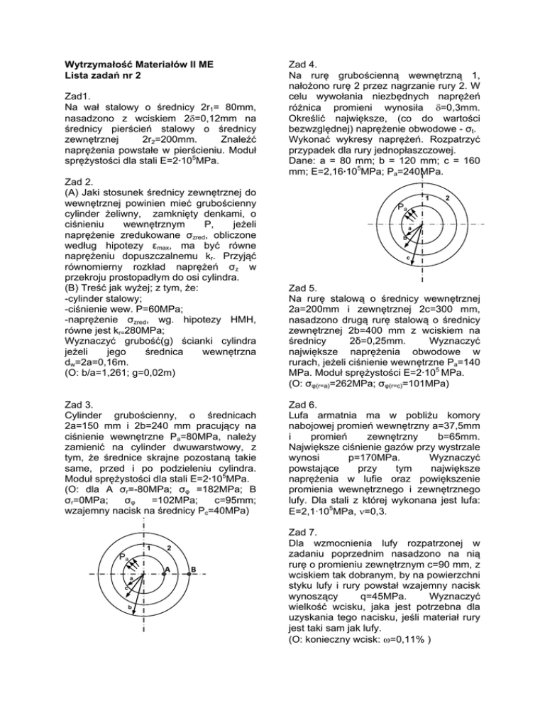 Wytrzymałość Materiałów II ME Lista zadań nr 2 Zad1. Na wał stalowy o średnicy 2r1= 80mm, nasadzono z wciskiem 2δ=0,12mm na średnicy pierścień stalowy o średnicy zewnętrznej 2r2=200mm. Znaleźć naprężenia powstałe w pierścieniu. Moduł sprężystości dla stali E=2·105MPa. Zad 2. (A) Jaki stosunek średnicy zewnętrznej do wewnętrznej powinien mieć grubościenny cylinder żeliwny, zamknięty denkami, o ciśnieniu wewnętrznym P, jeżeli naprężenie zredukowane σzred, obliczone według hipotezy εmax, ma być równe naprężeniu dopuszczalnemu kr. Przyjąć równomierny rozkład naprężeń σz w przekroju prostopadłym do osi cylindra. (B) Treść jak wyżej; z tym, że: -cylinder stalowy; -ciśnienie wew. P=60MPa; -naprężenie σzred, wg. hipotezy HMH, równe jest kr=280MPa; Wyznaczyć grubość(g) ścianki cylindra jeżeli jego średnica wewnętrzna dw=2a=0,16m. (O: b/a=1,261; g=0,02m) Zad 3. Cylinder grubościenny, o średnicach 2a=150 mm i 2b=240 mm pracujący na ciśnienie wewnętrzne Pa=80MPa, należy zamienić na cylinder dwuwarstwowy, z tym, że średnice skrajne pozostaną takie same, przed i po podzieleniu cylindra. Moduł sprężystości dla stali E=2·105MPa. (O: dla A σr=-80MPa; σφ =182MPa; B σr=0MPa; σφ =102MPa; c=95mm; wzajemny nacisk na średnicy Pc=40MPa) 1 2 Pa A B a c b Zad 4. Na rurę grubościenną wewnętrzną 1, nałożono rurę 2 przez nagrzanie rury 2. W celu wywołania niezbędnych naprężeń różnica promieni wynosiła δ=0,3mm. Określić największe, (co do wartości bezwzględnej) naprężenie obwodowe - σt. Wykonać wykresy naprężeń. Rozpatrzyć przypadek dla rury jednopłaszczowej. Dane: a = 80 mm; b = 120 mm; c = 160 mm; E=2,16·105MPa; Pa=240MPa. 1 2 Pa a b c Zad 5. Na rurę stalową o średnicy wewnętrznej 2a=200mm i zewnętrznej 2c=300 mm, nasadzono drugą rurę stalową o średnicy zewnętrznej 2b=400 mm z wciskiem na średnicy 2δ=0,25mm. Wyznaczyć największe naprężenia obwodowe w rurach, jeżeli ciśnienie wewnętrzne Pa=140 MPa. Moduł sprężystości E=2·105 MPa. (O: σφ(r=a)=262MPa; σφ(r=c)=101MPa) Zad 6. Lufa armatnia ma w pobliżu komory nabojowej promień wewnętrzny a=37,5mm i promień zewnętrzny b=65mm. Największe ciśnienie gazów przy wystrzale wynosi p=170MPa. Wyznaczyć powstające przy tym największe naprężenia w lufie oraz powiększenie promienia wewnętrznego i zewnętrznego lufy. Dla stali z której wykonana jest lufa: E=2,1·105MPa, ν=0,3. Zad 7. Dla wzmocnienia lufy rozpatrzonej w zadaniu poprzednim nasadzono na nią rurę o promieniu zewnętrznym c=90 mm, z wciskiem tak dobranym, by na powierzchni styku lufy i rury powstał wzajemny nacisk wynoszący q=45MPa. Wyznaczyć wielkość wcisku, jaka jest potrzebna dla uzyskania tego nacisku, jeśli materiał rury jest taki sam jak lufy. (O: konieczny wcisk: ω=0,11% )