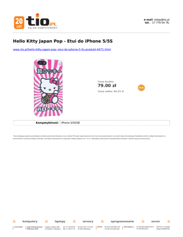 e-mail: [email protected] tel. : 17 770 04 76, Hello Kitty Japan Pop - Etui do iPhone 5/5S www.tio.pl/hello-kitty-japan-pop--etui-do-iphone-5-5s-produkt-6471.html Cena brutto: 79.00 zł Cena netto: 64.23 zł Kompatybilność: iPhone 5/5S/SE *Ceny obowiązują wyłącznie przy składaniu zamówień przez sklep internetowy. Ceny w salonie TiO media mogą nieznacznie różnić się od cen prezentowanych na stronach sklepu internetowego. Przedstawiona oferta w sklepie internetowym nie stanowi oferty w rozumieniu Kodeksu Cywilnego, i jest jedynie zaproszeniem do rozpoczęcia rokowań (zgodnie z art. 71 k.c.). Zastrzegamy sobie prawo do niezrealizowania zamówień z ważnych przyczyn ekonomicznych.