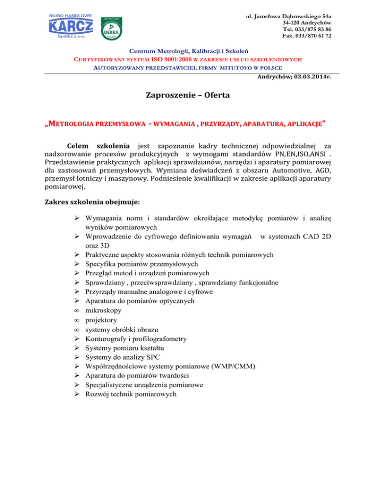 ul. Jarosława Dąbrowskiego 54a 34-120 Andrychów Tel. 033/875 83 86 Fax. 033/870 61 72 Centrum Metrologii, Kalibracji i Szkoleń CERTYFIKOWANY SYSTEM ISO 9001:2008 W ZAKRESIE USŁUG SZKOLENIOWYCH AUTORYZOWANY PRZEDSTAWICIEL FIRMY MITUTOYO W POLSCE Andrychów; 03.03.2014r. Zaproszenie – Oferta „METROLOGIA PRZEMYSŁOWA - WYMAGANIA , PRZYRZĄDY, APARATURA, APLIKACJE” Celem szkolenia jest zapoznanie kadry technicznej odpowiedzialnej za nadzorowanie procesów produkcyjnych z wymogami standardów PN,EN,ISO,ANSI . Przedstawienie praktycznych aplikacji sprawdzianów, narzędzi i aparatury pomiarowej dla zastosowań przemysłowych. Wymiana doświadczeń z obszaru Automotive, AGD, przemysł lotniczy i maszynowy. Podniesienie kwalifikacji w zakresie aplikacji aparatury pomiarowej. Zakres szkolenia obejmuje: Wymagania norm i standardów określające metodykę pomiarów i analizę wyników pomiarowych Wprowadzenie do cyfrowego definiowania wymagań w systemach CAD 2D oraz 3D Praktyczne aspekty stosowania różnych technik pomiarowych Specyfika pomiarów przemysłowych Przegląd metod i urządzeń pomiarowych Sprawdziany , przeciwsprawdziany , sprawdziany funkcjonalne Przyrządy manualne analogowe i cyfrowe Aparatura do pomiarów optycznych • mikroskopy • projektory • systemy obróbki obrazu Konturografy i profilografometry Systemy pomiaru kształtu Systemy do analizy SPC Współrzędnościowe systemy pomiarowe (WMP/CMM) Aparatura do pomiarów twardości Specjalistyczne urządzenia pomiarowe Rozwój technik pomiarowych ul. Jarosława Dąbrowskiego 54a 34-120 Andrychów Tel. 033/875 83 86 Fax. 033/870 61 72 Centrum Metrologii, Kalibracji i Szkoleń CERTYFIKOWANY SYSTEM ISO 9001:2008 W ZAKRESIE USŁUG SZKOLENIOWYCH AUTORYZOWANY PRZEDSTAWICIEL FIRMY MITUTOYO W POLSCE Szkolenie jest kierowane do kadry technicznej średniego szczebla, do inżynierów i techników, pracowników produkcji, działu technologicznego, działu przygotowania produkcji, działu jakości , działu konstrukcji i rozwoju. Kurs kończy się wręczeniem certyfikatów potwierdzających kompetencje w omawianym zakresie. Szkolenie poprowadzi mgr inż. metrolog, doświadczony specjalista z zakresu aplikacji systemów pomiarowych oraz dokumentacji technicznej . Członek Komitetu Technicznego PKN. Ceniony inżynier aplikacyjno - serwisowy i wykładowca. Czas trwania szkolenia: 2 dni (ok. 16 godzin) Termin: 26-27.05.2014r. Miejsce: Zakopane Grupa: max. 15 osób (decyduje kolejność zgłoszeń) Koszt szkolenia obejmuje: - przeprowadzenie szkolenia oraz indywidualne konsultacje z wykładowcą - materiały szkoleniowe w formie papierowej - imienny Certyfikat ukończenia szkolenia - pełne wyżywienie, serwis kawowy, kolacja integracyjna w Karczmie regionalnej - 1 nocleg (pokój jednoosobowy lub dwuosobowy) Istnieje możliwość rezerwacji noclegu w przeddzień szkolenia – dodatkowy koszt w wysokości 130 zł/os ! *) cena netto, do ceny należy doliczyć podatek VAT 23% Sprawy szkoleń prowadzi: Izabela Markowska tel. 606 977 648; Mateusz Cinal Tel. 033/875 83 86 e-mail: [email protected] ul. Jarosława Dąbrowskiego 54a 34-120 Andrychów Tel. 033/875 83 86 Fax. 033/870 61 72 e-mail: [email protected] Centrum Metrologii, Kalibracji i Szkoleń CERTYFIKOWANY SYSTEM ISO 9001:2008 W ZAKRESIE USŁUG SZKOLENIOWYCH AUTORYZOWANY PRZEDSTAWICIEL FIRMY MITUTOYO W POLSCE KARTA ZGŁOSZENIOWA Dotyczy szkolenia: Metrologia przemysłowa - wymagania , przyrządy, aparatura, aplikacje. Termin szkolenia: 26-27.05.2014. Miejsce szkolenia: Zakopane Dane niezbędne do wystawienia faktury (pełna nazwa i adres firmy) Numer NIP Imię i Nazwisko uczestnika 1. 2. 3. 4. Telefon e-mail Prosimy o dokonanie rezerwacji hotelu w terminie od ……............ do …………. dla ………. os. KOSZT NOCLEGU W PRZED DZIEŃ SZKOLENIA JEST DODATKOWO PŁATNY i wynosi 130 zł/os. Należność za udział: ……… osób x ……………. zł netto + 23% VAT= ……………………. zł przekażemy na Wasze konto gotówką/ przelewem* : Bank PEKAO S.A. oddział w Wadowicach 19 1240 4197 1111 0010 2982 1425 Warunki zgłoszenia: 1. Warunkiem uczestnictwa w szkoleniu jest przesłanie zgłoszenia na co najmniej 2 dni robocze przed terminem szkolenia na fax pod numer 033 870 61 72 lub e-mail [email protected] 2. Zgłoszenie traktujemy jako dowód zawarcia umowy. 3. Gdyby szkolenie nie odbyło się z powodu nie zebrania minimalnej grupy uczestników lub powodów niezależnych od organizatora, zgłaszającemu zostanie zaproponowany udział w szkoleniu w innym terminie. 4. Uczestnik może się wycofać z udziału w szkoleniu (w formie pisemnej), bez ponoszenia kosztów, w terminie 7 dni roboczych przed dniem rozpoczęcia szkolenia. Po upływie tego terminu zgłaszający zapłaci 50% kosztów uczestnictwa. 5. W przypadku nieobecności uczestnika / - ów na szkoleniu, bez uprzedniego pisemnego powiadomienia, zgłaszający zapłaci 75% kwoty uczestnictwa wynikającej ze zgłoszenia. 6. Przyjęcie Państwa zgłoszenia na szkolenie potwierdzimy pisemnie. Oświadczamy, że jesteśmy płatnikiem podatku VAT. ………………………………… (pieczęć firmy) ………………………………… (pieczęć i podpis zamawiającego)