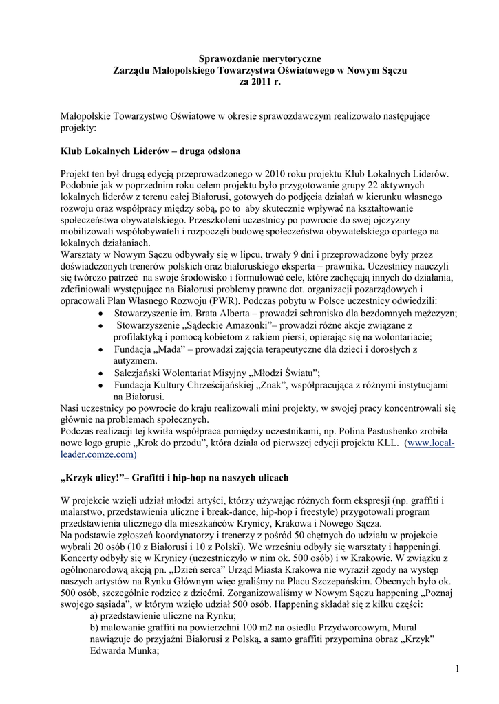 Sprawozdanie merytoryczne Zarządu Małopolskiego Towarzystwa Oświatowego w Nowym Sączu za 2011 r. Małopolskie Towarzystwo Oświatowe w okresie sprawozdawczym realizowało następujące projekty: Klub Lokalnych Liderów – druga odsłona Projekt ten był drugą edycją przeprowadzonego w 2010 roku projektu Klub Lokalnych Liderów. Podobnie jak w poprzednim roku celem projektu było przygotowanie grupy 22 aktywnych lokalnych liderów z terenu całej Białorusi, gotowych do podjęcia działań w kierunku własnego rozwoju oraz współpracy między sobą, po to aby skutecznie wpływać na kształtowanie społeczeństwa obywatelskiego. Przeszkoleni uczestnicy po powrocie do swej ojczyzny mobilizowali współobywateli i rozpoczęli budowę społeczeństwa obywatelskiego opartego na lokalnych działaniach. Warsztaty w Nowym Sączu odbywały się w lipcu, trwały 9 dni i przeprowadzone były przez doświadczonych trenerów polskich oraz białoruskiego eksperta – prawnika. Uczestnicy nauczyli się twórczo patrzeć na swoje środowisko i formułować cele, które zachęcają innych do działania, zdefiniowali występujące na Białorusi problemy prawne dot. organizacji pozarządowych i opracowali Plan Własnego Rozwoju (PWR). Podczas pobytu w Polsce uczestnicy odwiedzili: Stowarzyszenie im. Brata Alberta – prowadzi schronisko dla bezdomnych mężczyzn; Stowarzyszenie „Sądeckie Amazonki”– prowadzi różne akcje związane z profilaktyką i pomocą kobietom z rakiem piersi, opierając się na wolontariacie; Fundacja „Mada” – prowadzi zajęcia terapeutyczne dla dzieci i dorosłych z autyzmem. Salezjański Wolontariat Misyjny „Młodzi Światu”; Fundacja Kultury Chrześcijańskiej „Znak”, współpracująca z różnymi instytucjami na Białorusi. Nasi uczestnicy po powrocie do kraju realizowali mini projekty, w swojej pracy koncentrowali się głównie na problemach społecznych. Podczas realizacji tej kwitła współpraca pomiędzy uczestnikami, np. Polina Pastushenko zrobiła nowe logo grupie „Krok do przodu”, która działa od pierwszej edycji projektu KLL. (www.localleader.comze.com) „Krzyk ulicy!”– Grafitti i hip-hop na naszych ulicach W projekcie wzięli udział młodzi artyści, którzy używając różnych form ekspresji (np. graffiti i malarstwo, przedstawienia uliczne i break-dance, hip-hop i freestyle) przygotowali program przedstawienia ulicznego dla mieszkańców Krynicy, Krakowa i Nowego Sącza. Na podstawie zgłoszeń koordynatorzy i trenerzy z pośród 50 chętnych do udziału w projekcie wybrali 20 osób (10 z Białorusi i 10 z Polski). We wrześniu odbyły się warsztaty i happeningi. Koncerty odbyły się w Krynicy (uczestniczyło w nim ok. 500 osób) i w Krakowie. W związku z ogólnonarodową akcją pn. „Dzień serca” Urząd Miasta Krakowa nie wyraził zgody na występ naszych artystów na Rynku Głównym więc graliśmy na Placu Szczepańskim. Obecnych było ok. 500 osób, szczególnie rodzice z dziećmi. Zorganizowaliśmy w Nowym Sączu happening „Poznaj swojego sąsiada”, w którym wzięło udział 500 osób. Happening składał się z kilku części: a) przedstawienie uliczne na Rynku; b) malowanie graffiti na powierzchni 100 m2 na osiedlu Przydworcowym, Mural nawiązuje do przyjaźni Białorusi z Polską, a samo graffiti przypomina obraz „Krzyk” Edwarda Munka; 1 c) spotkanie integracyjne dla mieszkańców Nowego Sącza; d) taniec z ogniem – zespół Marcina Fornala. Dzięki przeprowadzonemu projektowi zwiększyliśmy poziom zrozumienia i tolerancji dla sztuki nowoczesnej wśród mieszkańców Nowego Sącza. Szczególnie pozytywne komentarze można usłyszeć i przeczytać w gazetach lokalnych na temat MURAL. Wszystkie nasze działania są umieszczone na stronie www.cries-of-the-street.info. Strona jest dwujęzyczna i jest na bieżąco aktualizowana. Uczestnicy byli bardzo zadowoleni i chcą się spotkać ponownie na koncertach na Białorusi. Pierwsze takie spotkanie jest wstępnie planowane wiosną 2012 r. Ewaluacja projektów edukacyjnych w oparciu o konkretne dane MTO zostało zaproszone przez Fundację Sorosa w Budapeszcie do udziału w międzynarodowym projekcie, którego celem było wypracowanie narzędzi do ewaluacji rezultatów inicjatyw edukacyjnych. Zdecydowaliśmy, że zaczniemy pracować na bazie programu Public Achievement (PA) – jednego z wielu programów wdrażanych przez MTO w licznych krajach Europy Płd.Wschodniej i Płd. Kaukazu. Na pierwszym spotkaniu w Budapeszcie, w styczniu 2011, uzasadniliśmy ten wybór oraz wybór czterech krajów, w których prowadzone będą badania. Zdecydowaliśmy się zrobić je w Polsce, Bułgarii, Mołdowie i Azerbejdżanie ze względu na różne tempo rozwoju programu w tych krajach, różne grupy społeczne nim uczestniczące i rozmaitość zarówno partnerów, jak i uczestników. W lutym zaprosiliśmy do Nowego Sącza koordynatorów programu PA w każdym z wybranych krajów i na 3.dniowym spotkaniu wspólnie opracowaliśmy metody badania, tzn. ankiety dla obecnych i byłych mentorów oraz dla obecnych i byłych członków grup PA. W marcu spotkałyśmy się z Azerami w Ganja i Mingachevir, czerwcu byłyśmy obecne na festiwalu PA w Kiszyniowie oraz rozmawiałyśmy z mentorami i członkami grup PA w Wodyniu (Bułgaria). W maju udało nam się zaangażować zewnętrznego eksperta, Wojtka Tworkowskiego, który przeanalizował dane zebrane w ankietach, opracował dodatkowe pytania dla grup fokusowych oraz sam przeprowadzał wywiady przez Skype z koordynatorami za granicą, a także osobiście z mentorami i członkami grup w Polsce. Pierwsze, niepełne jeszcze rezultaty zostały 6 maja przedstawione przez Alicję Derkowską na jednej z sesji ogromnej (3000 ludzi), międzynarodowej konferencji CIES w Montrealu. Seminarium podsumowujące projekt odbyło się w końcu lipca 2011 w Istambule. Zapoznanie się z materiałami wypracowanymi w trakcie projektu przez pozostałe 9 organi