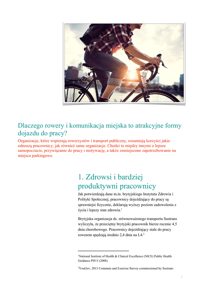 Dlaczego rowery i komunikacja miejska to atrakcyjne formy dojazdu do pracy? Organizacje, które wspierają rowerzystów i transport publiczny, rozumieją korzyści jakie odnoszą pracownicy, jak również same organizacje. Chodzi tu między innymi o lepsze samopoczucie, przywiązanie do pracy i motywację, a także zmniejszone zapotrzebowanie na miejsca parkingowe. 1. Zdrowsi i bardziej produktywni pracownicy Jak potwierdzają dane m.in. brytyjskiego Instytutu Zdrowia i Polityki Społecznej, pracownicy dojeżdżający do pracy są sprawniejsi fizycznie, deklarują wyższy poziom zadowolenia z życia i lepszy stan zdrowia.1 Brytyjska organizacja ds. zrównoważonego transportu Sustrans wyliczyła, że przeciętny brytyjski pracownik bierze rocznie 4,5 dnia chorobowego. Pracownicy dojeżdżający stale do pracy rowerem spędzają średnio 2,4 dnia na L4.2 1National Institute of Health & Clinical Excellence (NICE) Public Health Guidance PH13 (2008) 2YouGov, 2013 Commute and Exercise Survey commissioned by Sustrans 1 2. Obniżenie pozapłacowych kosztów pracy Pracodawcy wdrażający program “rowerem do biznesu” szacują średnie oszczędności dla organizacji na £ 25-80 miesięcznie na jedną osobę dojeżdżającą rowerem.3 Koncern GlaxoSmithKline oszacował oszczędność wynikającą z rezygnacji z jednego miejsca postojowego na ok £ 2000 rocznie.4 Podobne oszczędnośći wyliczyła londyńska spółka transportowa (Transport for London). Likwidacja jednego miejsca postojowego pozwala zaoszczędzić ok £ 2,000 rocznie.5 3. Mniej korków to silniejsza gospodarka Zatłoczenie w godzinach szczytu ma wpływ na gospodarkę. Według opracowań wykonanych na zlecenie rządu brytyjskiego korki kosztują gospodarkę Anglii ponad £ 10 mld rocznie. W samych obszarach miejskich Londynu koszt ten między rokiem 2009 a 2025 wyniesie ok £ 22 mld.6 Natomiast zgodnie z wyliczeniem australijskiego wicepremiera Anthony Albanese’a z 2013 roku – gospodarka zyskuje 21$ na każdej 20 minutowej podróży rowerem do pracy i z powrotem.7 3TfL 4 2008 Pool Bikes for Business Transport for London, Workplace cycle parking guidance (2006) 5Transport for London, Workplace cycle parking guidance (2006) 6 DfT 2006 The Eddington Transport Study The case for action: Sir Rod Eddington’s advice to Government wykorzystując metodologię z DfT’s appraisal guidance (WebTAG3.14.1), wykorzystując dane z National Travel Survey supplied by ONS 7Wyliczono 2 4. Rower jako element odpowiedzialności za środowisko (CSR) Łączny koszt emisji dwutlenku węgla dla samochodów osobowych w Wielkiej Brytanii każdego roku wynosi £ 3.98 mld.8 Tym samym jeśli wszystkie podróże Brytyjczyków odbywałyby się jedynie samochodem, to do atmosfery emitowane by było 883,904 ton CO2 (koszt £ 51,2 mld).9 5. Rower jako element wizerunku pracodawcy Pokolenie millenialsów (urodzonych po 1983 roku) to kategoria pracowników, która najmocniej docenia starania związane z przeciwdziałaniem zmianom klimatycznym. Ponadto jest to kategoria wiekowa, w której samochód przestaje być obiektem pożądania. Dla przykładu, w 1983 roku w Wielkiej Brytanii 82 procent młodych mężczyzn w wieku 16- 24 lata miało już prawo jazdy. Dziś odsetek ten wynosi zaledwie 64 procent.10 Millenialsi będą stanowić 75% siły roboczej już w 2025.11 Wielka Brytania wprowadziła rządowy program ulg podatkowych przy zakupie roweru. Cyclescheme (bo tak się ten program nazywa) jest częścią Planu Zielonego Transportu. Głównym celem jest promowanie roweru jako środka transportu służącego do dojazdów do pracy. Umożliwia on przekazanie pracownikowi roweru wraz z akcesoriami bezpieczeństwa, jako świadczenia wolnego od podatku. Technicznie rzecz biorąc, pracownicy wynajmują rower od swojego pracodawcy z możliwością wykupu pod koniec okresu rozliczeniowego.12 wykorzystując methodologię DfT’s appraisal guidance (WebTAG3.14.1), wykorzystując dane z National Travel Survey supplied by ONS 8Wyliczono 9Deloitte Millennial Survey 2014 10Deloitte Millennial Survey 2014 11Deloitte Millennial Survey 2014 12http://ibikekrakow.com/2013/05/13/rowerowa-ulga-podatkowa/ 3 Promocja dojazdów do pracy będzie stanowiła w przyszłości istotny element pozapłacowych form wynagradzania pracowników. Tworzy to rynek dla nowych produktów. Jednym z nich jest przygotowywana oferta programu motywacyjnego MultiBenefit. Firma ta przygotowuje system rozliczeń rowerowych dojazdów pracowników. Idea polega na rozliczaniu kilometrów przejechanych rowerem w formie zbliżonej do programów lojalnościowych. Pracownik za przejechane do pracy dystanse gromadzi punkty, które będzie mógł zrealizować w sklepie firmowym systemu MultiBenefit.13 13https://www.benefitsystems.pl/artykul/komunikaty-prasowe/pracodawca- funduje-dojazd-do-pracy-rowerem-czy-to-mozliwe 4