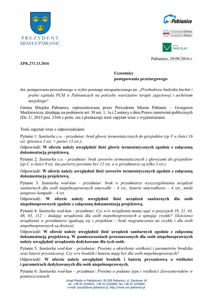 PREZYDENT MIASTA PABIANIC Pabianice, 29.09.2016 r. ZPK.271.13.2016 Uczestnicy postępowania przetargowego dot. postępowania prowadzonego w trybie przetargu nieograniczonego pn. „Przebudowa budynku kuchni i pralni szpitala PCM w Pabianicach na potrzeby warsztatów terapii zajęciowej i archiwum miejskiego” Gmina Miejska Pabianice, reprezentowana przez Prezydenta Miasta Pabianic – Grzegorza Mackiewicza, działając na podstawie art. 38 ust. 1, 1a i 2 ustawy z dnia Prawo zamówień publicznych (Dz. U. 2015 poz. 2164 z późn. zm.) przekazuje treść zapytań wraz z wyjaśnieniami. Treść zapytań wraz z odpowiedziami: Pytanie 1: Sanitarka c.o. - przedmiar: brak głowic termostatycznych do grzejników typ V w ilości 16 szt. (piwnica 3 szt. + parter 13 szt.); Odpowiedź: W ofercie należy uwzględnić ilość głowic termostatycznych zgodnie z załączoną dokumentacją projektową. Pytanie 2: Sanitarka c.o. - przedmiar: brak zaworów termostatycznych z głowicami do grzejników typ C w ilości 9 szt. (na parterze powinno być 12 szt, a w przedmiarze są tylko 3 szt.) Odpowiedź: W ofercie należy uwzględnić ilość zaworów termostatycznych zgodnie z załączoną dokumentacją projektową. Pytanie 3: Sanitarka wod-kan – przedmiar: brak w przedmiarze wyszczególnienia urządzeń sanitarnych dla osób niepełnosprawnych umywalki – 4 szt., baterie umywalkowe – 4 szt., miski ustępowe kompakt – 4 szt. Odpowiedź: W ofercie należy uwzględnić ilość urządzeń sanitarnych dla osób niepełnosprawnych zgodnie z załączoną dokumentacją projektową. Pytanie 4: Sanitarka wod-kan – przedmiar: Czy w/w urządzenia mamy ująć w pozycjach 19, 21, 44, 48, 65, 112 – dodając urządzenia dla osób niepełnosprawnych a ujmując zwykłe? (ilościowo urządzenia w przedmiarze zgadzają się z projektem – brak rozgraniczenia na zwykłe i dla osób niepełnosprawnych są droższe) Odpowiedź: W ofercie należy uwzględnić ilość urządzeń sanitarnych zgodnie z załączoną dokumentacją projektową. W pomieszczeniach przeznaczonych dla osób niepełnosprawnych należy uwzględnić urządzenia dedykowane dla tych osób. Pytanie 5: Sanitarka wod-kan – przedmiar: Prosimy o określenie wielkości i parametrów brodzika oraz baterii prysznicowej. Czy w/w brodzik i bateria mają być dla osób niepełnosprawnych? Odpowiedź: W ofercie należy uwzględnić brodzik i baterię prysznicową o wielkości i parametrach dedykowanych dla osób niepełnosprawnych. Pytanie 6: Sanitarka wod-kan – przedmiar: Prosimy o podanie typu i wielkości zlewozmywaków w pomieszczeniach: Urząd Miejski w Pabianicach, 95-200 Pabianice, ul. Zamkowa 16 tel. +48 42 2254615, +48 42 2254600, fax +48 42 2254669 e-mail: [email protected], http://www.um.pabianice.pl PREZYDENT MIASTA PABIANIC a) pom. Nr -1/7 socjalne – piwnica b) pom. Nr 0/20 socjale – parter c) pom. Nr 0/24 zmywalnia – parter d) pom. Nr 0/25 gospodarcze – parter Odpowiedź: W ofercie należy uwzględnić następujące typy i wielkości zlewozmywaków: a) pom. Nr -1/7 socjalne – piwnica: zlewozmywak jednokomorowy typowy bez ociekacza; b) pom. Nr 0/20 socjalne – parter: zlewozmywak jednokomorowy typowy bez ociekacza; c) pom. Nr 0/24 zmywalnia – parter: zlewozmywak 1,5-komorowy z ociekaczem d) pom. Nr 0/25 gospodarcze – parter: zlewozmywak jednokomorowy typowy bez ociekacza; Ponadto w pomieszczeniu nr 0/23 należy zastosować zlewozmywak 1,5-komorowy z ociekaczem. Pytanie 7: Sanitarka wod-kan – przedmiar: prosimy o podanie rodzaju i typu poidełka w ilości – 1 szt. Odpowiedź: W ofercie należy uwzględnić wykonanie podejścia wody do poidełka oraz demontaż i montaż istniejącego poidełka. Pytanie 8: Sanitarka wentylacja – przedmiar: Brak pozycji w przedmiarze na instalację klimatyzacji w pom. -1/11 archiwum zgodnie z projektem na rys. nr 1 są pokazane 2 szt. jednostki ścienne po 5,3 kW + rys. nr 3 jednostka zewnętrzna 12,3kW. Odpowiedź: W ofercie należy uwzględnić wszystkie elementy instalacji klimatyzacji w pom. 1/11 określone w dokumentacji projektowej. Pytanie 9: Prosimy o uzupełnienie przedmiaru o klimatyzację w archiwum Odpowiedź: Zamawiający nie uwzględni prośby. Zamawiający nie przewiduje możliwości modyfikacji przedmiarów gdyż wszystkie załączone do materiałów przetargowych przedmiary robót są jedynie elementem pomocniczym do sporządzenia oferty z wynagrodzeniem ryczałtowym. Pytanie 10: Czy w naszej kalkulacji mamy wycenić poręcze dla niepełnosprawnych w łazienkach? Odpowiedź: W ofercie należy uwzględnić poręcze dla niepełnosprawnych w łazienkach przeznaczonych dla osób niepełnosprawnych (pomieszczenia nr -1/9, 0/13, 0/16, 0/29). Jednocześnie Zamawiający informuje, iż w związku z powyższym opublikowany SIWZ pozostaje bez zmian. Zamawiający informuje również, iż odpowiedź na pytanie nr 9 należy traktować również jako informację uzupełniającą do odpowiedzi na pytania nr 1-8. Prezydenta Miasta Pabianic /-/Grzegorz Mackiewicz Urząd Miejski w Pabianicach, 95-200 Pabianice, ul. Zamkowa 16 tel. +48 42 2254615, +48 42 2254600, fax +48 42 2254669 e-mail: [email protected], http://www.um.pabianice.pl