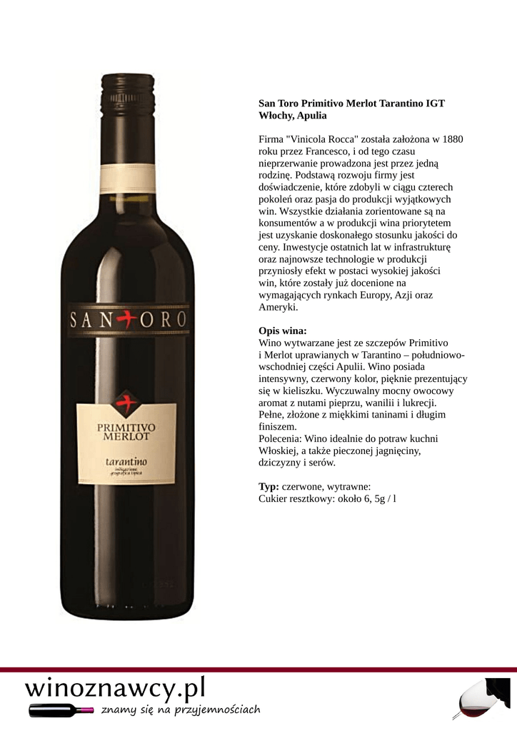 San Toro Primitivo Merlot Tarantino IGT Włochy, Apulia Firma "Vinicola Rocca" została założona w 1880 roku przez Francesco, i od tego czasu nieprzerwanie prowadzona jest przez jedną rodzinę. Podstawą rozwoju firmy jest doświadczenie, które zdobyli w ciągu czterech pokoleń oraz pasja do produkcji wyjątkowych win. Wszystkie działania zorientowane są na konsumentów a w produkcji wina priorytetem jest uzyskanie doskonałego stosunku jakości do ceny. Inwestycje ostatnich lat w infrastrukturę oraz najnowsze technologie w produkcji przyniosły efekt w postaci wysokiej jakości win, które zostały już docenione na wymagających rynkach Europy, Azji oraz Ameryki. Opis wina: Wino wytwarzane jest ze szczepów Primitivo i Merlot uprawianych w Tarantino – południowowschodniej części Apulii. Wino posiada intensywny, czerwony kolor, pięknie prezentujący się w kieliszku. Wyczuwalny mocny owocowy aromat z nutami pieprzu, wanilii i lukrecji. Pełne, złożone z miękkimi taninami i długim finiszem. Polecenia: Wino idealnie do potraw kuchni Włoskiej, a także pieczonej jagnięciny, dziczyzny i serów. Typ: czerwone, wytrawne: Cukier resztkowy: około 6, 5g / l
