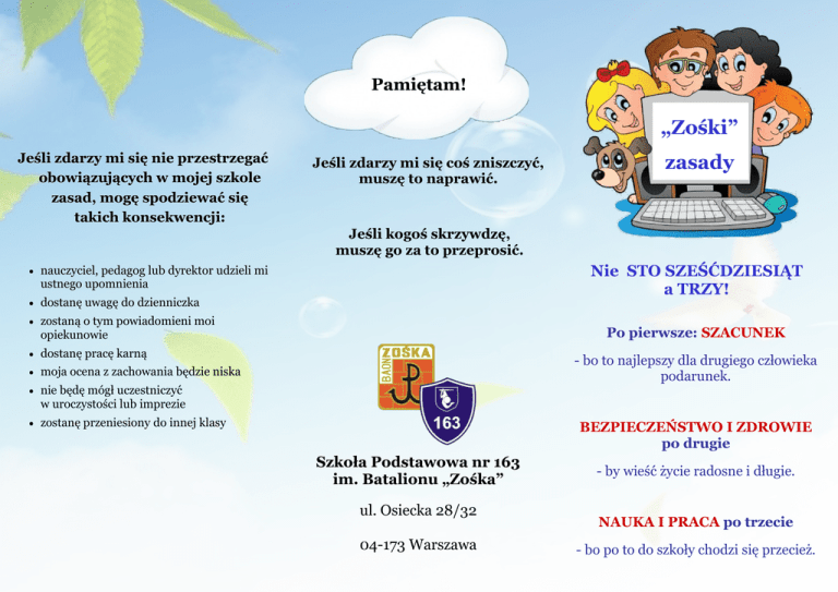 Pamiętam! „Zośki” Jeśli zdarzy mi się nie przestrzegać obowiązujących w mojej szkole zasad, mogę spodziewać się takich konsekwencji: Jeśli zdarzy mi się coś zniszczyć, muszę to naprawić. zasady Jeśli kogoś skrzywdzę, muszę go za to przeprosić. nauczyciel, pedagog lub dyrektor udzieli mi ustnego upomnienia dostanę uwagę do dzienniczka zostaną o tym powiadomieni moi opiekunowie dostanę pracę karną moja ocena z zachowania będzie niska nie będę mógł uczestniczyć w uroczystości lub imprezie zostanę przeniesiony do innej klasy Nie STO SZEŚĆDZIESIĄT a TRZY! Po pierwsze: SZACUNEK - bo to najlepszy dla drugiego człowieka podarunek. BEZPIECZEŃSTWO I ZDROWIE po drugie Szkoła Podstawowa nr 163 im. Batalionu „Zośka” ul. Osiecka 28/32 04-173 Warszawa - by wieść życie radosne i długie. NAUKA I PRACA po trzecie - bo po to do szkoły chodzi się przecież. NAUKA I PRACA po trzecie BEZPIECZEŃSTWO I ZDROWIE po drugie Po pierwsze: SZACUNEK Szanuję siebie i innych, więc: jestem życzliwy i tolerancyjny wyrażam własne zdanie, akceptując zdanie innych używam na co dzień zwrotów grzecznościowych, takich jak: DZIĘKUJĘ, PROSZĘ, PRZEPRASZAM dotrzymuję słowa i mówię prawdę nie przeklinam i nikogo nie obrażam nie pluję nie biorę bez pozwolenia nie swoich rzeczy zachowuję się stosownie do okoliczności Jestem uczniem i zależy mi aby wiedzieć i umieć jak najwięcej, więc: Dbam o zdrowie i bezpieczeństwo swoje oraz innych, więc: jestem ostrożny – nie przepycham się ani nie potrącam innych systematycznie i aktywnie uczestniczę w zajęciach nigdy nikogo nie biję przynoszę na lekcje potrzebne przybory w niebezpiecznych sytuacjach proszę o pomoc dorosłych jestem punktualny wykonuję swoje zadania najlepiej jak potrafię zawsze zostawiam po sobie porządek nie robię nic, co może grozić zdrowiu i bezpieczeństwu innych jeśli czegoś nie rozumiem, proszę o pomoc nauczyciela jeśli coś mi się nie udało, staram się to poprawić stosuję się do poleceń nauczycieli nie hałasuję współpracuję z kolegami dbam o higienę osobistą nie przeszkadzam podczas lekcji jeśli nie ma mnie w szkole, uzupełniam zaległości Jeśli będę pr obowiązują zestrzegać zasad cych w mo jej szkole: będę się cies zyć sympati ą i zaufaniem kolegów i do rosłych sprawię, że w mojej szkole przyjemniej b i bezpiecznie ędzie j uzyskam wy soką ocenę z zachowania