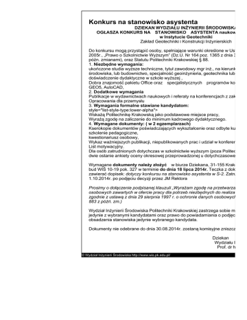 Konkurs na stanowisko asystenta DZIEKAN WYDZIAŁU INŻYNIERII ŚRODOWISKA OGŁASZA KONKURS NA STANOWISKO ASYSTENTA naukowo - dy w Instytucie Geotechniki Zakład Geotechniki i Konstrukcji Inżynierskich Do konkursu mogą przystąpić osoby, spełniające warunki określone w Ustawie z 2005r., „Prawo o Szkolnictwie Wyższym” (Dz.U. Nr 164 poz. 1365 z dnia 30.08.2 późn. zmianami), oraz Statutu Politechniki Krakowskiej § 88. 1. Niezbędne wymagania: ukończone studia wyższe techniczne, tytuł zawodowy mgr inż., na kierunku Inży środowiska, lub budownictwo, specjalność geoinżynieria, geotechnika lub pokre doświadczenie dydaktyczne w szkole wyższej , Dobra znajomość pakietu Office oraz specjalistycznych programów kompute GEO5, AutoCAD, 2. Dodatkowe wymagania Publikacje w wydawnictwach naukowych i referaty na konferencjach z zakresu g Opracowania dla przemysłu 3. Wymagania formalne stawiane kandydatom: style="list-style-type:lower-alpha"> Wskażą Politechnikę Krakowską jako podstawowe miejsce pracy, Wyrażą zgodę na zaliczenie do minimum kadrowego dydaktycznego. 4. Wymagane dokumenty: ( w 2 egzemplarzach) Kserokopie dokumentów poświadczających wykształcenie oraz odbyte kursy i s szkolenie pedagogiczne, kwestionariusz osobowy, Wykaz ważniejszych publikacji, niepublikowanych prac i udział w konferencjach List motywacyjny. Dla osób zatrudnionych dotychczas w szkolnictwie wyższym (poza Politechniką dwie ostanie ankiety oceny okresowej przeprowadzonej u dotychczasowego pra Wymagane dokumenty należy złożyć w biurze Dziekana, 31-155 Kraków ul. bud WIŚ 10-19 pok. 327 w terminie do dnia 18 lipca 2014r. Teczka z dokument zawierać dopisek: dotyczy konkursu na stanowisko asystenta w S-2. Zatrudnien 1.10.2014r. po podjęciu decyzji przez JM Rektora Prosimy o dołączenie podpisanej klauzuli „Wyrażam zgodę na przetwarzanie mo osobowych zawartych w ofercie pracy dla potrzeb niezbędnych do realizacji pro zgodnie z ustawą z dnia 29 sierpnia 1997 r. o ochronie danych osobowych (Dz. 883 z późń. zm.) Wydział Inżynierii Środowiska Politechniki Krakowskiej zastrzega sobie możliwo jedynie z wybranymi kandydatami oraz prawo do powiadamiania o podjęciu dec obsadzenia stanowiska jedynie wybranego kandydata. Dokumenty nie odebrane do dnia 30.08.2014r. zostaną komisyjne zniszczone. Dziekan Wydziału Inżynie Prof. dr hab. inż © Wydział Inżynierii Środowiska http://www.wis.pk.edu.pl/