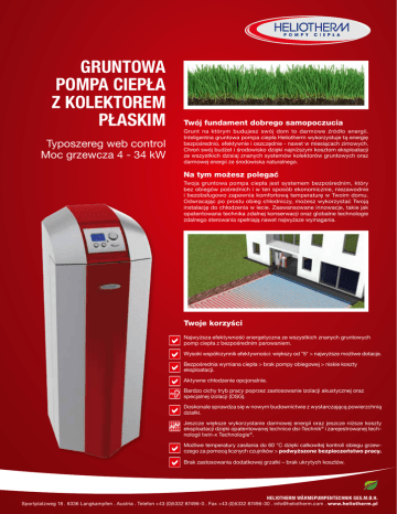GRUNTOWA POMPA CIEPŁA Z KOLEKTOREM PŁASKIM Typoszereg web control Moc grzewcza 4 - 34 kW Twój fundament dobrego samopoczucia Grunt na którym budujesz swój dom to darmowe źródło energii. Inteligentna gruntowa pompa ciepła Heliotherm wykorzystuje tą energię bezpośrednio, efektywnie i oszczędnie - nawet w miesiącach zimowych. Chroń swój budżet i środowisko dzięki najniższym kosztom eksploatacji ze wszystkich dzisiaj znanych systemów kolektorów gruntowych oraz darmowej energii ze środowiska naturalnego. Na tym możesz polegać Twoja gruntowa pompa ciepła jest systemem bezpośrednim, który bez obiegów pośrednich i w ten sposób ekonomicznie, niezawodnie i bezobsługowo zapewnia komfortową temperaturę w Twoim domu. Odwracając po prostu obieg chłodniczy, możesz wykorzystać Twoją instalację do chłodzenia w lecie. Zaawansowane innowacje, takie jak opatentowana technika zdalnej konserwacji oraz globalne technologie zdalnego sterowania spełniają nawet najwyższe wymagania. Twoje korzyści Najwyższa efektywność energetyczna ze wszystkich znanych gruntowych pomp ciepła z bezpośrednim parowaniem. Wysoki współczynnik efektywności: większy od "5" > najwyższe możliwe dotacje. Bezpośrednia wymiana ciepła > brak pompy obiegowej > niskie koszty eksploatacji. Aktywne chłodzenie opcjonalnie. Bardzo cichy tryb pracy poprzez zastosowanie izolacji akustycznej oraz specjalnej izolacji (DSG). Doskonale sprawdza się w nowym budownictwie z wystarczającą powierzchnią działki. Jeszcze większe wykorzystanie darmowej energii oraz jeszcze niższe koszty eksploatacji dzięki opatentowanej technice dsi-Technik® i zarejestrowanej technologii twin-x Technologie®. Możliwe temperatury zasilania do 60 °C dzięki całkowitej kontroli obiegu grzewczego za pomocą licznych czujników > podwyższone bezpieczeństwo pracy. Brak zastosowania dodatkowej grzałki – brak ukrytych kosztów. HELIOTHERM WÄRMEPUMPENTECHNIK GES.M.B.H. Sportplatzweg 18 . 6336 Langkampfen . Austria . Telefon +43 (0)5332 87496-0 . Fax +43 (0)5332 87496-30 . [email protected] . www.heliotherm.pl TABELA MOCY GRZEWCZYCH – GRUNTOWA POMPA CIEPŁA Z KOLEKTOREM PŁASKIM, TYPOSZEREG WEB CONTROL HP05EWEB HP07EWEB HP08EWEB HP10EWEB E4W35 wg EN255 / ∆ 10 K Moc grzewcza [kW] 6,71 7,94 9,58 12,60 COP 5,76 5,80 5,77 E4W35 wg EN15879-1 / ∆ 5 K Moc grzewcza [kW] 6,55 7,75 COP 5,46 5,50 138 × 46 × 52 138 × 46 × 52 Pompa ciepła Heliotherm – Typ HP16EWEB HP20EWEB HP28EWEB 16,05 20,13 25,59 34,37 5,79 5,77 5,77 5,62 5,58 9,35 12,30 15,67 19,65 24,99 33,57 5,47 5,48 5,47 5,47 5,33 5,29 138 × 46 × 52 138 × 46 × 52 138 × 46 × 52 138 × 46 × 52 138 × 55 × 62 138 × 55 × 62 Maks. temperatura zasilania Wymiary w cm (wys. × szer. × głęb.) HP12EWEB 60 °C* * zależnie od kompresora TABELA MOCY GRZEWCZYCH – GRUNTOWA POMPA CIEPŁA Z KOLEKTOREM PŁASKIM I MODULACJĄ, TYPOSZEREG WEB CONTROL Technika modulacji HP08EHP12EHP20EPompa ciepła Heliotherm – Typ M-WEB M-WEB M-WEB Heliotherm** Maks. temperatura zasilania 60 °C* E4W35 wg EN255 / ∆ 10 K Moc grzewcza [kW] 14,5 - 4,1 18,5 - 6,1 22,9 - 8,2 COP 5,66 - 5,85 5,72 - 5,95 5,68 - 5,98 E4W35 wg EN15879-1 / ∆ 5 K Moc grzewcza [kW] 14,2 - 4,0 18,1 - 6,0 22,4 - 8,0 COP Wymiary w cm (wys. × szer. × głęb.) 5,37 - 5,54 5,42 - 5,64 5,38 - 5,67 138 ×46 × 52 138 × 46 × 52 138 × 46 × 52 - - - Inteligentniej, oszczędniej i elastyczniej. Do 25 % wyższa efektywność instalacji & mniejsze wydzielanie CO2 niż w przypadku zwykłych pomp ciepła. Długa żywotność poprzez łagodny rozruch. Elastyczne wykorzystanie instalacji. Niewykorzystane pomieszczenia mogą zostać po prostu wykluczone z ogrzewania. ** opcjonalnie Płynna modulacja. Dopasuj moc grzewczą do zapotrzebowania budynku. Zróżnicowane temperatury zewnętrzne wymagają indywidualnych ustawień grzewczych. Poprzez inteligentną technikę sterowania oraz kompresor modulacyjny w Twojej instalacji Heliotherm pobierana jest tylko taka ilość prądu, jaka jest potrzebna do pozyskania ciepła. W ten sposób Twoje koszty grzewcze automatycznie pozostają zoptymalizowane przez cały rok. Wzorowa efektywność. Instalacje Heliotherm odznaczone są najwyższą klasą efektywności energetycznej. Międzynarodowy znak jakości potwierdzający sprawdzoną jakość oraz liczne patenty firmy Heliotherm potwierdzają, że tyrolski producent pomp ciepła wzorowo spełnia wymagania w zakresie efektywności. Najniższe koszty eksploatacji oraz najlepsza ochrona środowiska to w tym przypadku sprawy oczywiste. Wykorzystać najwyższe dotacje. European Quality Label for Heat Pumps check the validity of this label at www.ehpa.org/QL Partner Heliotherm. Twoja gwarancja pierwszorzędności. Zaoferować wszystko z jednego źródła i w jednym miejscu to filozofia serwisu Heliotherm. Doradztwo, planowanie, montaż, uruchomienie oraz serwis wykonywany jest wyłącznie przez wybranych i przeszkolonych Partnerów Heliotherm. W ten sposób gwarantujemy najlepsze osiągnięcia dla najlepszych produktów. Zdalna konserwacja dla globalnego sterowania przez Internet lub telefon komórkowy poprzez Heliotherm web control®. Optymalizacja obiegu chłodzenia twin-x Poprzez zastosowanie zarejestrowanej techniki Heliotherm twin-x-Technik® używana jest dodatkowa darmowa energia z natury do ogrzewania. Elektroniczna regulacja czynnika roboczego Poprzez opatentowaną technikę Heliotherm DSI-Technik® – możliwe jest automatyczne dopasowanie do zmienionych warunków trybu pracy i obniżenie w znaczny sposób kosztów eksploatacji! Twój Partner Heliotherm. Zastrzeżone prawo do zmian technicznych oraz błedów . Stan na dzień 15.11.2011. Ze względu na wysokie współczynniki efektywności możliwe jest wykorzystanie najwyższych dotacji państwowych. Twój Partner Heliotherm chętnie udzieli informacji na temat indywidualnych możliwości uzyskania dotacji w Twoim regionie.