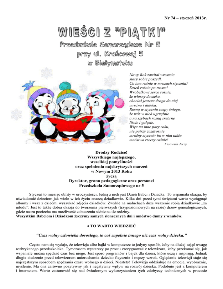 Nr 74 – styczeń 2013r. Nowy Rok zawitał wreszcie stary sobie poszedł. Co tam rośnie w mrozach stycznia? Dzień rośnie po trosze! Wróbelkowi serce rośnie, że wiosny doczeka, chociaż jeszcze droga do niej mroźna i daleka. Rosną w styczniu zaspy śniegu, że wóz w nich ugrzęźnie a na szybach rosną srebrne liście i gałęzie. Więc na inne pory roku, nie patrzy zazdrośnie mroźny styczeń: bo w nim także mnóstwo rzeczy rośnie! Ficowski Jerzy Drodzy Rodzice! Wszystkiego najlepszego, wszelkiej pomyślności oraz spełnienia najskrytszych marzeń w Nowym 2013 Roku życzą Dyrektor, grono pedagogiczne oraz personel Przedszkola Samorządowego nr 5 Styczeń to miesiąc obfity w uroczystości. Jedną z nich jest Dzień Babci i Dziadka. To wspaniała okazja, by uświadomić dzieciom jak wiele w ich życiu znaczą dziadkowie. Kilka dni przed tymi świętami warto wyciągnąć albumy i wraz z dziećmi wyszukać zdjęcia dziadków. Zwykle na maluchach duże wrażenie robią dziadkowie „za młodu”. Jest to także dobra okazja do tworzenia pierwszych (trzypoziomowych na razie) drzew genealogicznych, gdzie nasza pociecha ma możliwość zobaczenia siebie na tle rodziny. Wszystkim Babciom i Dziadkom życzymy samych słonecznych dni i mnóstwo dumy z wnuków. ♦ TO WARTO WIEDZIEĆ "Czas wolny człowieka dorosłego, to coś zupełnie innego niż czas wolny dziecka." Często nam się wydaje, że telewizja albo bajki w komputerze to jedyny sposób, żeby na dłużej zająć uwagę rozbrykanego przedszkolaka. Tymczasem wystarczy po prostu zrezygnować z telewizora, żeby przekonać się, jak wspaniale można spędzać czas bez niego. Jest sporo programów i bajek dla dzieci, które uczą i inspirują. Jednak długie siedzenie przed telewizorem unieruchamia dziecko fizycznie i męczy wzrok. Oglądanie telewizji staje się najczęstszym sposobem spędzania czasu wolnego u dzieci. Niestety! Telewizja oddziałuje na emocje, wyobraźnię, myślenie. Ma ona zarówno pozytywny jak i negatywny wpływ na rozwój dziecka. Podobnie jest z komputerem i internetem. Warto zastanowić się nad świadomym wykorzystaniem tych zdobyczy technicznych w procesie wychowania dzieci. Przed ekranem maluch zastyga, a my możemy zająć się obowiązkami. Ale przecież jest masa innych zajęć, które wciągną dziecko. Prace domowe Zmywanie, sprzątanie, pranie, gotowanie - mogą stać się przygodą. Zmywając naczynia, możecie postawić na stole lub blacie miskę z wodą, w której maluch umyje zabawkowy serwis albo łyżki. Pakując naczynia do zmywarki, pozwólcie dziecku włożyć te mniej zabrudzone. Przy segregowaniu sztućców maluch naprawdę może pomóc. Możecie razem wkładać ubrania do pralki i rozwieszać te wyprane. W kuchni pozwólcie mu mieszać sałatkę lub gnieść ciasto. Zajęcia plastyczne Dzieciom nie trzeba długo tłumaczyć, do czego służą kredki. Pokażcie dziecku różne techniki - pozwólcie rysować pastelami i malować farbami. Za każdym razem wprowadzajcie do zabaw plastycznych nowy element. Możecie wykorzystać przeczytane czasopisma i pozwolić dziecku z nich wycinać postaci i przedmioty, a później przykleić je na kartkę, tworząc kolaż. Może dziecku spodoba się malowanie palcami za pomocą specjalnych farb? Lepienie z plasteliny albo masy solnej? Wasze propozycje muszą być dostosowane do wieku dziecka - oczekując zbyt wiele, możecie je łatwo zniechęcić. Kolorowanki i naklejanki Ćwiczą precyzję i na długo zajmują uwagę. Zamiast kupować gotowe kolorowanki, możemy sami narysować dziecku na kartce kontury. Zeszyty z naklejkami działają na zasadzie prostych układanek - dziecko musi odnaleźć miejsce, na które może przykleić naklejkę. Układanki i puzzle Rozłożone na stole nie pozwalają od niego odejść. Możecie zacząć od najprostszych, drewnianych układanek z uchwytami przy elementach. Puzzle łatwo zrobicie sami, tnąc na części pocztówki. Dzieciom, które ciężko oderwać od bajki w telewizji, zaproponujcie układanki z bohaterami bajek. Przebieranki Starsze przedszkolaki uwielbiają się przebierać. Wyjmijcie z szafy letnie sukienki, kapelusze, szale, wachlarze i błyskotki. Zróbcie papierową koronę i czarodziejską różdżkę. A może zaprosicie do zabawy więcej dzieci? Teatrzyk Zatrudnijcie w nim aktorów - lalki, misie. Muszą być dekoracje, kurtyna, bilety, miejsca dla publiczności i dzwonki. Nawet najbardziej leniwi znajdą zajęcie jako widzowie. Dziecko zachęcone zabawą z wami wkrótce zacznie samo organizować przedstawienia. Budowle Do ich stworzenia można wykorzystać nie tylko klocki. Gdy na plac budowy wjeżdża stół, krzesła, taborety kuchenne, koce i poduszki, jest trochę zamieszania, lecz zabawa może potrwać parę godzin. Pierwszy ogród Możecie nasypać do skrzynek lub doniczek ziemię i posadzić kwiaty oraz zioła. Wkładanie do ziemi nasionek, zasypywanie ich, podlewanie i oczekiwanie na pierwsze zielone listki będzie dla przedszkolaka ważnym przeżyciem. Pozwólcie mu doglądać roślin i podlewać je lekką konewką. To świetna lekcja przyrody i... odpowiedzialności. Gry planszowe i wyścigi Ta zabawa to przyjemność dla całej rodziny. Najlepsze są wszelkiego rodzaju wyścigi skonstruowane na zasadzie chińczyka. Możecie także zorganizować zwykłe wyścigi samochodowe, wystarczy stromy zjazd zrobiony z kawałka tektury albo tor z klocków. Zabawy z wodą Nalewanie, wylewanie, kąpiel lalek - każde dziecko to lubi. Możecie nalać wodę do wielkiej miednicy i ustawić ją w pokoju, najlepiej na dużych ręcznikach. Ubierzcie dziecko w luźną koszulkę, a jeśli jest upał, możecie pozwolić mu się bawić w samej bieliźnie. Muzyka i taniec Większość dzieci przepada za muzyką, uwielbia wspólne śpiewanie i taniec. Przesłuchajcie razem płytę z piosenkami dla przedszkolaków albo zaproponujcie maluchowi swoją ulubioną płytę i pokażcie jak wspaniale można się przy