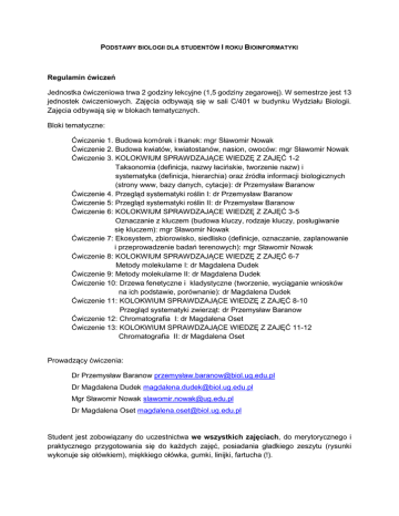 PODSTAWY BIOLOGII DLA STUDENTÓW I ROKU BIOINFORMATYKI Regulamin ćwiczeń Jednostka ćwiczeniowa trwa 2 godziny lekcyjne (1,5 godziny zegarowej). W semestrze jest 13 jednostek ćwiczeniowych. Zajęcia odbywają się w sali C/401 w budynku Wydziału Biologii. Zajęcia odbywają się w blokach tematycznych. Bloki tematyczne: Ćwiczenie 1. Budowa komórek i tkanek: mgr Sławomir Nowak Ćwiczenie 2. Budowa kwiatów, kwiatostanów, nasion, owoców: mgr Sławomir Nowak Ćwiczenie 3. KOLOKWIUM SPRAWDZAJĄCE WIEDZĘ Z ZAJĘĆ 1-2 Taksonomia (definicja, nazwy łacińskie, tworzenie nazw) i systematyka (definicja, hierarchia) oraz źródła informacji biologicznych (strony www, bazy danych, cytacje): dr Przemysław Baranow Ćwiczenie 4. Przegląd systematyki roślin I: dr Przemysław Baranow Ćwiczenie 5: Przegląd systematyki roślin II: dr Przemysław Baranow Ćwiczenie 6: KOLOKWIUM SPRAWDZAJĄCE WIEDZĘ Z ZAJĘĆ 3-5 Oznaczanie z kluczem (budowa kluczy, rodzaje kluczy, posługiwanie się kluczem): mgr Sławomir Nowak Ćwiczenie 7: Ekosystem, zbiorowisko, siedlisko (definicje, oznaczanie, zaplanowanie i przeprowadzenie badań terenowych): mgr Sławomir Nowak Ćwiczenie 8: KOLOKWIUM SPRAWDZAJĄCE WIEDZĘ Z ZAJĘĆ 6-7 Metody molekularne I: dr Magdalena Dudek Ćwiczenie 9: Metody molekularne II: dr Magdalena Dudek Ćwiczenie 10: Drzewa fenetyczne i kladystyczne (tworzenie, wyciąganie wniosków na ich podstawie, porównanie): dr Magdalena Dudek Ćwiczenie 11: KOLOKWIUM SPRAWDZAJĄCE WIEDZĘ Z ZAJĘĆ 8-10 Przegląd systematyki zwierząt: dr Przemysław Baranow Ćwiczenie 12: Chromatografia I: dr Magdalena Oset Ćwiczenie 13: KOLOKWIUM SPRAWDZAJĄCE WIEDZĘ Z ZAJĘĆ 11-12 Chromatografia II: dr Magdalena Oset Prowadzący ćwiczenia: Dr Przemysław Baranow przemysł[email protected] Dr Magdalena Dudek [email protected] Mgr Sławomir Nowak [email protected] Dr Magdalena Oset [email protected] Student jest zobowiązany do uczestnictwa we wszystkich zajęciach, do merytorycznego i praktycznego przygotowania się do każdych zajęć, posiadania gładkiego zeszytu (rysunki wykonuje się ołówkiem), miękkiego ołówka, gumki, linijki, fartucha (!). Każdy student ma obowiązek uczęszczać do przypisanej mu grupy ćwiczeniowej. O zaliczeniu poszczególnych ćwiczeń przez studenta decyduje Prowadzący dane zajęcia. Po zakończeniu każdych ćwiczeń Prowadzący na podstawie obserwacji poprawności pracy studenta, jego aktywności (udział w dyskusjach, stopień samodzielności w wykonywaniu poleceń Prowadzącego) dokonuje pisemnego zaliczenia ćwiczeń w zeszycie studenta. Niezaliczenie pojedynczych zajęć - ćwiczeń skutkuje oceną niedostateczną. Przed opuszczeniem sali ćwiczeniowej student ma obowiązek posprzątać swoje miejsce pracy: odłożyć preparaty i igły preparacyjne, umyć szalki, szkiełka, sprzęt laboratoryjny, wyłączyć i przykryć mikroskop/binokular. Łącznie w semestrze odbędą się 5 sprawdzianów – „kolokwia”. Student musi napisać wszystkie 5 kolokwia i zaliczyć je wg regulaminu Uniwersytetu Gdańskiego - na najmniej 50%. Student ma prawo do poprawy jeden raz każdego z kolokwiów. Poprawie ulegają tylko oceny niedostateczne. Student ma prawo poprawić kolokwium w terminie jednego tygodnia od ogłoszenia wyników. Zaliczenie całości ćwiczeń odbywa się na podstawie obecności na zajęciach, poprawnego wykonywania zajęć, aktywności oraz ocen z kolokwiów. Oceny (wystawiane na ostatnich ćwiczeniach) są obliczane zgodnie z Regulaminem Studiów Uniwersytetu Gdańskiego: 91 % i więcej - bardzo dobry 81 – 90 % - dobry + 71 – 80 % - dobry 61 – 70 % - dostateczny + 51 – 60 % - dostateczny 50 % i mniej - niedostateczny (= zaliczenie materiału z ćwiczeń z całego semestru). W przypadku, gdy któreś z ćwiczeń nie odbędą się z przyczyn obiektywnych, maksymalna liczba punktów zmienia się i jest wyliczana indywidualnie dla danej grupy. Wykład Prowadzący wykład: Dr Marta Kras [email protected] Koordynatorem kursu (osoba, którą należy wpisać do indeksu w rubryce „prowadzący”) jest dr Marta Kras. Egzaminy Egzamin obejmuje materiał z wykładu. termin I – egzamin pisemny testowy, termin II – egzamin ustny (w przypadku małej liczby zdających) lub pisemny (w przypadku większej liczby zdających). Literatura: Alberts B. 1999. Podstawy Biologii Komórki. PWN, Warszawa. Allison L. 2002. Podstawy biologii molekularnej. Wydawnictwa UW, Warszawa. Berg J., Tymoczko J., Streyer L. 2007. Biochemia. PWN, Warszawa. Czarnota P. 2009. Symbiozy porostowe w świetle interakcji pomiędzy grzybami i fotobiontami. Kosmos 58: 229–248. Dzik J. 2008. Dzieje życia na Ziemi. PWN, Warszawa. Faliński J. 2001. Przewodnik do długoterminowych badań ekologicznych. PWN, Warszawa. Futuyama D. 2008. Ewolucja. Wydawnictwa Uniwersytetu Warszawskiego, Warszawa. Guzow-Krzemińska B., Kukwa M. 2013. Metody badawcze we współczesnej taksonomii porostów. Kosmos 62: 92-103. Hall B.G. 2008. Łatwe drzewa filogenetyczne. Przewodnik użytkownika. Wydawnictwa UW, Warszawa. Jurd R.D. 2006. Biologia zwierząt. Krótkie wykłady. PWN, Warszawa. Krebs Ch. 2011. Ekologia. PWN, Warszawa. Kubiak D., Kukwa M. 2011. Chromatografia cienkowarstwowa (TLC) w lichenologii. W: Dynowska M., Ejdys E. Mikologia laboratoryjna. Przygotowanie materiału badawczego i diagnostyka. Wydawnictwo UWM, Olsztyn. Mackenzie A., Ball A.S., Virdee S.R. 2007. Ekologia. Krótkie wykłady. PWN, Warszawa. Matwiejuk A. 2008. Porosty i ich właściwości lecznicze. Kosmos 57: 85-91. Matuszkiewicz W. 2005. Przewodnik do oznaczania zbiorowisk roślinnych. PWN, Warszawa. Nash III T.H. 2008. Lichen Biology. Second Edition. Cambridge University Press, Cambridge. Nowak J., Tobolewski Z. 1975. Porosty polskie. PWN, Warszawa-Kraków. Orange A., James P. W., White F. J. 2001. Microchemical methods for the identification of lichens. British Lichen Society, London. Purvis O. W. 2000. Lichens. The Natural History Muse