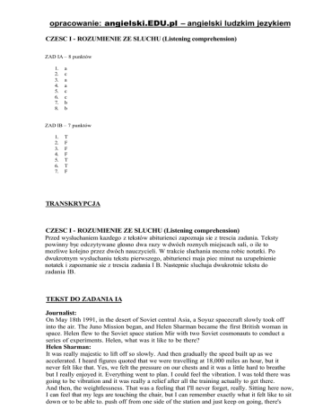 opracowanie: angielski.EDU.pl – angielski ludzkim jezykiem CZESC I - ROZUMIENIE ZE SLUCHU (Listening comprehension) ZAD IA – 8 punktów 1. 2. 3. 4. 5. 6. 7. 8. a c a a c c b b ZAD IB – 7 punktów 1. 2. 3. 4. 5. 6. 7. T F F F T T F TRANSKRYPCJA CZESC I - ROZUMIENIE ZE SLUCHU (Listening comprehension) Przed wysluchaniem kazdego z tekstów abiturienci zapoznaja sie z trescia zadania. Teksty powinny byc odczytywane glosno dwa razy w dwóch roznych miejscach sali, o ile to mozliwe kolejno przez dwóch nauczycieli. W trakcie sluchania mozna robic notatki. Po dwukrotnym wysluchaniu tekstu pierwszego, abiturienci maja piec minut na uzupelnienie notatek i zapoznanie sie z trescia zadania I B. Nastepnie sluchaja dwukrotnie tekstu do zadania IB. TEKST DO ZADANIA IA Journalist: On May 18th 1991, in the desert of Soviet central Asia, a Soyuz spacecraft slowly took off into the air. The Juno Mission began, and Helen Sharman became the first British woman in space. Helen flew to the Soviet space station Mir with two Soviet cosmonauts to conduct a series of experiments. Helen, what was it like to be there? Helen Sharman: It was really majestic to lift off so slowly. And then gradually the speed built up as we accelerated. I heard figures quoted that we were travelling at 18,000 miles an hour, but it never felt like that. Yes, we felt the pressure on our chests and it was a little hard to breathe but I really enjoyed it. Everything went to plan. I could feel the vibration. I was told there was going to be vibration and it was really a relief after all the training actually to get there. And then, the weightlessness. That was a feeling that I'll never forget, really. Sitting here now, I can feel that my legs are touching the chair, but I can remember exactly what it felt like to sit down or to be able to. push off from one side of the station and just keep on going, there's opracowanie: angielski.EDU.pl – angielski ludzkim jezykiem nothing to stop you from going. It's like swimming but without the resistance of the water. The first time I actually was able to see the Earth was only 165 seconds after launch, when the atmosphere shroud blew off. I could then see the Pacific Ocean. I was surprised how large the Earth seemed. People before who'd flown into space have described it as being very small, but we were only about 200 miles above the surface of the Earth, about 350 kilometres. I couldn't see the outlines of continents, but I could see coast lines. I could see islands, I could see rivers. And I think what surprised me most of all was the way that I could see where man actually lived on Earth by the straight lines, straight roads, edges to fields - that really sort of stood out, where we actually live on Earth. The stars were very bright. And, of course when we look into .space from Earth we see everything through our own atmosphere, so the stars were not only bright but I could see so many of them. It made me realise how deep space was. The stairs really did seem to go on forever. Journalist: At the time of the Juno Mission, there had been more than 240 people in space, though only four of them were women. Is there any difference between men and women, in their ability to be astronauts? Helen Sharman: There was never any doubt that I was able to continue and fulfil the scientific programme I was scheduled for. I certainly had no difficulties and the Soviets said that I coped with the things that I had to do often better than a lot of the men that they had seen in space. No, there's no difference whatsoever. I have been described as a 'space-woman' instead of the more conventional name 'spaceman'. I would prefer the word 'space person' because I feel that there is really no difference between how men and women work. But I hope this may encourage women to take on things. There is a social pressure I think still in Britain, for girls not to go in for science and engineering and that's sad because girls are just as good as boys. In many cases, when I was initially applying for jobs, I had to be better than my male colleagues, not just as good as them. I think that goes not just for me but for many women who are working in a man's world. It's something that really we just have to deal with to the best of our abilities. from Women Today BBC English by A.Bamfather & C.Addis TEKST DO ZADANIA IB How do they charm snakes? Charming snakes may be totally alien or even horrific to Westerners, but it's an ancient and venerated tradition in India, dating from the third century B.C., and in Egypt, where mention of it appears in the early Book of the Dead. In India, the 'snakers', as they like to be called, regard themselves as a distinct caste, with spiritual beliefs integrally bound up with the snakes. They begin their training at the age of five or six, learning to handle snakes and to develop snake charming as an art, a way of life, and, most important of all, the means of carrying on the sacred traditions of their forefathers. Adult snakers - all of them male - have no other source of livelihood. They plan their performances to have as much impact as possible on the audience, and, obviously, the donations tend to be larger when the danger seems considerable. The favourite snake to use is the cobra, famous for its dramatic arched position. The image passed down to us is of a man 'charming' a snake with his flute and causing it to rise out of its basket. But snakes don't have ears, and the cobra actually doesn't hear the flute at all. The snaker lures the snake, or rather threatens it sufficiently to make it rise up in a wary position, not with music but physical gestures. He may splatter cold water on the snake to alarm it and opracowanie: angielski.EDU.pl – angielski ludzkim jezykiem then blow his flute near enough so that the air rushes annoyingly over the snake's back. The trick is to keep the snake interested enough to remain arched, yet not anger it so much that it strikes or runs away. The snaker m