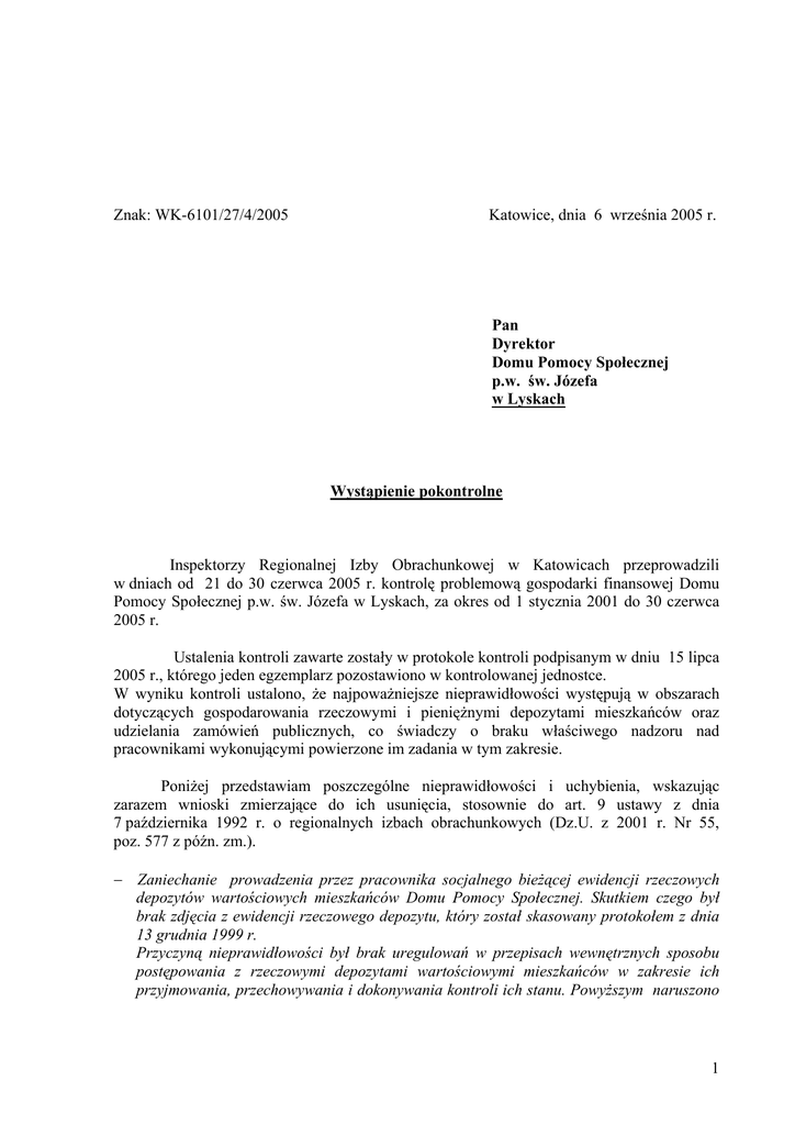 Znak: WK-6101/27/4/2005 Katowice, dnia 6 września 2005 r. Pan Dyrektor Domu Pomocy Społecznej p.w. św. Józefa w Lyskach Wystąpienie pokontrolne Inspektorzy Regionalnej Izby Obrachunkowej w Katowicach przeprowadzili w dniach od 21 do 30 czerwca 2005 r. kontrolę problemową gospodarki finansowej Domu Pomocy Społecznej p.w. św. Józefa w Lyskach, za okres od 1 stycznia 2001 do 30 czerwca 2005 r. Ustalenia kontroli zawarte zostały w protokole kontroli podpisanym w dniu 15 lipca 2005 r., którego jeden egzemplarz pozostawiono w kontrolowanej jednostce. W wyniku kontroli ustalono, Ŝe najpowaŜniejsze nieprawidłowości występują w obszarach dotyczących gospodarowania rzeczowymi i pienięŜnymi depozytami mieszkańców oraz udzielania zamówień publicznych, co świadczy o braku właściwego nadzoru nad pracownikami wykonującymi powierzone im zadania w tym zakresie. PoniŜej przedstawiam poszczególne nieprawidłowości i uchybienia, wskazując zarazem wnioski zmierzające do ich usunięcia, stosownie do art. 9 ustawy z dnia 7 października 1992 r. o regionalnych izbach obrachunkowych (Dz.U. z 2001 r. Nr 55, poz. 577 z późn. zm.). − Zaniechanie prowadzenia przez pracownika socjalnego bieŜącej ewidencji rzeczowych depozytów wartościowych mieszkańców Domu Pomocy Społecznej. Skutkiem czego był brak zdjęcia z ewidencji rzeczowego depozytu, który został skasowany protokołem z dnia 13 grudnia 1999 r. Przyczyną nieprawidłowości był brak uregulowań w przepisach wewnętrznych sposobu postępowania z rzeczowymi depozytami wartościowymi mieszkańców w zakresie ich przyjmowania, przechowywania i dokonywania kontroli ich stanu. PowyŜszym naruszono 1 art. 35a ust. 3 ustawy z dnia 26 listopada 1998 r. o finansach publicznych (Dz.U. z 2003 r. Nr 15, 148 z późn. zm.). Odpowiedzialność za powyŜsze ponosi p. Jolanta Mańka – Główny Księgowy Domu Pomocy Społecznej, która nie opracowała projektu przepisów wewnętrznych w tym zakresie. Wniosek nr 1 Opracować procedury postępowania z wartościowymi depozytami rzeczowymi w zakresie ich przyjmowania, przechowywania i dokonywania kontroli ich stanu oraz wzmocnić nadzór nad pracownikiem odpowiedzialnym za prowadzenie depozytów wartościowych mieszkańców, mając na uwadze przepisy art. 35a ustawy z dnia 26 listopada 1998 roku o finansach publicznych (Dz.U. z 2003 r. Nr 15, poz. 148 z późn. zm.). − Dysponowanie środkami pienięŜnymi mieszkańców Domu Pomocy Społecznej w sposób określony przez zatwierdzoną przez p. Władysława Szweda – Dyrektora Domu Pomocy Społecznej Instrukcję pn. „Procedury postępowania z depozytami pienięŜnymi mieszkanek Domu Pomocy Społecznej”, która w zapisach szczegółowych: • nie zawierała uregulowań w zakresie dokumentowania rozchodu środków pienięŜnych przeznaczonych na zakup artykułów spoŜywczych, • poprzez zamieszczenie zapisów o treści: „pieniądze odbiera pielęgniarka – grupowa i składa je w metalowej szafie u pracownika socjalnego” oraz „pracownik pierwszego kontaktu w razie potrzeby pobiera pieniądze i odnotowuje ten fakt na kserokopii wniosku” ustalała inną osobę uprawnioną do pobierania pieniędzy a inną do dysponowania nimi. Skutkiem braku szczegółowych uregulowań w tym zakresie moŜe być wystąpienie nieprawidłowości w sposobie dysponowania środkami pienięŜnymi mieszkańców Domu Pomocy Społecznej. Wniosek 2 Uzupełnić procedury w zakresie postępowania z depozytami pienięŜnymi mieszkańców Domu Pomocy Społecznej poprzez określenie sposobu dokumentowania i kontroli rozchodu środków pienięŜnych oraz ustalenie w sposób jednoznaczny osób odpowiedzialnych za pobieranie i dysponowanie środkami pienięŜnymi mieszkańców, stosownie do art. 35a ustawy z dnia 26 listopada 1998 r. o finansach publicznych (Dz.U. z 2003 r. Nr 15, poz. 148 z późn. zm.). − W postępowaniu o udzielenie w roku 2003 zamówienia publicznego, w trybie przetargu nieograniczonego o wartości poniŜej 30.000 euro, na dostawę okien: • zaniechano zastosowania preferencji krajowych, czym naruszono § 1 ust. 1 rozporządzenia Rady Ministrów z dnia 28 grudnia 1994 r. w sprawie stosowania preferencji krajowych przy udzielaniu zamówień publicznych (Dz.U. Nr 140, poz. 776). 2 Przyczyną nieprawidłowości było nierzetelne wykonywanie obowiązków słuŜbowych przez pracownika zatrudnionego na stanowisku głównego administratora, który opracował specyfikację istotnych warunków zamówienia oraz treść ogłoszenia. Odpowiedzialność za powyŜsze ponosi p. BoŜena Weczerek, która w tym okresie była Dyrektorem Domu Pomocy Społecznej, i która zatwierdziła specyfikację istotnych warunków zamówienia oraz ogłoszenie o przetargu; • zaniechano odrzucenia oferty PPHU „KONSEK” z siedzibą w śorach, która nie spełniała wymagań specyfikacji istotnych warunków zamówienia poprzez brak załączenia zaświadczenia z właściwego Urzędu Skarbowego o niezaleganiu w opłacaniu podatków i opłat. Działaniem tym naruszono art. 27a ust. 1 pkt 1 ustawy z dnia 10 czerwca 1994 r. o zamówieniach publicznych (Dz.U. z 2002 r. Nr 72, poz. 664 z późn. zm.). Skutkiem powyŜszego winno być uniewaŜnienie postępowania, stosownie do przepisu art. 27b ust. 1 pkt 1 tejŜe ustawy. Przyczyną nieprawidłowości było nienaleŜyte wykonywanie obowiązków słuŜbowych przez pracownika zatrudnionego na stanowisku głównego administratora, który przygotowywał i przeprowadzał postępowanie. Odpowiedzialność za powyŜsze ponosi p. Władysław Szwed – Dyrektor Domu Pomocy Społecznej, który zatwierdził dokumentację podstawowych czynności związanych z postępowaniem. − W postępowaniu o udzielenie w 2005 roku zamówienia publicznego, w trybie przetargu nieograniczonego o wartości poniŜej 60.000 euro, na dostawę oleju opałowego do Domu Pomocy Społecznej w Lyskach: • w specyfikacji istotnych warunków zamówienia oraz w og