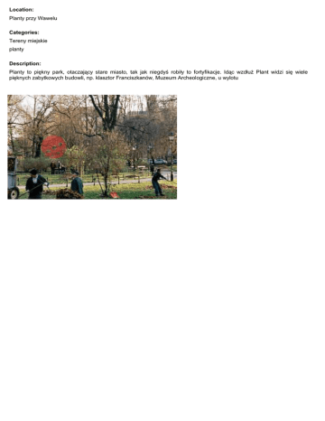 Location: Planty przy Wawelu Categories: Tereny miejskie planty Description: Planty to piękny park, otaczający stare miasto, tak jak niegdyś robiły to fortyfikacje. Idąc wzdłuż Plant widzi się wiele pięknych zabytkowych budowli, np. klasztor Franciszkanów, Muzeum Archeologiczne, u wylotu