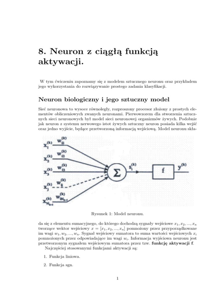 W tym ćwiczeniu zapoznamy się z modelem sztucznego neuronu oraz przykładem