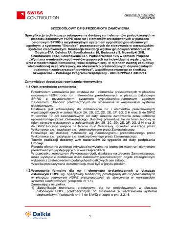 Załącznik nr 1 do SIWZ 15/003/PN/D SZCZEGÓŁOWY OPIS PRZEDMIOTU ZAMÓWIENIA Specyfikacja techniczna przetargowa na dostawę rur i elementów preizolowanych w płaszczu osłonowym HDPE oraz rur i elementów preizolowanych w płaszczu osłonowym SPIRO z rezystancyjnym systemem sygnalizacyjno-alarmowym zgodnym z systemem ”Brandes” przeznaczonych do stosowania w warszawskim systemie ciepłowniczym. Realizacja likwidacji węzłów grupowych Wiktorska 31, Odyńca 67A, Dzielna 7A, Bonifraterska 10, Bednarska 9, Nowolipki 28B, Grochowska 333A, Grochowska 337, Podskarbińska 10A w ramach Projektu „Wymiana wymiennikowych węzłów grupowych na indywidualne węzły cieplne wraz z modernizacją komunalnej sieci ciepłowniczej, w rejonach zwartej zabudowy wielorodzinnej m.st. Warszawy, na obszarach o przekroczonych dopuszczalnych poziomach zanieczyszczeń powietrza”, współfinansowanego ze środków Szwajcarsko – Polskiego Programu Współpracy - URP/SPPW/2.1.2/KIK/61. Zamawiający dopuszcza rozwiązania równoważne 1.1 Opis przedmiotu zamówienia Przedmiotem zamówienia jest dostawa rur i elementów preizolowanych w płaszczu osłonowym HDPE oraz rur i elementów preizolowanych w płaszczu osłonowym SPIRO z rezystancyjnym systemem sygnalizacyjno-alarmowym zgodnym z systemem ”Brandes” przeznaczonych do stosowania w warszawskim systemie ciepłowniczym. Dostawca jest zobowiązany do dostarczenia rur i elementów preizolowanych wyszczególnionych w załącznikach 2A, 2B, 2C, 2D, 2E, 2F, 2G, 2 H oraz 2I do SIWZ w terminie 19 dni kalendarzowych od daty złożenia zamówienia przez odbiorcę upoważnionego przez Zamawiającego. Dostawę przewiduje się na teren budowy w rejon adresów wskazanych w załącznikach 2A, 2B, 2C, 2D, 2E, 2F, 2G, 2 H oraz 2I do SIWZ lub inne miejsce na terenie m.st. Warszawy uprzednio wskazane przez Wykonawcę s.c. i przyłączy s.c. i zaakceptowane przez Zamawiającego. Przewiduje się dostawę materiałów wg harmonogramu przedstawionego przez Wykonawcę s.c. i przyłączy s.c. zaakceptowanego przez Zamawiającego. Termin realizacji dostawy w/w materiałów 32 tygodnie od daty podpisania Umowy. Ponadto oferta ma zawierać indywidualną wycenę na jednostkę miary rur i elementów preizolowanych występujących w w/w załącznikach. W przypadku koniecznym Wykonawca robót, działający na zlecenie Zamawiającego, może wystąpić o dodatkowe ilości materiałów preizolowanych objęte szczegółowym wykazem z zastosowaniem podanych jednostkowych cen zakupu. Wszelka przekazywana dokumentacja musi być w języku polskim. 1.2 Wymagania formalne dla rur i elementów preizolowanych w płaszczu osłonowym HDPE wg „Specyfikacji technicznej przetargowej dla rur preizolowanych w płaszczu osłonowym HDPE przeznaczonych do stosowania w warszawskim systemie ciepłowniczym” (załącznik nr 1.1). Zamawiający uzupełnia: 1) „Specyfikację techniczną przetargową dla rur preizolowanych w płaszczu osłonowym HDPE przeznaczonych do stosowania w warszawskim systemie ciepłowniczym” (załącznik nr 1.1 do SIWZ) o zapis w pkt. 2.2.18: 1 „Referencje od eksploatatorów rurociągów preizolowanych poświadczające szczelność zaoferowanych typów złączy po minimum rocznej eksploatacji w rzeczywistych warunkach pracy”. 2) „Wymagania techniczne dla rur i elementów preizolowanych w płaszczu osłonowym HDPE przeznaczonych do budowy podziemnych rurociągów ciepłowniczych układanych bezpośrednio w gruncie z dnia 31.07.2012 (załącznik nr 1.2 do SIWZ) o zapis w pkt. 5: „Złącze (kompletna konstrukcja połączenia pomiędzy sąsiednimi odcinkami rur oraz kształtkami preizolowanymi) ma spełniać wymagania normy PN-EN 489:2005 i/ lub PN-EN 489:2009. Do zabezpieczania izolacji na połączeniach spawanych dla rurociągów DN32DN400 należy stosować nasuwki termokurczliwe z polietylenu wysokiej gęstości HDPE sieciowane radiacyjnie na całej długości, z klejem i mastyką uszczelniającą lub jednolitą masą adhezyjno – uszczelniającą. W przypadku izolowania złączy płynną pianką PUR wymagane jest stosowanie w mufie – bez względu na średnicę rurociągu, dwóch otworów montażowych. Otwory montażowe muszą być zabezpieczone korkami wgrzewanymi”. Zamawiający dopuszcza rury i elementy preizolowane w płaszczu osłonowym HDPE z rezystancyjnym systemem sygnalizacyjno-alarmowym zgodnym z systemem ”Brandes” spełniające wymogi innych norm a posiadających cechy równoważne oraz standardy i parametry określone w przywoływanych w opracowaniach PN. 1.3 Wymagania formalne dla rur i elementów preizolowanych w płaszczu osłonowym "SPIRO" wg „Specyfikacji technicznej przetargowej dla rur preizolowanych w płaszczu osłonowym SPIRO z systemem sygnalizacyjnoalarmowym ”BRANDES” przeznaczonych do budowy rurociągów naziemnych w warszawskim systemie ciepłowniczym” (załącznik nr 1.3 do SIWZ). Zamawiający dopuszcza rury i elementy preizolowane w płaszczu osłonowym SPIRO z rezystancyjnym systemem sygnalizacyjno-alarmowym zgodnym z systemem ”Brandes” spełniające wymogi innych norm a posiadających cechy równoważne oraz standardy i parametry określone w przywoływanych w opracowaniach PN. 1.4 Rozliczenia Rozliczenie odbywać się będzie na podstawie faktur, wystawionych za odebraną przez odbiorcę upoważnionego przez Zamawiającego partię materiałów wg w/w harmonogramu, potwierdzonego protokołem odbioru sporządzonego w obecności upoważnionego przedstawiciela Zamawiającego. Zamawiający ureguluje należność w terminie 30 dni od daty wpływu w siedzibie Zamawiającego prawidłowo wystawionych faktur z załączonym oryginałem protokołu odbioru. Załączniki: 1. Rysunek nr 1 – poduszki kompensacyjne typ „A” 2. Rysunek nr 2 – poduszki kompensacyjne typ „B” 2