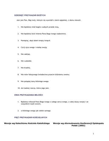 DZIESIĘĆ PRZYKAZAŃ BOŻYCH Jam jest Pan, Bóg twój, którym cię wywiódł z ziemi egipskiej, z domu niewoli. 1. Nie będziesz miał bogów cudzych przede mną. 2. Nie będziesz brał imienia Pana Boga twego nadaremno. 3. Pamiętaj, abyś dzień święty święcił. 4. Czcij ojca swego i matkę swoją. 5. Nie zabijaj. 6. Nie cudzołóż. 7. Nie kradnij. 8. Nie mów fałszywego świadectwa przeciw bliźniemu swemu. 9. Nie pożądaj żony bliźniego swego. 10. Ani żadnej rzeczy, która jego jest. DWA PRZYKAZANIA MIŁOŚCI 1. Będziesz miłował Pana Boga twego z całego serca swego, z całej duszy swojej i ze wszystkich myśli swoich, 2. a bliźniego swego jak siebie samego. PIĘĆ PRZYKAZAŃ KOŚCIELNYCH Wersja wg Katechizmu Kościoła Katolickiego Wersja wg sformułowania Konferencji Episkopatu Polski (2002) 1 1. W niedziele i w inne nakazane dni świąteczne uczestniczyć we Mszy świętej i powstrzymać się od prac służebnych. 2. Przynajmniej raz w roku spowiadać się. 3. Przynajmniej raz w roku na Wielkanoc przyjąć Komunię świętą. 4. W dni pokuty wyznaczone przez Kościół powstrzymać się od spożywania mięsa i zachować post. 5. Wierni są zobowiązani dbać o potrzeby materialne Kościoła, każdy według swoich możliwości. 1. W niedzielę i święta nakazane uczestniczyć we Mszy świętej i powstrzymać się od prac niekoniecznych. 2. Przynajmniej raz w roku przystąpić do sakramentu pokuty. 3. Przynajmniej raz w roku, w okresie wielkanocnym, przyjąć Komunię Świętą. 4. Zachowywać nakazane posty i wstrzemięźliwość od pokarmów mięsnych, a w okresach pokuty powstrzymywać się od udziału w zabawach. 5. Troszczyć się o potrzeby wspólnoty Kościoła. Zob. też: wersja oficjalna (2001), zatwierdzona przez Konferencję Episkopatu Polski. WYKŁADNIA DO CZWARTEGO PRZYKAZANIA Wszyscy wierni obowiązani są czynić pokutę. Dla wyrażenia tej pokutnej formy pobożności chrześcijańskiej Kościół ustanowił dni i okresy pokuty. W tym czasie chrześcijanin powinien szczególnie praktykować czyny pokutne służące nawróceniu serca, co jest istotą pokuty w Kościele. Powstrzymywanie się od zabaw pomaga w opanowaniu instynktów i sprzyja wolności serca. • Czynami pokutnymi są: modlitwa, jałmużna, uczynki pobożności i miłości, umartwianie przez wierniejsze pełnienie obowiązków, wstrzemięźliwość od pokarmów mięsnych i post. • Czasem pokuty w Kościele są poszczególne piątki całego roku i czas wielkiego postu. • Wstrzemięźliwość obowiązuje wszystkich, którzy ukończyli 14 rok życia we wszystkie piątki i Środę Popielcową. • Post obowiązuje w Środę Popielcową i w Wielki Piątek wszystkich między 18 a 60 rokiem życia. • Uzasadniona niemożliwość zachowania wstrzemięźliwości w piątek domaga się od chrześcijanina podjęcia innych form pokuty. • Powstrzymywanie się od zabaw obowiązuje we wszystkie piątki i w czasie wielkiego postu. źródło: 318 Zebranie KEP 2 GŁÓWNE PRAWDY WIARY 1. Jest jeden Bóg. 2. Bóg jest sędzią sprawiedliwym, który za dobre wynagradza, a za złe karze. 3. Są trzy Osoby Boskie : Bóg Ojciec, Syn Boży, Duch Święty. 4. Syn Boży stał się człowiekiem i umarł na krzyżu dla naszego zbawienia. 5. Dusza ludzka jest nieśmiertelna. 6. Łaska Boska jest do zbawienia koniecznie potrzebna. BŁOGOSŁAWIEŃSTWA EWANGELICZNE 1. Błogosławieni ubodzy w duchu, albowiem do nich należy królestwo niebieskie. 2. Błogosławieni, którzy płaczą, albowiem oni będą pocieszeni. 3. Błogosławieni cisi, albowiem oni na własność posiądą ziemię. 4. Błogosławieni, którzy łakną i pragną sprawiedliwości, albowiem oni będą nasyceni. 5. Błogosławieni miłosierni, albowiem oni miłosierdzia dostąpią. 6. Błogosławieni czystego serca, albowiem oni Boga oglądać będą. 7. Błogosławieni, którzy wprowadzają pokój, albowiem oni synami Bożymi będą nazwani. 8. Błogosławieni, którzy prześladowanie cierpią dla sprawiedliwości, albowiem do nich należy królestwo niebieskie. Błogosławieni jesteście, gdy wam urągają i prześladować was będą, i gdy kłamliwie mówić będą wszystko złe na was z mego powodu. Cieszcie się i radujcie, albowiem wasza nagroda wielka jest w niebie. 3 TRZY CNOTY BOSKIE (TEOLOGALNE) Wiara. Nadzieja. Miłość. CZTERY CNOTY GŁÓWNE (KARDYNALNE) Roztropność. Sprawiedliwość. Umiarkowanie. Męstwo. SIEDEM GRZECHÓW GŁÓWNYCH 1. Pycha. 2. Chciwość. 3. Nieczystość. 4. Zazdrość. 5. Nieumiarkowanie w jedzeniu i piciu. 6. Gniew. 7. Lenistwo. SIEDEM CNÓT GŁÓWNYCH 1. Pokora. 2. Hojność. 3. Czystość. 4. Miłość. 4 5. Umiarkowanie. 6. Cierpliwość. 7. Gorliwość i pracowitość. NAJWAŻNIEJSZE DOBRE UCZYNKI Modlitwa. Post. Jałmużna. UCZYNKI MIŁOSIERDZIA WZGLĘDEM DUSZY 1. Grzeszących upominać. 2. Nieumiejętnych pouczać. 3. Wątpiącym dobrze radzić. 4. Strapionych pocieszać. 5. Krzywdy cierpliwie znosić. 6. Urazy chętnie darować. 7. Modlić się za żywych i umarłych. UCZYNKI MIŁOSIERDZIA WZGLĘDEM CIAŁA 1. Głodnych nakarmić. 2. Spragnionych napoić. 3. Nagich przyodziać. 5 4. Podróżnych w dom przyjąć. 5. Więźniów pocieszać. 6. Chorych nawiedzać. 7. Umarłych pogrzebać. SAKRAMENTY ŚWIĘTE 1. Chrzest. 2. Bierzmowanie. 3. Eucharystia. 4. Pokuta. 5. Namaszczenie chorych. 6. Kapłaństwo. 7. Małżeństwo. WARUNKI SAKRAMENTU POKUTY 1. Rachunek sumienia. 2. Żal za grzechy. 3. Mocne postanowienie poprawy. 4. Spowiedź szczera. 6 5. Zadośćuczynienie Panu Bogu i bliźniemu. OSTATECZNE RZECZY CZŁOWIEKA Śmierć. Sąd Boży. Niebo albo piekło. 7