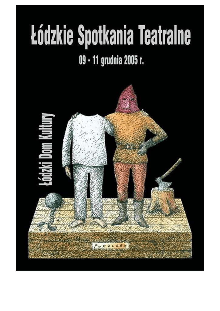 JURY Katarzyna Deszcz reżyser teatralny, dyrektor Teatru im. Adama Mickiewicza w Częstochowie Janusz Majcherek krytyk, redaktor naczelny miesięcznika Teatr Paweł Szkotak dyrektor Teatru Polskiego i Biuro Podróży w Poznaniu Lech Śliwonik krytyk, rektor Akademii Teatralnej im. Aleksandra Zelwerowicza w Warszawie, prezes Zarządu Głównego Towarzystwa Kultury Teatralnej w Warszawie Jury wyraża uznanie organizatorom, którzy w bardzo trudnych warunkach finansowych i pod obstrzałem tendencyjnych zarzutów przygotowali XIV edycję wznowionych Spotkań, udowadniając po raz kolejny, że Łódzkie Spotkania Teatralne są najważniejszym forum polskiego teatru alternatywnego. Łódź, dn. 11 grudnia 2005 r. NAGRODY I NAGRODA Teatr Prób z Wągrowca za spektakl Polish Karma II NAGRODA Teatr Krzyk z Maszewa za przedstawienie Głosy WYRÓŻNIENIE ZESPOŁOWE Art. 51 ze Zgierza za autorską wypowiedź Kain WYRÓŻNIENIE INDYWIDUALNE Piotr Drążkiewicz za muzykę do spektaklu Polish Karma Teatr Prób z Wągrowca WYRÓŻNIENIA HONOROWE Barbara Prądzyńska reżyser Teatru Fraktale z Poznania za aranżację nietypowej przestrzeni w przedstawieniu Labirynt. Podziemia pewnego miasta Zuzzanna Fijewska za ambitny debiut w teatrze jednego aktora SPEKTAKLE * prezentacje ** przedstawienie towarzyszące *** konkurs 1. ART. 51 (Zgierz) Kain *** 2. Akademia Ruchu (Warszawa) Mała scena * 3. Teatr Krzyk (Maszewo) Głosy *** Laureat Barbórka 2005 - Poszukiwanie alternatywy (Skierniewice) 4. Akademia Ruchu (Warszawa) Mała scena 5. Scena III Roku (Łódź) Czuła jest noc *** 6. Scena III Roku (Łódź) Czuła jest noc *** 7. Teatr Zielony Wiatrak (Sopot) Dna *** 8. Teatr Wiczy (Toruń) Cesarz ** 9. Zuzanna Fijewska (Warszawa) Głuchoniemoc *** 10. Teatr From Poland (Częstochowa) Saxofonista *** 11. Teatr Lalki i Aktora (Łomża) Opowieść o Lejzorku Rojtszwańcu ** 12. Zuzanna Fijewska (Warszawa) Głuchoniemoc *** 13. Teatr Dada von Bzdülöw (Gdańsk) Magnolia * 14. Teatr Cinema (Michałowice) Albert Lux * 15. Teatr Prób (Wągrowiec) Polish Karma *** 16. Fraktale (Poznań) Podziemia pewnego miasta. Labirynt *** 17. Teatr za Lustrem (Tarnowskie Góry) Piaskownica *** 18. Fraktale (Poznań) Podziemia pewnego miasta. Labirynt *** 19. Teatr Stajnia Pegaza (Sopot) Wstyd ** 20. Scena III Roku (Łódź) Pod wulkanem *** 21. Teatr of Manhattan (Łódź) Remix ** IMPREZY TOWARZYSZĄCE 1. Sesja naukowa studentów i doktorantów przygotowana przez Koło Teatralne Uniwewrsytetu Łódzkiego (jednodniowa) Dyskurs ciała w teatrze współczesnym Wystąpienia: Monika Wasilewska (Uniwersytet Łódzki) Marta Keil (Uniwersytet im. Adama Mickiewicza w Poznaniu) Adrianna Kabza-Biernacka (Uniwersytet Warszawski) Joanna Szymajda (Uniwersytet Łódzki / Lyon II) Joanna Michałowska (Uniwersytet Łódzki) Rafał Zięba (Teatr Nowy w Łodzi) Michał Rzepka (Teatr Officium) 2. Debata Granice wolności w sztuce: Prowadzenie: Marcin Wartalski projekcja zapisu Clone Factory Suki OFF wypowiedzi zaproszonych gości m. in.: prof. dr hab Kazimierz Szewczyk (Kierownik Katedry Etyki Uniwersytetu Medycznego w Łodzi) kierownik artystyczny SUKA OFF - Piotr Węgrzyński oraz członków zespołu dyskusja 3. ŁST polecają: Promocja książki dr Joanna Ostrowska The Living Theatre - od sztuki do polityki Prowadzenie spotkania z autorką: Dominika Łarionow (Uniwersytet Łódzki) 4. Spotkanie O teatrze, którego sceną jest miasto Jacek Głomb (dyrektor Teatru im. H. Modrzejewskiej w Legnicy) 5. Spotkanie intermedialna grupa artystyczna WSPÓLNOTA LEEEŻEĆ (Łódź) 6. Spotkanie Współzałożyciele Studenckiego Teatru Satyry Pstrąg: Barbara Machejko i Leszek Skrzydło oraz promocja książki Wiesław Machejko Pstrąg Studencki Teatr Satyry 1955-1967 7. Forum dyskusyjne: rozmowy o Północy (z udziałem twórców, krytyków, publiczności i jurorów trzydniowe)