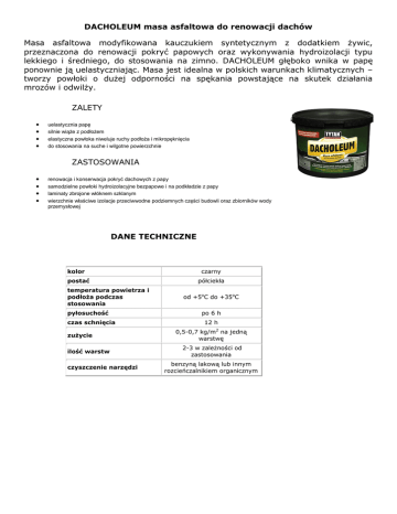 DACHOLEUM masa asfaltowa do renowacji dachów Masa asfaltowa modyfikowana kauczukiem syntetycznym z dodatkiem żywic, przeznaczona do renowacji pokryć papowych oraz wykonywania hydroizolacji typu lekkiego i średniego, do stosowania na zimno. DACHOLEUM głęboko wnika w papę ponownie ją uelastyczniając. Masa jest idealna w polskich warunkach klimatycznych – tworzy powłoki o dużej odporności na spękania powstające na skutek działania mrozów i odwilży. ZALETY uelastycznia papę silnie wiąże z podłożem elastyczna powłoka niweluje ruchy podłoża i mikropęknięcia do stosowania na suche i wilgotne powierzchnie ZASTOSOWANIA renowacja i konserwacja pokryć dachowych z papy samodzielne powłoki hydroizolacyjne bezpapowe i na podkładzie z papy laminaty zbrojone włóknem szklanym wierzchnie właściwe izolacje przeciwwodne podziemnych części budowli oraz zbiorników wody przemysłowej DANE TECHNICZNE kolor postać temperatura powietrza i podłoża podczas stosowania pyłosuchość czas schnięcia zużycie ilość warstw czyszczenie narzędzi czarny półciekła od +5oC do +35oC po 6 h 12 h 0,5-0,7 kg/m2 na jedną warstwę 2-3 w zależności od zastosowania benzyną lakową lub innym rozcieńczalnikiem organicznym
