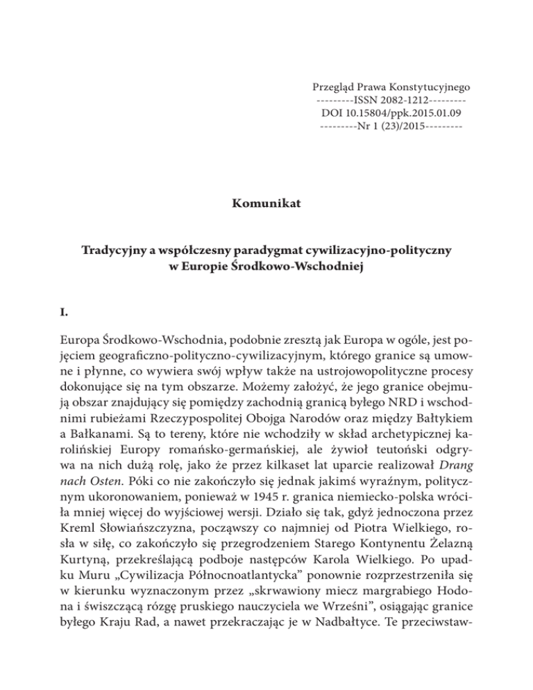 Przegląd Prawa Konstytucyjnego ---------ISSN 2082-1212--------DOI 10.15804/ppk.2015.01.09 ---------Nr 1 (23)/2015--------- Komunikat Tradycyjny a współczesny paradygmat cywilizacyjno-polityczny w Europie Środkowo-Wschodniej I. Europa Środkowo-Wschodnia, podobnie zresztą jak Europa w ogóle, jest pojęciem geograficzno-polityczno-cywilizacyjnym, którego granice są umowne i płynne, co wywiera swój wpływ także na ustrojowopolityczne procesy dokonujące się na tym obszarze. Możemy założyć, że jego granice obejmują obszar znajdujący się pomiędzy zachodnią granicą byłego NRD i wschodnimi rubieżami Rzeczypospolitej Obojga Narodów oraz między Bałtykiem a Bałkanami. Są to tereny, które nie wchodziły w skład archetypicznej karolińskiej Europy romańsko-germańskiej, ale żywioł teutoński odgrywa na nich dużą rolę, jako że przez kilkaset lat uparcie realizował Drang nach Osten. Póki co nie zakończyło się jednak jakimś wyraźnym, politycznym ukoronowaniem, ponieważ w 1945 r. granica niemiecko-polska wróciła mniej więcej do wyjściowej wersji. Działo się tak, gdyż jednoczona przez Kreml Słowiańszczyzna, począwszy co najmniej od Piotra Wielkiego, rosła w siłę, co zakończyło się przegrodzeniem Starego Kontynentu Żelazną Kurtyną, przekreślającą podboje następców Karola Wielkiego. Po upadku Muru „Cywilizacja Północnoatlantycka” ponownie rozprzestrzeniła się w kierunku wyznaczonym przez „skrwawiony miecz margrabiego Hodona i świszczącą rózgę pruskiego nauczyciela we Wrześni”, osiągając granice byłego Kraju Rad, a nawet przekraczając je w Nadbałtyce. Te przeciwstaw- 188 PRZEGLĄD PRAWA KONSTYTUCYJNEGO 2015/1 nie geograficznie zwrócone cywilizacyjno-imperialne trendy, przetaczające się przez środkowoeuropejskie równiny, uświadamiają nam, że „niespokojny obszar między Niemcami a Rosją” wyróżnia się przede wszystkim tym, że opiera się rusyfikacji, względnie germanizacji, ale nacisk Berlina oraz Moskwy jest trudny do przeoczenia, gdyż egzogeniczne siły Europy Środkowo-Wschodniej są zbyt słabe, aby móc stworzyć konkurencyjny względem dwóch wielkich sąsiadów ośrodek polityczny. Niegdyś udało się to dzięki sojuszowi panów krakowskich z Giedyminowiczami, których następcami w sporym stopniu zostali Habsburgowie, ale po rozpadzie Austro-Węgier wizja mocnej środkowoeuropejskiej konkurencji, z którą musieliby się liczyć Prusacy i Moskale, została zasadniczo pogrzebana. Co prawda, pojawiała się ona w nadwiślańskich elukubracjach międzywojennego dwudziestolecia, lecz okazały się one „mierzeniem siły na zamiary”, względnie „myśleniem życzeniowym”, brutalnie zweryfikowanym przez II wojnę światową. W wymiarze prawnopaństwowym skutkujące słabością rozproszkowanie przejawia się w braku własnych szerszych koncepcji, którym nadawanoby oficjalną postać, która ewentualnie mogłaby się spotkać z zainteresowaniem zagranicy. Ostatnim przejawem propagowania samodzielnych rozwiązań była Konstytucja kwietniowa. Nie przetrwała ona próby czasu, gdyż nadeszła wojna, której rezultaty potwierdziły prawidłowość polegającą na tym, że Europa Środkowo-Wschodnia ulega impulsom przychodzącym z zewnątrz, bo ma zbyt mało zasobów ideowo-materialnych, aby narzucać swoją wolę innym. To historyczne zjawisko jest dobrze widoczne w wydawanych gdzie indziej książkach, poświęconych jakimś globalnym problemom, w których nasza część Europy zajmuje marginalną pozycję. Jeśli publikacje ukazują się w jakimś zachodniosłowiańskim kraju, na Węgrzech czy w Rumunii, to wówczas może być sporo o współrodakach, ale o sąsiadach „zza miedzy biegnącej przez środkowoeuropejski grajdołek” raczej już nie. Wynika to z tego, że stosunki między ludami i państwami znajdującymi się w tej części Europy nie są szczególnie ożywione. Ich elity kulturowo-polityczne spoglądają tęsknie na zewnątrz, oczekując stamtąd ożywczych impulsów. Marzą one o zaproszeniu na jakiś egzogeniczny rydwan czy salon, gdzie w tłumie podobnych sobie satelitów będą mogły oklaskiwać wielkich tego świata. Pragną w doskonały sposób naśladować podziwianych hegemonów, przyjmując od nich w postawie po- Komunikat • Tradycyjny a współczesny paradygmat cywilizacyjno-polityczny... 189 kornego uwielbienia pouczenia i wyrazy zadowolenia z dobrze odrobionej lekcji. Przeziera przez nich wtórność, udzielająca się naśladującym ich masom, z pokorą przyjmującym okcydentalny dyktat ideowy, nakazujący przebierać państwowości w konstytucyjno-demoliberalne kostiumy. Wyjątkiem od tej zasady był husytyzm, w którym przejawiło się pragnienie kroczenia własną, czeską drogą do chrześcijańskich ideałów. Ten ruch religijno-militarny wywarł duże wrażenie na ówczesnej międzynarodowej opinii publicznej, przygotowując ją na pojawienie się Lutra. Siła oddziaływania husyckiego przesłania była wzmacniania dzięki temu, że Praga była cesarską stolicą, co w naturalny sposób zwiększało wagę dziejących się w niej i w jej pobliżu wydarzeń. Wydaje się, że na następny przykład społeczno-ideowego fermentu, dziejącego się w Europie Środkowo-Wschodniej, mającego dość samodzielny charakter i wzbudzającego spore zainteresowanie daleko poza tym obszarem, trzeba było czekać do 1968 r., gdy Praska Wiosna rozkwitła hasłem Socjalizmu z Ludzką Twarzą, wzbudzającego nadzieje lewicy pod wszystkimi szerokościami geograficznymi. Oczekiwano, że nastąpi rozkwit szkicowanego po 1945 r. modelu demokracji ludowej, mającej syntetyzować najlepsze cechy radzieckiego i zachodniego modelu przy jednoczesnym unikaniu ich najpoważniejszych wad. Ta Trzecia Droga miała charakteryzować się „rozsądnie ograniczonym” pluralizmem politycznym i ograniczeniem uznanej za przesadną aktywności państwa w sferze gospodarczej. W moskiewskiej Cen