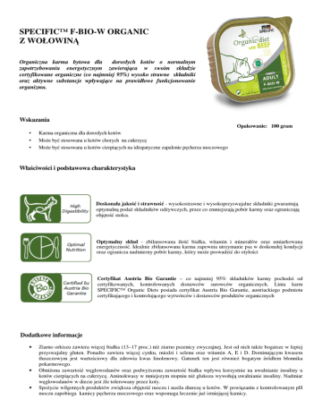 SPECIFIC™ F-BIO-W ORGANIC Z WOŁOWINĄ Organiczna karma bytowa dla dorosłych kotów o normalnym zapotrzebowaniu energetycznym zawierająca w swoim składzie certyfikowane organiczne (co najmniej 95%) wysoko strawne składniki oraz aktywne substancje wpływające na prawidłowe funkcjonowanie organizmu. Wskazania Opakowanie: 100 gram • • • Karma organiczna dla dorosłych kotów Może być stosowana u kotów chorych na cukrzycę Może być stosowana u kotów cierpiących na idiopatyczne zapalenie pęcherza moczowego Właściwości i podstawowa charakterystyka Doskonała jakość i strawność - wysokostrawne i wysokoprzyswajalne składniki gwarantują optymalną podaż składników odżywczych, przez co zmniejszają pobór karmy oraz ograniczają objętość stolca. Optymalny skład - zbilansowana ilość białka, witamin i minerałów oraz umiarkowana energetyczność. Idealnie zbilansowana karma zapewnia utrzymanie psa w doskonałej kondycji oraz ogranicza nadmierny pobór karmy, który może prowadzić do otyłości Certyfikat Austria Bio Garantie – co najmniej 95% składników karmy pochodzi od certyfikowanych, kontrolowanych dostawców surowców organicznych. Linia karm SPECIFIC™ Organic Diets posiada certyfikat Austria Bio Garantie, austriackiego podmiotu certyfikującego i kontrolującego wytwórców i dostawców produktów organicznych Dodatkowe informacje • • • Ziarno orkiszu zawiera więcej białka (13–17 proc.) niż ziarno pszenicy zwyczajnej. Jest od nich także bogatsze w lepiej przyswajalny gluten. Ponadto zawiera więcej cynku, miedzi i selenu oraz witamin A, E i D. Dominującym kwasem tłuszczowym jest wartościowy dla zdrowia kwas linolenowy. Gatunek ten jest również bogatym źródłem błonnika pokarmowego. Obniżona zawartość węglowodanów oraz podwyższona zawartość białka wpływa korzystnie na uwalnianie insuliny u kotów cierpiących na cukrzycę. Aminokwasy w mniejszym stopniu niż glukoza wywołują uwalnianie insuliny. Nadmiar węglowodanów w diecie jest źle tolerowany przez koty. Spożycie wilgotnych produktów zwiększa objętość moczu i nasila diurezę u kotów. W powiązaniu z kontrolowanym pH moczu zapobiega kamicy pęcherza moczowego oraz wspomaga leczenie już istniejącej kamicy. Składniki Wieprzowina, wołowina, mięso z kurcząt (14%), olej rzepakowy, ryż, minerały i witaminy. Nie zawiera syntetycznych barwników, dodatków smakowych oraz składników modyfikowanych genetycznie. Zawartość wybranych składników pokarmowych Składnik Energia kJ Białko [g] surowe Tłuszcz [g] surowy Węglowodany [g] Włókno [g] Wapń [g] Fosfor [g] Sód [g] Woda [g] Zawartość w 100 g Zawartość na /MJ 441 9,8 22,2 7,1 16,1 0,6 1,4 0,7 1,6 0,22 0,50 0,19 0,43 0,09 0,20 80,4 Zalecenia żywieniowe i dawkowanie Powyższe dawki mają charakter orientacyjny. Indywidualne zapotrzebowanie na karmę zależy od szeregu czynników takich jak rasa, pora roku, aktywność kota. W związku z powyższym powinno się stale kontrolować masę ciała zwierzęcia i dostosowywać ilość pokarmu do aktualnych potrzeb. Zwierzę powinno mieć ciągły dostęp do świeżej wody.