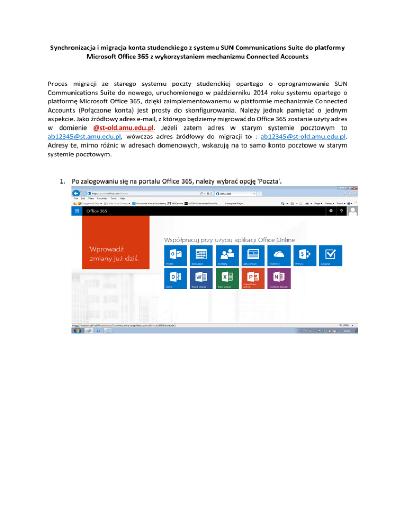 Synchronizacja i migracja konta studenckiego z systemu SUN Communications Suite do platformy Microsoft Office 365 z wykorzystaniem mechanizmu Connected Accounts Proces migracji ze starego systemu poczty studenckiej opartego o oprogramowanie SUN Communications Suite do nowego, uruchomionego w październiku 2014 roku systemu opartego o platformę Microsoft Office 365, dzięki zaimplementowanemu w platformie mechanizmie Connected Accounts (Połączone konta) jest prosty do skonfigurowania. Należy jednak pamiętać o jednym aspekcie. Jako źródłowy adres e-mail, z którego będziemy migrować do Office 365 zostanie użyty adres w domienie @st-old.amu.edu.pl. Jeżeli zatem adres w starym systemie pocztowym to [email protected], wówczas adres źródłowy do migracji to : [email protected]. Adresy te, mimo różnic w adresach domenowych, wskazują na to samo konto pocztowe w starym systemie pocztowym. 1. Po zalogowaniu się na portalu Office 365, należy wybrać opcję 'Poczta'. 2. Uzyskamy widok podobny do poniższego. 3. Należy kliknąć "kółko zębate" i wybrać pozycję 'Opcje'. 4. W okienku, które się ukaże, należy z opcji wyświetlonych po lewej stronie wybrać element "Połączone konta" (zrzut poniżej). 5. Należy kliknąć znak "+" 6. W polu 'Adres e-mail' należy wpisać swój adres e-mail w domenie @st-old.amu.edu.pl. Czyli np. [email protected]. W polu 'Hasło' wpisać swoje hasło. Następnie kliknąć 'OK'. 7. Powinniśmy otrzymać komunikat podobny do poniższego. 8. W tym momencie rozpocznie się proces synchronizacji konta - może on potrwać dość długo, w zależności od zajętości skrzynki pocztowej (widok poniżej). Nie musimy mieć otwartego ani panelu Office365 ani przeglądarki - proces odbywa się cały czas w tle. Dla użytkownika jest transparentny. Możemy sprawdzać stan synchronizacji klikając co jakiś czas przycisk 'Odśwież. 9. W momencie zakończenia synchronizacji, w polu 'Stan' nastąpi zmiana statusu z 'Downloading' na 'OK'. 10. Przechodząc ponownie do swojej skrzynki odbiorczej, powinniśmy zobaczyć kopię swojej starej skrzynki odbiorczej.
