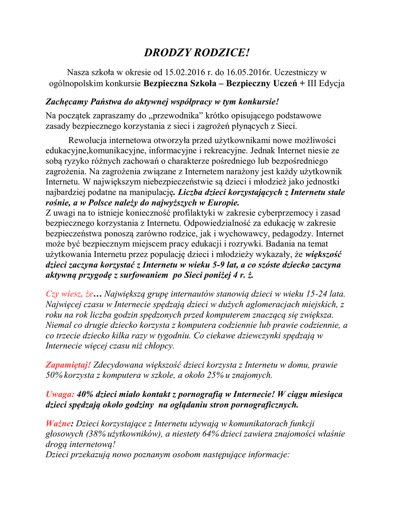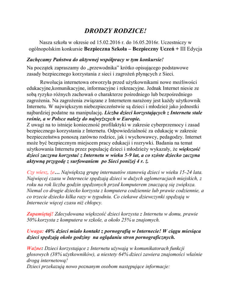 DRODZY RODZICE! Nasza szkoła w okresie od 15.02.2016 r. do 16.05.2016r. Uczestniczy w ogólnopolskim konkursie Bezpieczna Szkoła – Bezpieczny Uczeń + III Edycja Zachęcamy Państwa do aktywnej współpracy w tym konkursie! Na początek zapraszamy do „przewodnika” krótko opisującego podstawowe zasady bezpiecznego korzystania z sieci i zagrożeń płynących z Sieci. Rewolucja internetowa otworzyła przed użytkownikami nowe możliwości edukacyjne,komunikacyjne, informacyjne i rekreacyjne. Jednak Internet niesie ze sobą ryzyko różnych zachowań o charakterze pośredniego lub bezpośredniego zagrożenia. Na zagrożenia związane z Internetem narażony jest każdy użytkownik Internetu. W największym niebezpieczeństwie są dzieci i młodzież jako jednostki najbardziej podatne na manipulację. Liczba dzieci korzystających z Internetu stale rośnie, a w Polsce należy do najwyższych w Europie. Z uwagi na to istnieje konieczność profilaktyki w zakresie cyberprzemocy i zasad bezpiecznego korzystania z Internetu. Odpowiedzialność za edukację w zakresie bezpieczeństwa ponoszą zarówno rodzice, jak i wychowawcy, pedagodzy. Internet może być bezpiecznym miejscem pracy edukacji i rozrywki. Badania na temat użytkowania Internetu przez populację dzieci i młodzieży wykazały, że większość dzieci zaczyna korzystać z Internetu w wieku 5-9 lat, a co szóste dziecko zaczyna aktywną przygodę z surfowaniem po Sieci poniżej 4 r. ż. Czy wiesz, że… Największą grupę internautów stanowią dzieci w wieku 15-24 lata. Najwięcej czasu w Internecie spędzają dzieci w dużych aglomeracjach miejskich, z roku na rok liczba godzin spędzonych przed komputerem znaczącą się zwiększa. Niemal co drugie dziecko korzysta z komputera codziennie lub prawie codziennie, a co trzecie dziecko kilka razy w tygodniu. Co ciekawe dziewczynki spędzają w Internecie więcej czasu niż chłopcy. Zapamiętaj! Zdecydowana większość dzieci korzysta z Internetu w domu, prawie 50% korzysta z komputera w szkole, a około 25% u znajomych. Uwaga: 40% dzieci miało kontakt z pornografią w Internecie! W ciągu miesiąca dzieci spędzają około godziny na oglądaniu stron pornograficznych. Ważne: Dzieci korzystające z Internetu używają w komunikatorach funkcji głosowych (38% użytkowników), a niestety 64% dzieci zawiera znajomości właśnie drogą internetową! Dzieci przekazują nowo poznanym osobom następujące informacje: 1. 78% -adres mailowy 2. 45% -telefoniczny numer domowy 3. 10% - adres domowy 4. prawie 50% przekazuje obcym osobom swoje zdjęcie Powyższe dane pokazują, że dzieci nie mają wiedzy na temat obszarów potencjalnie niebezpiecznych w środowisku internetowym. Pierwszymi osobami, które powinny chronić dziecko przez różnymi rodzajami cyberprzemocy są rodzice. 70% rodziców uznaje Internet za niebezpieczne miejsce, jednak 30% rodziców nie potrafi zdefiniować zagrożeń, które płyną z Internetu i wskazać miejsca potencjalnie niebezpieczne w Sieci. Prawie 60% rodziców nie widzi problemu cyberprzemocy związanego z korzystaniem z komunikatorów, a 40% nie uznaje zakupów on-line jako potencjalnie niebezpiecznych. Obszarami, które większość rodziców objętych badaniem deklaruje jako niebezpieczne dla dzieci to nawiązywanie znajomości przez Internet, czy zamieszczanie przez dzieci własnych zdjęć. Uwaga: Wyniki badań są przerażające. Tylko 10% rodziców kontroluje to, co jego dziecko robi w sieci. 27% dzieci przyznaje, że ich rodzice, nigdy nie interesowali się tym, co robią w sieci! Wskazówki dla rodziców dotyczące zasad racjonalnego korzystania z komputera i Internetu. Zawsze, kiedy mamy do czynienia z dzieckiem i młodzieżą korzystającą z narzędzia, jakim jest komputer oraz medium, jakim jest Internet, musimy wziąć pod uwagę, że może on zarówno bardzo przysłużyć się jednostce, wspomóc jej rozwój, pomóc nawiązać kontakty z rówieśnikami, jak również może spowodować poważne szkody psychofizjologiczne oraz emocjonalne. Jako rodzice, opiekunowie czy nauczyciele osoby dorosłe zobowiązane są cały czas pamiętać, że, podobnie jak w świecie rzeczywistym, również w rzeczywistości wirtualnej, na dziecko czyhać mogą różnorodne zagrożenia. Zanim, więc pozwolimy dziecku korzystać z komputera, ustalmy najpierw z nim pewne zasady, które będą obowiązywać i których powinno przestrzegać. Poniższe wskazówki mogą pomóc w ustalaniu tego rodzaju zasad: przynajmniej na początku należy korzystać z komputera i Internetu wspólnie z dzieckiem; dobrze jest zachęcać dziecko i nastolatka do wypowiadania się na temat swoich wrażeń i emocji związanych z korzystaniem z komputera; należy bardzo wyraźnie uczulać dziecko na to, że pod żadnym pozorem nie powinno podawać nikomu w Internecie swoich danych - adresu, numeru telefonu ani też żadnych informacji osobistych, takich jak np. nazwa i adres szkoły, do której uczęszcza; należy uczyć dziecko ufać swojej intuicji i doświadczeniu; bardzo ważne jest zdobycie zaufania dziecka, bowiem wówczas dziecko powie opiekunowi o sytuacji, która wywołuje w nim niepokój, jego zdaniem jest zagrażająca, albo w jakimkolwiek sensie wroga czy dyskomfortowa; należy przekonywać dziecko do tego, że nie wszystko, co zobaczy lub przeczyta w Internecie jest prawdą, należy tym samym zachęcać je do zadawania pytań, jeśli nie jest czegoś pewne; w sytuacji, kiedy dziecko potrzebuje, do wykonywanych przez siebie czynności w Internecie, ustalić login i hasło w celu identyfikacji użytkownika, należy pomóc mu wybrać takie, aby nie zdradzały o nim żadnych osobistych informacji; ważne, aby uświadomić dziecko, że nie należy zgadzać się na spotkania z osobami poznanymi w Internecie, bowiem osoby te nie zawsze muszą być tymi, za których się podają; istotne jest przekazanie dziecku jaką wartość ma cudza własność, a wraz z tym faktu, że kopi