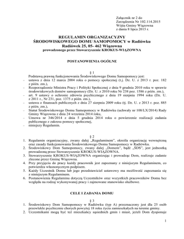 Załącznik nr 2 do Zarządzenia Nr 102.114.2015 Wójta Gminy Wiązowna z dania 8 lipca 2015 r. REGULAMIN ORGANIZACYJNY ŚRODOWISKOWEGO DOMU SAMOPOMOCY w Radiówku Radiówek 25, 05- 462 Wiązowna prowadzonego przez Stowarzyszenie KROKUS-WIĄZOWNA POSTANOWIENIA OGÓLNE − − − − − − − §1 Podstawą prawną funkcjonowania Środowiskowego Domu Samopomocy jest: ustawa z dnia 12 marca 2004 roku o pomocy społecznej (t.j. Dz. U. z 2013 r. poz. 182 z późn. zm.), Rozporządzenie Ministra Pracy i Polityki Społecznej z dnia 9 grudnia 2010 roku w sprawie środowiskowych domów samopomocy (Dz. U. z 2010 roku Nr 238 poz. 1586 z późn. zm.), art. 9 ustawy o ochronie zdrowia psychicznego z dnia 19 sierpnia 1994 roku (Dz. U. z 2011 r., Nr 231, poz. 1375 z późn. zm.), ustawa o finansach publicznych z dnia 27 sierpnia 2009 roku (tj. Dz. U. z 2013 r. poz. 885 z późn. zm.), Statut Środowiskowego Domu Samopomocy w Radiówku (uchwały nr 108/LX/2014) Rady Gminy Wiązowna z dnia 24 września 2014 roku, Umowa nr 346/2014 z dnia 5 grudnia 2014 roku o powierzenie realizacji zadania publicznego z zakresu pomocy społecznej, niniejszy Regulamin. §2 1. Regulamin organizacyjny, zwany dalej „Regulaminem”, określa organizację wewnętrzną oraz zasady funkcjonowania Środowiskowego Domu Samopomocy w Radiówku. 2. Środowiskowy Dom Samopomocy, zwany dalej „Domem”, bądź „ŚDS”, jest jednostką prowadzoną przez Stowarzyszenie KROKUS-WIĄZOWNA. 3. Stowarzyszenie KROKUS-WIĄZOWNA organizując i prowadząc Dom, realizuje zadanie zlecone przez Gminę Wiązowna. 4. Przy przyjęciu do pracy każdy pracownik jest zapoznany z niniejszym Regulaminem, co potwierdza własnoręcznym podpisem. 5. Każdy Uczestnik Domu lub jego przedstawiciel ustawowy ma możliwość zapoznania się z niniejszym Regulaminem. 6. Postanowienia Regulaminu dotyczą Uczestników oraz wszystkich pracowników Domu bez względu na rodzaj wykonywanej pracy i zajmowane stanowisko służbowe. CELE I ZADANIA DOMU §3 1. Środowiskowy Dom Samopomocy w Radiówku (typ A) przeznaczony jest dla 25 osób przewlekle psychicznie chorych powyżej 18 roku życia zamieszkałych na terenie gminy. 2. Uczestnikami mogą być też mieszkańcy sąsiednich gmin i miast, jeżeli Dom dysponuje 1 3. 4. 5. 6. 7. 8. wolnymi miejscami. Dom zapewnia oparcie społeczne dla osób przewlekle chorych psychicznie poprzez świadczenie usług dostosowanych do szczególnych potrzeb tych osób: - pomaga w nabywaniu i zwiększaniu umiejętności do samodzielnego funkcjonowania i zaspokajania podstawowych potrzeb życiowych uczestników, - kształtuje samodzielność i zasady współżycia w środowisku lokalnym, - dba o bezpieczne i higieniczne warunki pobytu, - prowadzi profilaktykę w zakresie zdrowia psychicznego, - dąży do stabilizacji psychicznej, podtrzymuje efekty terapeutyczne oraz zapobiega nawrotom choroby. Dom aktywizuje w miarę indywidualnych możliwości uczestników poprzez rozwijanie umiejętności niezbędnych do samodzielnego funkcjonowania w środowisku społecznym za pomocą różnego rodzaju treningów, warsztatów i terapii. Dom tworzy kompleksowy lokalny system oparcia społecznego dla osób chorych psychicznie poprzez współpracę z placówkami służby zdrowia, instytucji publicznych i organizacji pozarządowych działających na rzecz chorych psychicznie. Placówka prowadzi działania integrujące środowisko rodzin i społeczność lokalną z uczestnikami Domu. Środowiskowy Dom Samopomocy współpracuje z: - rodzinami i opiekunami uczestników, - Gminnym Ośrodkiem Pomocy Społecznej w Wiązownie oraz innymi Ośrodkami Pomocy Społecznej, - Poradnią Zdrowia Psychicznego i innymi placówkami opieki zdrowotnej, - organizacjami pozarządowymi, - społecznością lokalną. Najważniejszym celem Domu jest poprawa jakości życia oraz usamodzielnianie uczestników w zakresie: - umiejętności samoobsługowych i zaradności życiowej, - umiejętności społecznych i interpersonalnych, - aktywności i odpowiedzialności, - funkcjonowania w oparciu o własne możliwości i grupie w środowisku lokalnym. ORGANIZACJA ŚDS §4 1. Nadzór nad działalnością Domu sprawuje Stowarzyszenie KROKUS-WIĄZOWNA realizując zadanie zlecone przez Gminę Wiązowna. 2. Strukturę organizacyjną Domu tworzą: 1) Dyrektor Środowiskowego Domu Samopomocy, który: - jest odpowiedzialny za prawidłową działalność tego Domu pod względem personalnym i merytorycznym oraz zdaje sprawozdania z działalności Domu, a także przedstawia jego potrzeby na zewnątrz. Dyrektor wykonuje swoje zadania i obowiązki przy pomocy personelu zatrudnionego w ŚDS. Pod nieobecność Dyrektora funkcjonowaniem Domu i kadry kieruje Zastępca Dyrektora, wyznaczony przez Dyrektora w zakresie wyznaczonych czynności. 2) Personel zatrudniony w Środowiskowym Domu Samopomocy: a. Pracownik kadrowo-księgowy, który: jest odpowiedzialny za prawidłowe prowadzenie gospodarki finansowej i kadrowej ŚDS. b. Pracownicy merytoryczni, do których zadań należy: 2 3. 4. 5. 6. 7. - przygotowywanie planów pracy dotyczących poszczególnych zajęć prowadzonych w Domu, - prowadzenie zajęć indywidualnych i grupowych z uczestnikami Domu i ich dokumentowanie, - prowadzenie dokumentacji dotyczącej przebiegu postępowania terapeutycznego dla każdego uczestnika Domu, - utrzymywanie kontaktów z rodziną i najbliższym otoczeniem uczestników Domu, - przygotowywanie i udział w organizowanych przez Dom szkoleniach, warsztatach dla pracowników lokalnych służb społecznych w zakresie problematyki dotyczącej pomocy osobom z zaburzeniami psychicznymi Obowiązki dla poszczególnych pracowników Domu określone są zakresami stanowisk pracy zatwierdzonymi przez Dyrektora ŚDS. Dyrektor zatrudniony jest przez Stowarzyszenie KROKUS-WIĄZOWNA. Dyrektor zatrudnia pracowników Środowiskowego Domu Samopomocy w ilości i o kwalifikacjach zgodnych z obowiązującymi przepisami. W skład zespołu wspier