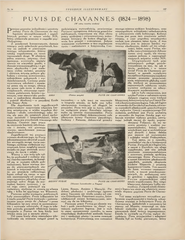 P U V I S DE C H A V A N N E S (1824- 1898) (IV setną rocznicę urodzin) P om im o p o zo ró w jed n o lito śc i i p ro s to ty zad z iw ia ją c ą w y trw ało ścią, p o w ie rz a ją c sta re g o m istrza u ro k iem k ra jo b ra z u , o raz n ależ y P u v is d e C h a v a n n e s d o n a j P uvisow i u p rag n io n ą d e k o ra c ję g m ach ó w n iep o sp o lity m w d zięk iem i szlac h etn o ścią b a rd ziej sk o m p lik o w an y ch i z a g a d p u b lic zn y c h , ro z p o c z y n a się d la ń o k re s w o d tw o rz e n iu ciała k o b ie c e g o . K o lo ry t ko w y ch p o staci w sztu ce w iek u X IXp, ra c y sp o k o jn e j i zró w n o w a ż o n ej, je d n o P u v isa je s t p o z a tem n ieró w n ie s u b te l k tó ra o b fito w ała p rz e c ie ż w z a g a d k i p sy sta jn ie trw a ją c y d o k o ń c a d łu g ieg o ży niejszy , a c za r p o g o d n ej um ysłow ości w o ta bez p rz ejść i w strząśn ień . Je d y n e n a d a je ty m o b razo m tę tn o życia. Z tem chologicznew szy stk iem je s t to jeszcze b a rd z o w y Z p rz e k o n a ń k o n se rw a ty sta , dum nie w ażn iejsze w y d arzen ie w te m re g u larn e m no szący sw ój szla c h e c k i p rzy d o m ek , kro życiu — m a łż e ń stw o z k się żn ic z k ą C an- tw o rn y ak ad em izm , d a le k i o d te j o d rę b ności, k tó ra cz y n i P u v is a nieczy on je d n a k w pierw szy m ty lk o n a jw y b itn ie jsz y m d e k o ra sze re g u refo rm ato ró w , k tó rz y to rem sw ej ep o k i, a le ró w n o sz tu k ę w sp ó łczesn ą n a now e cześnie jed n y m z n ajo ry g in al Wprowadzili drogi. W o b ejściu n iejszy ch a rty stó w w ieku X IX . p ełen rezerw y , sztyw ny, ch o ć O r y g i n a l n o ś ć ty c h p ra c u p rzejm y, w y n i o s ł y , z a p ię ty p ó źn iejszy ch p o le g a p rzed ezaw sze n a w szystkie guziki, z w sz y stk ie m na tem , że jak w dum nie w zniesioną głow ą i z ge stem a k a d e m ik a — je st m ala życiu, p o d o b n ie i w sztu ce u m iał P u v is d e C h av an n es p o rzem cich e j rad o ści, p ro sto ty łą c z y ć w sp o só b w yjątkow o i u bóstw a, arty stą , p ełn y m g łę szczęśliw y i h arm o n ijn y n a js k ra j b o k ie j i rzew n ej u czuciow o ści, n iejsze p o z o rn ie p rz eciw ień m iłośnikiem p o k o rn y c h i w y stw a, m ian o w icie g łę b o k ą cześć dz ied z iczo n y ch . C zczony przez d la tra d y c ji ze zro zu m ieniem w yw rotow ą m łodzież i uw aża n a jn o w szy c h z d o b y c zy sztuki, ny p rz e z nią za sw ego, o b ra c a w y ra ź n y arc h a iz m ze z d e c y się p rzez c a łe życie w sferach d o w an y m m o d ern izm em . u rz ę d o w y c h , o trzy m u jąc zam ó Jak to b y ło z azn aczo n e, je s t w ienia p ań stw o w e, k rz y ż e i z a (Ratusz paryski) PU V IS D E C H A V A N N E S sztu k a P u v isa w za ło ż e n iu sw em szczy ty , o raz stan o w isk o p ro fe ZIM A d alszy m ciąg iem ow ej tra d y c ji so ra w n a jb a rd z ie j sk o stn iałe j z p o śró d ak ad em ij — w p a ry sk iej E co le ta c o u se n e ■— o ty le tra c i n a zn aczen iu k lasy c z n e j, k tó re j tw ó rcą b y ł w e F ran cji D a w biografji arty sty , że b y ło o n o ty lk o v id , a k o n ty n u a to re m Ingres. T a k , jak Ingres d e s B e a u x -A rts . D la d o p e łn ie n ia ty ch z a g a d k o w y c h u św ięcen iem trw a ją c e j o d d łu g ich lat w sto su n k u d o D av id a b y ł a rc h aistą , o d w zo p rzeciw ień stw rozp o czy n a w łaściw ą kar- p rzy jaźn i. P o z a tem je s t to ży cie , o d d a ru rzy m sk ich p ła sk o rz e ź b p rzech o d zący m je rę arty sty c z n ą w w ieku z u p e łn ie d o j n e w y łączn ie p ra cy . R e z u lta ty tak ieg o d o w pły w ó w G re c ji i w cześn iejszeg o O d rz a ły m — o k o ło c z te rd z ie ste g o roku ży try b u są isto tn ie m o n u m e n ta ln e . P u v is ro d zen ia, p o d o b n ie je s t P u v is arc h a istą cia, a le zato do o sta tn ic h chw il z a c h o p o k ry ł m alo w id łam i d e k o ra c y jn e m i c ałe w sto su n k u do ln g re sa. S ztu k a jego w y w uje św ieżo ść i b ezp o śre d n io ść , k tó ra olb rzy m ie ściany P a n te o n u p a ry sk ieg o , k a z u je w y ra ź n e w p ły w y g re c k ie , n aw ią p o z y sk u je m u przy d o m ek w ieczn eg o m ło S o rb o n y i R atu sz a, d e k o ro w a ł g m ach y zu jąc je d n a k raczej d o ep o k i, p o p rz e d zieńca. O sta tn ie je g o p ra c e d zają cej F id ja sz a ; d o te j su są nierów nie b ard ziej m ło d zień row ej p ro s to ty i w ażk iej m o cze i św ieże, niż p ierw sze n u m en taln o ści, k tó re j o d p o u tw o ry , n acech o w an e je szc z e w ied n ik iem je s t w a rc h ite k tu rz e akadem izm em . sty l do ry ck i i k tó ra d a lek a Z a g a d k o w o ś ć te j p o s t a c i je st jesz c ze o d w ytw orności w z ra sta sk utkiem tego , że P u v is i w d zięk u sztu k i P ra k sy te le sa . ja k n a jsta ra n n ie j u k ry w ał w szel T o ż sam o, co o ry su n k u , k ie sz czeg ó ły sw ego życia o so pow ied zieć się d a o kom pozycji bistego, u n ik a ją c zw łaszcza wyP u v isa. Z w ią z e k jej z Ingres em , w nętrzeń, k tó re m o g ły b y rzu cić a n aw et z D a v id e m. n ie u leg a św iatło n a je g o sto su n e k u czu w ątpliw ości, je st o n a je d n a k ciow y d o ży cia i sztuki. n ieró w n ie m o n u m en ta ln iejsza W iem y o nim te d y ty le ty l i su ro w sza, p o sia d a sp o k o jn ą ko, że p o c h o d z ił z ro d zin y s ta rów n o w ag ę fry zu P a n t e o n u , rej i b a rd z o zam o żn ej, że k sz ta ł a n aw et h ie ra ty z m p ła sk o rz e ź b cił się w w yższej szk o le poli egipskich, p o sia d a sk u p ie n ie tech n iczn ej, k tó ra o tw iera d ro fresków M asaccia i p ro s to tę g ę d o p ie rw szo rzęd n y ch sta k o m p o zy cji G io tta. T e n n aw ró 