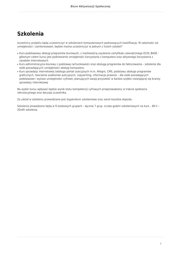 Biuro Aktywizacji Społecznej Szkolenia Uczestnicy projektu będą uczestniczyć w szkoleniach komputerowych podnoszących kwalifikację. W zależności od umiejętności i zainteresowań, będzie można uczestniczyć w jednym z trzech szkoleń” ● ● ● Kurs podstawowy obsługi programów biurowych, z możliwością uzyskania certyfikatu zewnętrznego ECDL BASE głównym celem kursu jest podniesienie umiejętności korzystania z komputera oraz aktywnego korzystania z zasobów internetowych Kurs administracyjno-biurowy z podstawą rachunkowości oraz obsługą programów do fakturowania – szkolenie dla osób posiadających umiejętności obsługi komputera. Kurs sprzedaży internetowej (obsługa portali aukcyjnych m.in. Allegro, CMS, podstawy obsługo programów graficznych, tworzenie szablonów aukcyjnych, copywriting, informacje prawne) – dla osób posiadających podstawowe i wyższe umiejętności cyfrowe, planujących swoją przyszłość w bardzo szybko rozwijającej się branży sprzedaży internetowej Na wybór kursu wpływać będzie wynik testu kompetencji cyfrowych przeprowadzany w trakcie spotkania rekrutacyjnego oraz decyzja uczestnika. Za udział w szkoleniu przewidziane jest stypendium szkoleniowe oraz zwrot kosztów dojazdu. Szkolenia prowadzone będą w 9 osobowych grupach – łącznie 7 grup. Liczba godzin szkoleniowych na kurs – 80 h – 20x4h szkolenia. 1