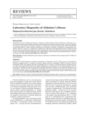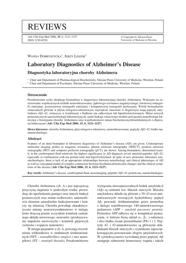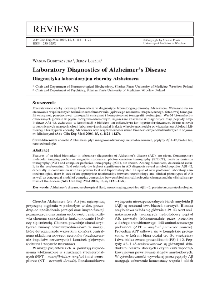 Słowa kluczowe: choroba Alzheimera, płyn mózgowo−rdzeniowy, neuroobrazowanie, peptydy Aβ1−42, białko tau,