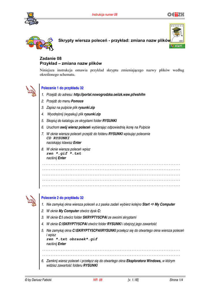 Instrukcja numer 08 Skrypty wiersza poleceń - przykład: zmiana nazw plików Zadanie 08 Przykład – zmiana nazw plików Niniejsza instrukcja omawia przykład skryptu zmieniającego nazwy plików według określonego schematu. Polecenie 1 do przykładu 32 1. Przejdź do adresu: http://portal.nowogrodzka.oeiizk.waw.pl/wshifm 2. Przejdź do menu Pomoce 3. Zapisz na pulpicie plik rysunki.zip 4. Wyodrębnij (wypakuj) plik rysunki.zip 5. Skopiuj do katalogu ze skryptami folder RYSUNKI 6. Uruchom swój wiersz poleceń wybierając odpowiednią ikonę na Pulpicie 7. W oknie wiersza poleceń przejdź do folderu RYSUNKI wpisując polecenie CD RYSUNKI naciskając klawisz Enter 8. W oknie wiersza poleceń wpisz ren *.gif *.txt naciśnij Enter .................................................................................. .................................................................................. .................................................................................. .................................................................................. .................................................................................. Polecenie 2 do przykładu 32 1. Nie zamykaj okna wiersza poleceń a z paska zadań wybierz kolejno Start My Computer 2. W oknie My Computer otwórz dysk C: 3. W oknie C:\ otwórz folder SKRYPTY5CPAI ze swoimi skryptami 4. W oknie C:\SKRYPTY5CPAI otwórz folder RYSUNKI i obejrzyj jego zawartość 5. Nie zamykaj okna C:\SKRYPTY5CPAI\RYSUNKI przełącz się do otwartego okna wiersza poleceń i wpisz ren *.txt obrazek*.gif naciśnij Enter .................................................................................. .................................................................................. 6. Zamknij wiersz poleceń i przełącz się do otwartego okna Eksploratora Windows, w którym widzisz zawartość folderu RYSUNKI © by Dariusz Fabicki NR 08 [v. 1.1B] Strona 1/4 Skrypty wiersza poleceń - przykład: zmiana nazw plików Wskazówka – działanie polecenia : ren *.txt obrazek*.gif Polecenie ren *.txt obrazek*.gif zadziała zależnie od nazw plików, jakie znajdują się w bieżącym katalogu. Mianowicie: - jeśli nazwa pliku jest krótsza, niż nazwa obrazek – wówczas zamienione zostanie tyle znaków, ile zawiera oryginalna nazwa pliku z dopełnieniem do zmienianej nazwy. Na przykład: gucio.txt obrazek.gif - jeśli nazwa pliku jest dłuższa, niż nazwa obrazek, wówczas zamienione zostanie tyle liter, ile zawiera obrazek, a reszta nazwy pozostanie bez zmian. Na przykład: bluebetkazielona.txt obrazekkazielona.gif - zawsze, niezależnie od nazwy oryginalnej, w pełni zostanie zamienione rozszerzenie pliku. - jeżeli istnieje plik o nazwie takiej, jak nazwa na którą chcemy zmienić nazwę innego pliku, wówczas polecenie ren nie wykona zamiany. Polecenie 3 do przykładu 32 1. W oknie Eksploratora Windows przejdź do folderu nadrzędnego i usuń folder RYSUNKI z folderu ze swoimi skryptami (nie usuwaj swojego folderu ze skryptami !!!) 2. Skopiuj ponownie do katalogu ze skryptami folder RYSUNKI ze szkoleniowej płyty CD 3. Przejdź do folderu, który został skopiowany 4. W oknie Eksploratora Windows wybierz z menu Edycja Zaznacz wszystko 5. Upewnij się, że zaznaczyłeś wszystkie rysunki. Ile rysunków zostało zaznaczonych .................................................................................. 6. W oknie Eksploratora Windows wybierz prawym przyciskiem myszy pierwszy zaznaczony rysunek. 7. Z menu podręcznego wybierz opcję Zmień nazwę 8. Wpisz nazwę hipopotam (1).gif tak, między hipopotam a (1) jest znak spacji. Naciśnij klawisz ENTER, aby zatwierdzić zmianę .................................................................................. Polecenie 4 do przykładu 32 9. W oknie Eksploratora Windows wybierz z menu Edycja Zaznacz wszystko 10. Upewnij się, że zaznaczyłeś wszystkie rysunki. Ile rysunków zostało zaznaczonych .................................................................................. 11. W oknie Eksploratora Windows wybierz prawym przyciskiem myszy pierwszy zaznaczony rysunek. 12. Z menu podręcznego wybierz opcję Zmień nazwę 13. Wpisz nazwę hipopotam (301).gif tak, między hipopotam a (301) jest znak spacji. Naciśnij klawisz ENTER, aby zatwierdzić zmianę .................................................................................. 14. Nie zamykaj okna Eksploratora Windows © by Dariusz Fabicki NR 08 [v. 1.1B] Strona 2/4 Skrypty wiersza poleceń - przykład: zmiana nazw plików Polecenie 5 do przykładu 32 1. Z paska zadań serwera wybierz kolejno Start Wiersz poleceń 2. Przejdź do swojego folderu ze skryptami wpisując polecenie CD <nazwa_katalogu> i wciskając klawisz Enter 3. W oknie wiersza poleceń wpisz SET liczba1=30 naciśnij Enter 4. W oknie wiersza poleceń wpisz SET liczba2=20 naciśnij Enter 5. W oknie wiersza poleceń wpisz SET wynik=%liczba1%+%liczba2% naciśnij Enter 6. W oknie wiersza poleceń wpisz ECHO %wynik% naciśnij Enter .................................................................................. .................................................................................. .................................................................................. 7. W oknie wiersza poleceń wpisz SET /A wynik=%liczba1%+%liczba2% naciśnij Enter 8. W oknie wiersza poleceń wpisz ECHO %wynik% naciśnij Enter .................................................................................. .................................................................................. \ Polecenie 6 do przykładu 32 1. W oknie Eksploratora Windows przejdź do folderu nadrzędnego i usuń folder RYSUNKI z folderu ze swoimi skryptami (nie usuwaj swojego folderu ze skryptami !!!) 2. Skopiuj ponownie do katalogu ze skryptami folder RYSUNKI ze szkoleniowej płyty CD 3. Przepisz przykład 32 i zapisz go pod nazwą p32.cmd w folderze RYSUNKI 4. Uruchom swój wiersz poleceń wybi