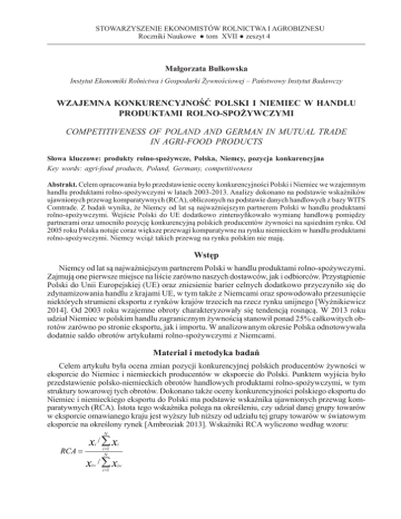 STOWARZYSZENIE I AGROBIZNESU Wzajemna konkurencyjnośćEKONOMISTÓW Polski i Niemiec wROLNICTWA handlu produktami rolno-spożywczymi Roczniki Naukowe ● tom XVII ● zeszyt 4 63 Małgorzata Bułkowska Instytut Ekonomiki Rolnictwa i Gospodarki Żywnościowej – Państwowy Instytut Badawczy WZAJEMNA KONKURENCYJNOŚĆ POLSKI I NIEMIEC W HANDLU PRODUKTAMI ROLNO-SPOŻYWCZYMI COMPETITIVENESS OF POLAND AND GERMAN IN MUTUAL TRADE IN AGRI-FOOD PRODUCTS Słowa kluczowe: produkty rolno-spożywcze, Polska, Niemcy, pozycja konkurencyjna Key words: agri-food products, Poland, Germany, competitiveness Abstrakt. Celem opracowania było przedstawienie oceny konkurencyjności Polski i Niemiec we wzajemnym handlu produktami rolno-spożywczymi w latach 2003-2013. Analizy dokonano na podstawie wskaźników ujawnionych przewag komparatywnych (RCA), obliczonych na podstawie danych handlowych z bazy WITS Comtrade. Z badań wynika, że Niemcy od lat są najważniejszym partnerem Polski w handlu produktami rolno-spożywczymi. Wejście Polski do UE dodatkowo zintensyfikowało wymianę handlową pomiędzy partnerami oraz umocniło pozycję konkurencyjną polskich producentów żywności na sąsiednim rynku. Od 2005 roku Polska notuje coraz większe przewagi komparatywne na rynku niemieckim w handlu produktami rolno-spożywczymi. Niemcy wciąż takich przewag na rynku polskim nie mają. Wstęp Niemcy od lat są najważniejszym partnerem Polski w handlu produktami rolno-spożywczymi. Zajmują one pierwsze miejsce na liście zarówno naszych dostawców, jak i odbiorców. Przystąpienie Polski do Unii Europejskiej (UE) oraz zniesienie barier celnych dodatkowo przyczyniło się do zdynamizowania handlu z krajami UE, w tym także z Niemcami oraz spowodowało przesunięcie niektórych strumieni eksportu z rynków krajów trzecich na rzecz rynku unijnego [Wyżnikiewicz 2014]. Od 2003 roku wzajemne obroty charakteryzowały się tendencją rosnącą. W 2013 roku udział Niemiec w polskim handlu zagranicznym żywnością stanowił ponad 25% całkowitych obrotów zarówno po stronie eksportu, jak i importu. W analizowanym okresie Polska odnotowywała dodatnie saldo obrotów artykułami rolno-spożywczymi z Niemcami. Materiał i metodyka badań Celem artykułu była ocena zmian pozycji konkurencyjnej polskich producentów żywności w eksporcie do Niemiec i niemieckich producentów w eksporcie do Polski. Punktem wyjścia było przedstawienie polsko-niemieckich obrotów handlowych produktami rolno-spożywczymi, w tym struktury towarowej tych obrotów. Dokonano także oceny konkurencyjności polskiego eksportu do Niemiec i niemieckiego eksportu do Polski ma podstawie wskaźnika ujawnionych przewag komparatywnych (RCA). Istota tego wskaźnika polega na określeniu, czy udział danej grupy towarów w eksporcie omawianego kraju jest wyższy lub niższy od udziału tej grupy towarów w światowym eksporcie na określony rynek [Ambroziak 2013]. Wskaźniki RCA wyliczono według wzoru: N RCA = xi / ∑ xi i =1 N x /∑x iw iw i =1 iw iw 64 Małgorzata Bułkowska gdzie: RCAij – wskaźnik ujawnionych przewag komparatywnych w polskim/niemieckim eksporcie i-tej grupy produktów na j-ty rynek, Xij – polski/niemiecki eksport i-tej grupy produktów (tutaj: produkty rolno-spożywcze ogółem oraz według działów HS) na j-ty rynek, Xiw – światowy eksport i-tej grupy produktów na j-ty rynek, N – liczba grup produktów (cały eksport). Wartość wskaźnika wyższa niż 1,0 oznacza, że udział eksportu artykułów rolno-spożywczych w eksporcie ogółem analizowanego kraju na określony rynek jest większy niż ich udział w światowym eksporcie ogółem na ten rynek, natomiast niższa od 1,0 sytuację odwrotną. Wartości wskaźnika większe niż 1,0 świadczą o ujawnionej przewadze komparatywnej badanego państwa. Badaniem objęto produkty rolno-spożywcze ogółem, tj. działy 01-24 Zharmonizowanego Systemu Oznaczania i Kodowania Towarów HS. Analizę przeprowadzono wykorzystując dane handlowe z bazy danych WITS-Comtrade, wyrażone w USD [Szczepaniak 2013]. Analizą objęto lata 2003-2013, przy czym w większości przypadków porównywane były lata skrajne. Rozwój handlu zagranicznego produktami rolno-spożywczymi między Polską i Niemcami W latach 2003-2013 wartość polskiego eksportu produktów rolno-spożywczych do Niemiec systematycznie rosła i w 2013 roku osiągnęła wartość 6,2 mld USD, tj. 5,5-krotnie wyższą niż w 2003 roku (rys. 1). Wyjątkiem był rok 2009, w którym na skutek światowego kryzysu gospodarczego nastąpił spadek wartości polskiego eksportu rolno-spożywczego do Niemiec o 14%. Od 2010 roku ponownie jednak ma miejsce trend wzrostowy. Podobne tendencje zmian cechowały polski import rolno-spożywczy z Niemiec. Po dynamicznym wzroście wartości przywozu w latach 2003-2008, w 2009 roku nastąpiło wyraźne zmniejszenie dostaw niemieckiej żywności do Polski, po czym od 2010 roku dostawy te systematycznie rosły. Wzrost wartości importu rolno-spożywczego z Niemiec, który nastąpił w latach 2003-2013, był dużo większy niż eksportu rolno-spożywczego do Niemiec (ośmiokrotny, w 2013 roku wyniósł on 4,2 mld USD). Jednak w latach 2003-2013 Polska notowała dodatnie saldo obrotów handlowych produktami rolno-spożywczymi z Niemcami. W 2013 roku wyniosło ono 2 mld USD i było prawie 3,5-krotnie wyższe niż w 2003 roku (rys. 1). Przed akcesją Polski do UE, jak również po 2004 roku, prawie 25% polskiego eksportu rolno-spożywczego było kierowane na rynek niemiecki (w 2003 roku – 25%, a w 2013 roku – 23%). Zupełnie inaczej przedstawiała się sytuacja w imporcie. W 2003 roku z Niemiec pochodziło tylko 14% sprowadzanych przez Polskę produktów rolno-żywnościowych, jednak po akcesji rola Niemiec jako eksportera produktów żywnościowych na rynek polski systematycznie się zwiększała. W 2013 roku udział Niemiec w imporcie rolno-spożywczym Polski ukształtował się na poziomie 2