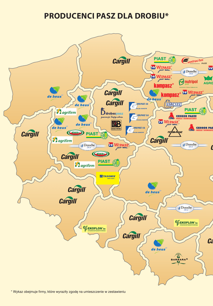 Producenci Pasz dla drobiu* * Wykaz obejmuje firmy, które wyraziły zgodę na umieszczenie w zestawieniu tel. (87) 424 17 60 fax (87) 424 17 99 Infolinia: 0801 304811 www.agrocentrum.pl Wytwórnia Pasz w Szamotułach tel. (61) 293 19 84 Wytwórnia Pasz w Topoli Wielkiej tel. (62) 593 00 11 Wytwórnia Pasz w Margońskiej Wsi tel. (67) 284 72 64 www.agrifirm.pl Buk - tel. (61) 814 02 09 Grodzisk Wlkp. - tel. (61) 444 57 32 Iłowo - tel. (23) 654 15 27 Łęczyca - tel. (24) 721 04 00 fax (24) 721 04 04 Łomża - tel. (86) 473 70 20 Mieścisko - tel. (61) 427 89 12 Spytkowice - tel. (33) 841 04 10 Wałcz - tel. (67) 258 32 76 www.deheus.pl tel. (62) 753 87 00 fax (62) 753 87 07 Dossche o/Sandomierz tel. (15) 832 22 58 Dossche o/Rychliki tel. (55) 248 84 31 Dossche o/Maków Mazowiecki tel. (29) 717 32 30 www.dossche.pl tel. (52) 326 74 00 fax (52) 326 74 02 www.drobexpasz.com.pl Wytwórnia Pasz i Koncentratów w Inowrocławiu tel. (52) 353 77 12 fax (52) 352 74 82 tel. (23) 675 03 30 fax (23) 675 03 63 www.cedrobpasze.pl tel. (89) 761 60 19 tel./fax (89) 761 62 63 www.contractus.pl Wytwórnia Pasz w Olsztynku tel. (89) 544 36 09, 10, 11 fax (89) 544 36 29 www.nutripol.pl tel. (23) 696 63 23 (23) 696 81 92 www.paszmark.pl Wytwórnia Pasz w Turzy tel. (14) 653 13 00 fax (14) 653 13 03 www.barbara.pl Ropczyce – tel. (48) 17 222 97 00/01 Sierpc – tel. (48) 24 2 75 87 00/01 Krzemieniewo – tel. (48) 65 536 11 00/01 Brzozowo – tel. (48) 56 667 11 42 Świecie – tel. (48) 52 331 03 00 Dobrzelin – tel. (48) 24 285 28 35 Białystok – tel. (48) 85 663 72 62 Bieganów – tel. (48) 68 391 04 06 Krzepice – tel. (48) 34 310 71 00 Siedlce – tel. (48) 25 640 23 95/96 Pruszcz Gd. – tel. (48) 58 692 96 00/01 Skokowa – tel. (48) 71 312 66 65 Ujazd Dolny – tel. (48) 76 874 03 12 Jarosław – tel. (48) 16 621 40 51 Tworóg – tel. (48) 32 381 81 30 www.cargill.com.pl Zakład nr 1 CHRZAN tel. (62) 740 36 37, 740 36 38 fax (62) 740 30 38 Zakład nr 2 KUNOWO tel. (61) 295 00 00 fax (61) 295 00 75 www.neorol.com.pl Wytwórnia Pasz w Grabkach tel. (41) 354 51 69 fax (41) 312 10 89 Wytwórnia Pasz w Baborowie tel. (77) 406 23 56, 472 40 09 fax (77) 403 68 30 www.ekoplon.pl Wytwórnia Pasz Lewkowiec tel. (62) 736 02 34, 735 44 30 Wytwórnia Pasz Płońsk tel. (23) 661 34 80 Wytwórnia Pasz Gołańcz tel. (67) 261 51 16 Wytwórnia Pasz Oleśno tel. (55) 231 42 45 www.wp-piast.pl tel. (62) 767 67 67 Biskupice Ołoboczne www.tasomix.pl tel/fax (23) 661 10 13, 661 18 93 661 19 88 www.fermpasz.pl Golub-Dobrzyń tel/fax (56) 683 51 11 do 17 Wytwórnia Pasz w Janowcu Wlkp. tel. (52) 302 31 53 Wytwórnia Pasz w Radominie tel. (56) 683 75 68 www.golpasz.pl Iława tel. (89) 648 74 41 Mszanowo tel. (56) 474 07 91 www.kompasz.pl centrala: tel. (89) 543 56 50 fax (89) 543 56 52 biuro obsługi klienta: tel. (89) 543 56 56 WYTWÓRNIE • Wadąg 9, 10-373 Olsztyn • Morąg, ul. Wojska Polskiego 35, 14-300 Morąg • Krosno, 14-400 Pasłęk • Międzyrzec Podlaski, ul. Kościuszki 103 21-560 Międzyrzec Podlaski • Koło, ul. Składowa 21, 62-600 Koło ––––––––––––––––––––––––––––––––––––––––– • Gałwuny, Magazyn Zbożowy/Punkt Skupu ul. Gałwuny 19A, 11-400 Kętrzyn • Mława, Zakład Drobiarski ul. Instalatorów 2, 06- 500 Mława www.wipasz.pl WS – Trade Wojciech Sadurski tel/fax (81) 881 62 80 tel. kom. 504 082 108 e-mail: [email protected] www.wstrade.pl Producenci Pasz dla drobiu (3) aGrocenTruM sp. z o.o. 18-500 Kolno, ul. Kolejowa 1 12-200 Pisz, Kałęczyn 8 tel. (87) 424 17 60, fax (87) 424 17 99 infolinia: 0801 304811 www.agrocentrum.pl e-mail: [email protected] Pisz Kolno W ofercie posiadamy mieszanki pełnoporcjowe i koncentraty dla: 1. Kurcząt brojlerów 4. indyków brojlerów 2. Kurcząt i niosek reprodukcyjnych 5. indyków reprodukcyjnych 3. Kur niosek (jaja konsumpcyjne) 6. drobiu wodnego Programy żywieniowe Agrocentrum dla wyżej wymienionych gatunków drobiu przygotowane są na bazie wieloletnich doświadczeń firmy, współpracy z najlepszymi krajowymi i zagranicznymi specjalistami. Nasze produkty zabezpieczają optymalny wzrost drobiu i osiągnięcie satysfakcjonujących wyników produkcyjnych. Produkcja odbywa się w jednej z najnowocześniejszych wytwórni pasz w Polsce. Wykorzystanie w produkcji najnowszych rozwiązań technologicznych i produkcja w oparciu o System Zarządzania Bezpieczeństwem Żywności wg EN ISO 22000: 2005 gwarantuje bezpieczeństwo produktów i ich powtarzalną wysoką jakość. Do dyspozycji naszych klientów są wykwalifikowani doradcy żywieniowi i lekarze weterynarii, których zadaniem jest pomoc klientom w uzyskaniu bardzo dobrych wyników produkcyjnych. ZAPRASZAMY DO WSPÓ ŁPRACY agrifirm Polska sp. z o.o. ul. b. chrobrego 52, 64-500 szamotuły tel. (61) 29 31 970, fax (61) 29 22 369 e-mail: [email protected] www.agrifirm.pl agrifirm Polska jestczęściąroyal agrifirm Group,międzynarodowegoprzedsiębiorstwa oferującegokompleksowerozwiązaniadlarynkurolnego,zarównodlahodowcówroślin, jaki zwierząt.Głównasiedzibagrupyagrifirm mieścisięw Apeldoornw Holandii, a filiezlokalizowanesąw 10krajachEuropyorazw Chinach.Paszedlazwierzątprodukowanesą w 18zakładachna terenieHolandii,Niemiec,Belgii,PolskiorazWęgier. Margońska Wieś szamotuły Topola Wielka W agrifirm Polska specjalizujemysięw produkcjiefektywnychprogramówżywieniazwierząt,główniedla drobiu,trzodychlewnejorazbydła.Dysponujemynowoczesnymiwytwórniamizlokalizowanymiw Wielkopolsce w miejscowościach:Szamotuły,TopolaWielkaorazMargońskaWieś.Procesprodukcyjnyprowadzonyjestzgodnie z międzynarodowymistandardamiISO,HACCPorazGMP+B1,a każdapaszapoddawanajestszczegółowejkontrolijakości. Naszeproduktydostarczamybezpośredniona fermyhodowlanejaki za pośrednictwemsiecidealerów. Misjąagrifirm Polska jestkreowanienajwyższychwartościdlaklientów.Robimytopoprzezzrównoważonewytwarzanieefektywnych koncep