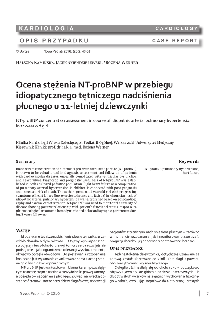 KARDIOLOGIA CARDIOLOGY O P I S P R Z Y PA D K U © Borgis CASE REPORT Nowa Pediatr 2016; (20)2: 47-52 Halszka Kamińska, Jacek Skiendzielewski, *Bożena Werner Ocena stężenia NT-proBNP w przebiegu idiopatycznego tętniczego nadciśnienia płucnego u 11-letniej dziewczynki NT-proBNP concentration assessment in course of idiopathic arterial pulmonary hypertension in 11-year old girl Klinika Kardiologii Wieku Dziecięcego i Pediatrii Ogólnej, Warszawski Uniwersytet Medyczny Kierownik Kliniki: prof. dr hab. n. med. Bożena Werner Summary Key wo rd s Blood serum concentration of N-terminal pro brain natriuretic peptide (NT-proBNP) is known to be valuable tool in diagnosis, assessment and follow up of patients with cardiovascular diseases, especially complicated with ventricular dysfunction and heart failure. Diagnostic and prognostic usefulness of NT-proBNP was established in both adult and pediatric population. Right heart failure as a complication of pulmonary arterial hypertension in children is connected with poor prognosis and increased risk of death. The authors present 11-year old girl with progressing symptoms of heart failure (low exercise tolerance and fatigue) in whom diagnosis of idiopathic arterial pulmonary hypertension was established based on echocardiography and cardiac catheterization. NT-proBNP was used to monitor the severity of disease showing positive relationship with patient’s functional status, response to pharmacological treatment, hemodynamic and echocardiographic parameters during 3 years follow-up. Wstęp Idiopatyczne tętnicze nadciśnienie płucne to rzadka, przewlekła choroba o złym rokowaniu. Objawy wynikające z postępującej niewydolności prawej komory serca rozwijają się podstępnie – jako ograniczenie tolerancji wysiłku, omdlenia, okresowo obrzęki obwodowe. Do postawienia rozpoznania konieczne jest wykonanie cewnikowania serca z oceną średniego ciśnienia krwi w pniu płucnym. NT-proBNP jest wartościowym biomarkerem pozwalającym na ocenę stopnia nasilenia niewydolności prawej komory, a pośrednio – nadciśnienia płucnego. Z uwagi na wysoką dostępność stanowi istotne narzędzie w długofalowej obserwacji Nowa Pediatria 2/2016 NT-proBNP, pulmonary hypertension, hart failure pacjentów z tętniczym nadciśnieniem płucnym – zarówno w momencie rozpoznania, jak i monitorowaniu zaostrzeń, progresji choroby i jej odpowiedzi na stosowane leczenie. Opis przypadku Jedenastoletnia dziewczynka, dotychczas uznawana za zdrową, została skierowana do Kliniki Kardiologii z powodu obniżonej tolerancji wysiłku fizycznego. Dolegliwości nasilały się od około roku – początkowo objawy ujawniały się głównie podczas intensywnych lub długotrwałych wysiłków na zajęciach wychowania fizycznego w szkole, ewoluując stopniowo do nietolerancji prostych 47 Halszka Kamińska, Jacek Skiendzielewski, Bożena Werner czynności domowych. Z tego powodu dziewczynka była konsultowana kardiologicznie i skierowano ją do pilnej diagnostyki w warunkach szpitalnych. Przy przyjęciu do Kliniki Kardiologii stan dziecka był dość dobry; nie obserwowano duszności, częstość oddechów wynosiła 17/min; saturacja w pomiarze przezskórnym 98-99%. Uwagę zwracały: niska w stosunku do wzrostu masa ciała (BMI 15 kg/m2) i bladość powłok skórnych. Stwierdzono wyraźne uwypuklenie okolicy przedsercowej z przemieszczeniem hiperkinetycznego uderzenia koniuszkowego serca w prawo, czynność serca miarowa 85/min, w polu osłuchiwania zastawki płucnej silnie akcentowany II ton serca, cichy szmer skurczowy w II międzyżebrzu przy lewym brzegu mostka. Dziewczynka wyraźnie unikała aktywności fizycznej, nie przejawiała chęci do opuszczania łóżka szpitalnego. W wykonanych przy przyjęciu badaniach laboratoryjnych nie obserwowano istotnych odchyleń w zakresie morfologii i biochemii, jonogramu, koagulogramu ani panelu enzymów sercowych, natomiast stężenie NT-proBNP było podwyższone do 22 270 pg/ml (przy normie do 125 pg/ml). W zapisie EKG stwierdzono odchylenie osi elektrycznej serca w prawo z cechami powiększenia i przerostu prawej komory serca i powiększenia prawego przedsionka (ryc. 1). W badaniu radiologicznym klatki piersiowej sylwetka serca była znacznie powiększona, wskaźnik sercowo-płucny wynosił 0,62, obraz naczyń krążenia płucnego prawidłowy (ryc. 2). Badaniem echokardiograficznym (ryc. 3) uwidoczniono znaczne powiększenie prawej komory i prawego przedsionka oraz poszerzenie żył systemowych, wątrobowych i pnia płucnego. Zarejestrowano umiarkowaną (II stopnia) niedomykalność zastawki trójdzielnej. Na podstawie prędkości przepływu niedomykalności trójdzielnej obliczono gradient ciśnienia skurczowego pomiędzy prawą komorą a prawym przedsionkiem i oszacowano wartość ciśnienia skurczowego w prawej komorze na 70 mm Hg. Nie zarejestrowano przecieku na poziomie przegród serca ani przewodu tętniczego. Przepływ w pniu płucnym miał wyraźne cechy nadciśnienia płucnego, zarejestrowano I stopnia niedomykalność zastawki płucnej z gradientem ciśnienia rozkurczowego pomiędzy pniem płucnym a prawą komorą do 38 mm Hg. Profil krzywej przepływu Ryc. 1. EKG pacjentki – 50 mm/s – odchylenie osi serca w prawo oraz cechy przerostu prawej komory i prawego przedsionka 48 Ryc. 2. Badanie radiologiczne klatki piersiowej w projekcji AP – powiększona sylwetka serca Ryc. 3. Badanie echokardiograficzne – projekcja 4-jamowa – widoczne powiększenie prawej komory i prawego przedsionka. RV – prawa komora, RA – prawy przedsionek, LV – lewa komora, LA – lewy przedsionek w pniu płucnym wskazywał na nadciśnienie, skrócony czas akceleracji do 74 ms – 22% czasu wyrzutu (331 ms); wychylenie płaszczyzny pierścienia zastawki trójdzielnej (TAPSE) 16 mm. Podczas testu 6-minutowego marszu dziewczynka pokonała dystans 504 m, a w badaniu ergospirometrycznym na cykloergometrze rowerowym stwierdzono znaczne ob
