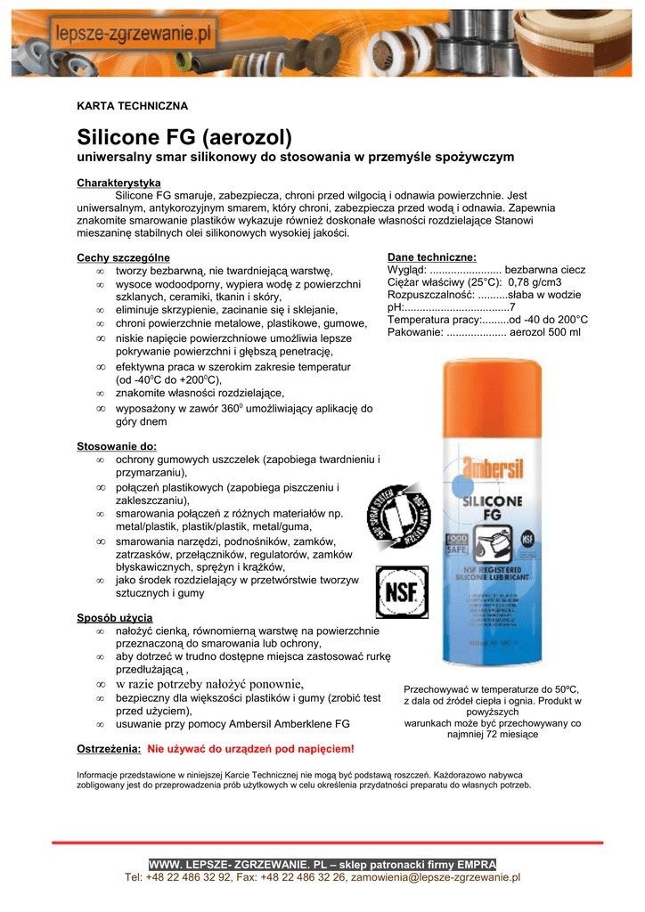 KARTA TECHNICZNA Silicone FG (aerozol) uniwersalny smar silikonowy do stosowania w przemyśle spożywczym Charakterystyka Silicone FG smaruje, zabezpiecza, chroni przed wilgocią i odnawia powierzchnie. Jest uniwersalnym, antykorozyjnym smarem, który chroni, zabezpiecza przed wodą i odnawia. Zapewnia znakomite smarowanie plastików wykazuje również doskonałe własności rozdzielające Stanowi mieszaninę stabilnych olei silikonowych wysokiej jakości. Cechy szczególne • tworzy bezbarwną, nie twardniejącą warstwę, • wysoce wodoodporny, wypiera wodę z powierzchni szklanych, ceramiki, tkanin i skóry, • eliminuje skrzypienie, zacinanie się i sklejanie, • chroni powierzchnie metalowe, plastikowe, gumowe, • niskie napięcie powierzchniowe umożliwia lepsze pokrywanie powierzchni i głębszą penetrację, • efektywna praca w szerokim zakresie temperatur (od -400C do +2000C), • znakomite własności rozdzielające, • wyposażony w zawór 3600 umożliwiający aplikację do góry dnem Dane techniczne: Wygląd: ........................ bezbarwna ciecz Ciężar właściwy (25°C): 0,78 g/cm3 Rozpuszczalność: ..........słaba w wodzie pH:...................................7 Temperatura pracy:.........od -40 do 200°C Pakowanie: .................... aerozol 500 ml Stosowanie do: • ochrony gumowych uszczelek (zapobiega twardnieniu i przymarzaniu), • połączeń plastikowych (zapobiega piszczeniu i zakleszczaniu), • smarowania połączeń z różnych materiałów np. metal/plastik, plastik/plastik, metal/guma, • smarowania narzędzi, podnośników, zamków, zatrzasków, przełączników, regulatorów, zamków błyskawicznych, sprężyn i krążków, • jako środek rozdzielający w przetwórstwie tworzyw sztucznych i gumy Sposób użycia • nałożyć cienką, równomierną warstwę na powierzchnie przeznaczoną do smarowania lub ochrony, • aby dotrzeć w trudno dostępne miejsca zastosować rurkę przedłużającą , • w razie potrzeby nałożyć ponownie, • bezpieczny dla większości plastików i gumy (zrobić test przed użyciem), usuwanie przy pomocy Ambersil Amberklene FG • Przechowywać w temperaturze do 50ºC, z dala od źródeł ciepła i ognia. Produkt w powyższych warunkach może być przechowywany co najmniej 72 miesiące Ostrzeżenia: Nie używać do urządzeń pod napięciem! Informacje przedstawione w niniejszej Karcie Technicznej nie mogą być podstawą roszczeń. Każdorazowo nabywca zobligowany jest do przeprowadzenia prób użytkowych w celu określenia przydatności preparatu do własnych potrzeb. WWW. LEPSZE- ZGRZEWANIE. PL – sklep patronacki firmy EMPRA Tel: +48 22 486 32 92, Fax: +48 22 486 32 26, [email protected]