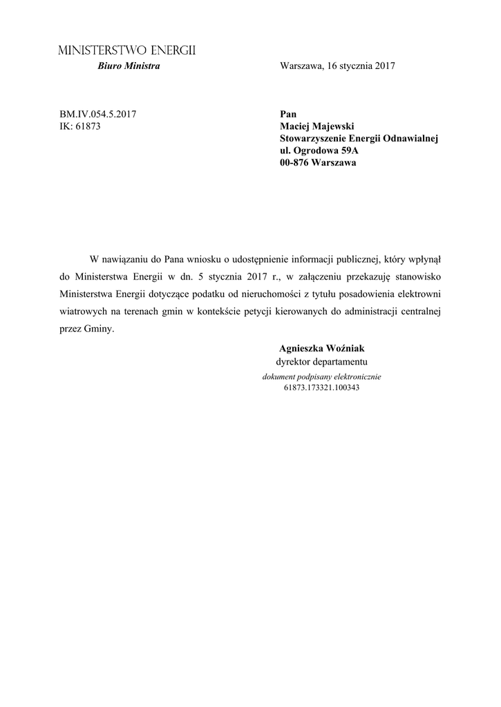 Biuro Ministra BM.IV.054.5.2017 IK: 61873 Warszawa, 16 stycznia