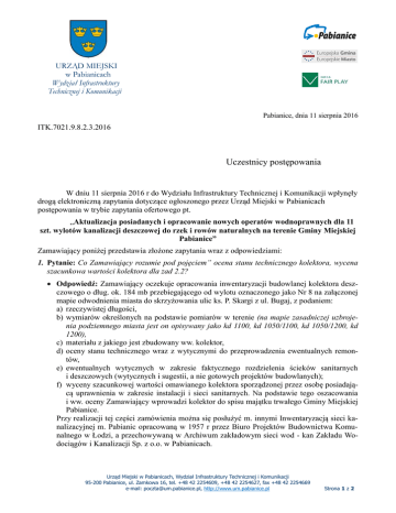 URZĄD MIEJSKI w Pabianicach Wydział Infrastruktury Technicznej i Komunikacji Pabianice, dnia 11 sierpnia 2016 ITK.7021.9.8.2.3.2016 Uczestnicy postępowania W dniu 11 sierpnia 2016 r do Wydziału Infrastruktury Technicznej i Komunikacji wpłynęły drogą elektroniczną zapytania dotyczące ogłoszonego przez Urząd Miejski w Pabianicach postępowania w trybie zapytania ofertowego pt. „Aktualizacja posiadanych i opracowanie nowych operatów wodnoprawnych dla 11 szt. wylotów kanalizacji deszczowej do rzek i rowów naturalnych na terenie Gminy Miejskiej Pabianice” Zamawiający poniżej przedstawia złożone zapytania wraz z odpowiedziami: 1. Pytanie: Co Zamawiający rozumie pod pojęciem” ocena stanu technicznego kolektora, wycena szacunkowa wartości kolektora dla zad 2.2? Odpowiedź: Zamawiający oczekuje opracowania inwentaryzacji budowlanej kolektora deszczowego o dług. ok. 184 mb przebiegającego od wylotu oznaczonego jako Nr 8 na załączonej mapie odwodnienia miasta do skrzyżowania ulic ks. P. Skargi z ul. Bugaj, z podaniem: a) rzeczywistej długości, b) wymiarów określonych na podstawie pomiarów w terenie (na mapie zasadniczej uzbrojenia podziemnego miasta jest on opisywany jako kd 1100, kd 1050/1100, kd 1050/1200, kd 1200), c) materiału z jakiego jest zbudowany ww. kolektor, d) oceny stanu technicznego wraz z wytycznymi do przeprowadzenia ewentualnych remontów, e) ewentualnych wytycznych w zakresie faktycznego rozdzielenia ścieków sanitarnych i deszczowych (wytycznych i sugestii, a nie gotowych projektów budowlanych); f) wyceny szacunkowej wartości omawianego kolektora sporządzonej przez osobę posiadającą uprawnienia w zakresie instalacji i sieci sanitarnych. Na podstawie tego oszacowania i ww. oceny Zamawiający wprowadzi kolektor do spisu majątku trwałego Gminy Miejskiej Pabianice. Przy realizacji tej części zamówienia można się posłużyć m. innymi Inwentaryzacją sieci kanalizacyjnej m. Pabianic opracowaną w 1957 r przez Biuro Projektów Budownictwa Komunalnego w Łodzi, a przechowywaną w Archiwum zakładowym sieci wod - kan Zakładu Wodociągów i Kanalizacji Sp. z o.o. w Pabianicach. Urząd Miejski w Pabianicach, Wydział Infrastruktury Technicznej i Komunikacji 95-200 Pabianice, ul. Zamkowa 16, tel. +48 42 2254609, +48 42 2254627, fax +48 42 2254669 e-mail: [email protected], http://www.um.pabianice.pl Strona 1 z 2 2. Pytanie: Czy Zamawiający posiada pozostałe operaty(czy zostały opracowane dla zadań 2.2, 2.4,2.5,2.8,2.9,2.10,2.11)? Odpowiedź: Nie, wykaz materiałów, które Zamawiający przekaże Wykonawcy w dniu podpisania umowy, jako katalog zamknięty został określony w pkt. 4 Zaproszenia i § 2 projektu umowy. 3. Pytanie: Czy Zamawiający przewiduje wykonanie badań ścieków opadowych dla zadań 2.1,2.2,2.4,2.5,2.8,2.9 Odpowiedź: Nie, odpowiedź wg. zapisów jak dla pytania Nr 2. 4. Pytanie: Czy Zamawiający dysponuje pozostałymi pozwoleniami wodnoprawnymi? Jeśli nie, czy liczy się z koniecznością legalizacji urządzeń wodnych i kosztami? Odpowiedź: Nie, na pierwszą część pytania. Tak, Zamawiający zmierza do legalizacji urządzeń wodnych. Harmonogram realizacji ewentualnych działań (dostosowanych do możliwości budżetowych Zamawiającego) będą przedmiotem negocjacji pomiędzy organem wydającym decyzję pozwolenia wodnoprawnego a Zamawiającym. 5. Pytanie: Czy Zamawiający oczekuje uzyskania pozwoleń dla kanałów ogólnospławnych Odpowiedź: Nie, Zamawiający nie eksploatuje kanałów ogólnospławnych. Kanalizacja ogólnospławna wraz z przelewami burzowymi na terenie Gminy Miejskiej Pabianice stanowi majątek ZWiK Sp. z o.o. w Pabianicach. Z up. PREZYDENTA MIASTA PABIANIC /-/ mgr inż. Andrzej Różański NACZELNIK Wydziału Infrastruktury i Komunikacji INŻYNIER MIASTA Strona 2 z 2