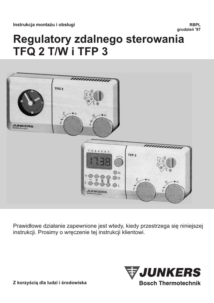 Instrukcja monta¿u i obs³ugi RBPL grudzieñ '97 Regulatory zdalnego sterowania TFQ 2 T/W i TFP 3 Prawid³owe dzia³anie zapewnione jest wtedy, kiedy przestrzega siê niniejszej instrukcji. Prosimy o wrêczenie tej instrukcji klientowi. Z korzyœci¹ dla ludzi i œrodowiska TFQ 2 T/W TFP 3 1 2 p d d g g f e 3 f 4 ∅ 55 mm 0,6m 1,2-1,5m min.0,3m 0,3m 3,5 mm 5 6 mm 2 e 6 3,5 mm 6 mm i k j TFQ 2 T/W TFP 3 7 l 8 l m m n n Zegar steruj¹cy TFQ 2 T l - wskaŸnik czasu m - pierœcieñ z wyskalowaniem 24h n - zasobnik na zapasowe wtyczki Zegar steruj¹cy TFQ 2 W l - wskaŸnik czasu m - pierœcieñ z podzia³em na 7 dni tygodnia i z podzia³em ka¿dego dnia na 24h n - zasobnik na zapasowe wtyczki 9 9 8 1 2 7 3 6 4 5 Elementy manipulacyjne i wskazuj¹ce TFP 3 1 - pokrêt³o nastawcze do przestawiania dni tygodnia oraz czasu zegarowego 2 - przycisk kasowania CL 3 - przycisk do nastawiania czasu 4 - przycisk do nastawiania dni tyg. 5 - przycisk do nastawiania rozpoczêcia grzania z obni¿on¹ temperatur¹ & 6 - przycisk do nastawiania rozpoczêcia grzania (praca normalna) % 7 - wskazania kroku programu 8 - wskazania czasu zegarowego 9 - wskazania dnia tygodnia 3 TFQ 2 T/W TFP 3 1. Zastosowanie Regulatory zdalnego sterowania typu TFQ oraz TFP mog¹ byæ stosowane wy³¹cznie w po³¹czeniu z regulatorami pogodowymi typu TA...E/A. Dwa prze³¹czniki (i oraz j), znajduj¹ce siê wewn¹trz sterownika (rys. 6) umo¿liwiaj¹ dwa tryby pracy: a) jako zdalny sterownik, bez pomiaru temperatury pomieszczenia - pozycja # prze³¹czników i oraz j b) jako czujnik temperatury pomieszczenia pozycja " prze³¹czników i oraz j. Wskazówka: W przypadku stosowania sterownika wed³ug punktu a), miejsce monta¿u mo¿na wybraæ dowolnie. Przy zastosowaniu jak w punkcie b) urz¹dzenie musi byæ zamontowane zgodnie z punktem 3 niniejszej instrukcji. 2. Dane techniczne: Wysokoœæ Szerokoœæ G³êbokoœæ Napiêcie znamionowe Pr¹d znamionowy regulatora Zakres regulacji z pomiarem temp. pomieszczenia 82 mm 165 mm 42 mm 24V Praca normalna Praca z obni¿on¹ temp. zasilania Zmiana temp. zasilania (pomiar temp. otoczenia wy³¹czony) 17...23 C Praca normalna Praca z obni¿on¹ temp. zasilania Minimalna prêdkoœæ zmian temperatury Dopuszcz. temperatura otoczenia -25...+25 C 0,01A pozycja prze³¹cznika i oraz j " O O 12...17 C pozycja prze³¹cznika i oraz j # O O -50...0 C O 0,05 C o 0...35 C 3. Wskazówki monta¿owe Wa¿nym elementem jakoœci regulacji jest wybór odpowiedniego miejsca monta¿u sterownika. Pomieszczenie przewidziane dla zainstalowania sterownika musi byæ odpowiednie dla regulowania 4 temperatury zasilania ca³ej instalacji c.o. W miejscu gdzie zamontowany jest sterownik, nie mog¹ byæ zastosowane grzejnikowe zawory termostatyczne. Zaleca siê u¿ycie w tym miejscu zaworów sterowanych rêcznie z nastaw¹ wstêpn¹. Jako miejsce monta¿u najlepiej wybraæ œcianê wewnêtrzn¹ w taki sposób aby wyeliminowaæ oddzia³ywanie na sterownik przeci¹gów oraz promieniowania cieplnego (s³onecznego). Poni¿ej sterownika nale¿y zostawiæ wystarczaj¹co du¿o miejsca aby powietrze w pomieszczeniu mog³o swobodnie cyrkulowaæ przez otwory w obudowie urz¹dzenia (rys. 3). 4. Monta¿ Przed monta¿em podwa¿yæ i zdj¹æ wierzchni¹ czêœæ sterownika. Spodni¹ czêœæ sterownika mo¿na zamontowaæ na standardowej puszce podtynkowej o œrednicy 55 mm (rys. 4). Je¿eli sterownik montuje siê bezpoœrednio na œcianie, to mo¿na u¿yæ do wiercenia otworów szablonu dostarczonego razem z urz¹dzeniem (rys. 5). 5. Pod³¹czenie elektryczne Sterownik nale¿y pod³¹czyæ do regulatora pogodowego lub kot³a c.o. za pomoc¹ trzy¿y³owego kabla (1,5 mm2) wed³ug jednego z trzech schematów na rys. 16, 17 lub 18. Aby wyeliminowaæ oddzia³ywanie indukcyjne na przewód przy³¹czeniowy, nie powinien on byæ prowadzony w s¹siedztwie przewodów wysokiego napiêcia 220V lub 380V. UWAGA: Sterowników typu TFQ 2T, TFQ 2W i TFP 3 nie wolno pod³¹czaæ do napiêcia 220V. 6. Nastawianie sterownika Sterownik typ TFQ/TFP nie jest samodzielnym urz¹dzeniem, ale tylko modu³em zdalnego sterowania regulatora pogodowego z pomiarem lub bez pomiaru temperatury w pomieszczeniu. Za pomoc¹ w/w urz¹dzeñ mo¿na przesuwaæ, w zale¿noœci od potrzeb, krzyw¹ grzania ustawion¹ na regulatorze pogodowym. Dlatego te¿ wa¿nym jest, aby nastawy wspó³pracuj¹cego regulatora pogodowego typu TA...E/A by³y poprawne. Prze³¹cznik rodzaju pracy regulatora TA...E/A musi znajdowaæ siê w po³o¿eniu $ % lub & %. 6.1 Prze³¹cznik rodzaju pracy d (rys. 1, 2) Rodzaj pracy bêdzie w przysz³oœci ustawiany wy³¹cznie prze³¹cznikiem rodzaju pracy sterownika. TFQ 2 T/W TFP 3 Po³o¿enie $ Funkcja ochrony przed zamarzniêciem - przy temperaturach zewnêtrznych powy¿ej +4O C urz¹dzenie grzewcze oraz pompa s¹ wy³¹czone (w przypadku zastosowania regulatora TA 210 A pompa pracuje w sposób ci¹g³y). Zawór mieszaj¹cy c.o., o ile jest zainstalowany, przestawia siê w po³o¿enie „zamkniête”. Przy temperaturach zewnêtrznych wynosz¹cych poni¿ej +3 O C, urz¹dzenie grzewcze jest regulowane na temperaturê minimaln¹ ustawion¹ na regulatorze pogodowym TA...E/A, pompa obiegowa pracuje bez przerwy (TA...A), lub z przerwami (TA...E), zgodnie z uk³adem logicznym sterowania pompy. Zawór mieszaj¹cy c.o., o ile jest zainstalowany, reguluje temperaturê zasilania c.o. na +10OC. Po³o¿enie & Ci¹g³e obni¿enie temperatury zasilania o ok. 25OC, wzglêdnie obni¿enie temperatury w pomieszczeniu o ok. 5OC, w zale¿noœci od ustawienia prze³¹cznika j (rys. 6) przy jednakowym ustawieniu pokrête³ e i f (rys. 1, 2). Wartoœæ obni¿enia temperatury ustawiona na regulatorze TA...E/A nie ma ¿adnego wp³ywu, pompa pracuje w sposób ci¹g³y, lub w sposób przerywany, zgodnie z uk³adem logicznym sterowania pompy. Po³o¿enie $ % Automatyczna zmiana z pracy normalnej na pracê z okresowym wy³¹czaniem (program zabezpieczaj¹cy przed zamarzaniem),