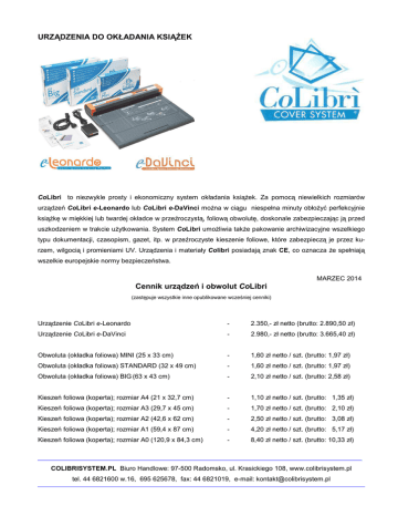 URZĄDZENIA DO OKŁADANIA KSIĄŻEK CoLibri to niezwykle prosty i ekonomiczny system okładania książek. Za pomocą niewielkich rozmiarów urządzeń CoLibri e-Leonardo lub CoLibri e-DaVinci można w ciągu niespełna minuty obłożyć perfekcyjnie książkę w miękkiej lub twardej okładce w przeźroczystą, foliową obwolutę, doskonale zabezpieczając ją przed uszkodzeniem w trakcie użytkowania. System CoLibri umożliwia także pakowanie archiwizacyjne wszelkiego typu dokumentacji, czasopism, gazet, itp. w przeźroczyste kieszenie foliowe, które zabezpieczą je przez kurzem, wilgocią i promieniami UV. Urządzenia i materiały Colibri posiadają znak CE, co oznacza że spełniają wszelkie europejskie normy bezpieczeństwa. MARZEC 2014 Cennik urządzeń i obwolut CoLibri (zastępuje wszystkie inne opublikowane wcześniej cenniki) Urządzenie CoLibri e-Leonardo - 2.350,- zł netto (brutto: 2.890,50 zł) Urządzenie CoLibri e-DaVinci - 2.980,- zł netto (brutto: 3.665,40 zł) Obwoluta (okładka foliowa) MINI (25 x 33 cm) - 1,60 zł netto / szt. (brutto: 1,97 zł) Obwoluta (okładka foliowa) STANDARD (32 x 49 cm) - 1,60 zł netto / szt. (brutto: 1,97 zł) Obwoluta (okładka foliowa) BIG (63 x 43 cm) - 2,10 zł netto / szt. (brutto: 2,58 zł) Kieszeń foliowa (koperta); rozmiar A4 (21 x 32,7 cm) - 1,10 zł netto / szt. (brutto: 1,35 zł) Kieszeń foliowa (koperta); rozmiar A3 (29,7 x 45 cm) - 1,70 zł netto / szt. (brutto: 2,10 zł) Kieszeń foliowa (koperta); rozmiar A2 (42,6 x 62 cm) - 2,50 zł netto / szt. (brutto: 3,08 zł) Kieszeń foliowa (koperta); rozmiar A1 (59,4 x 87 cm) - 4,20 zł netto / szt. (brutto: 5,17 zł) Kieszeń foliowa (koperta); rozmiar A0 (120,9 x 84,3 cm) - 8,40 zł netto / szt. (brutto: 10,33 zł) _________________________________________________________________________________________________ COLIBRISYSTEM.PL Biuro Handlowe: 97-500 Radomsko, ul. Krasickiego 108, www.colibrisystem.pl tel. 44 6821600 w.16, 695 625678, fax: 44 6821019, e-mail: [email protected]