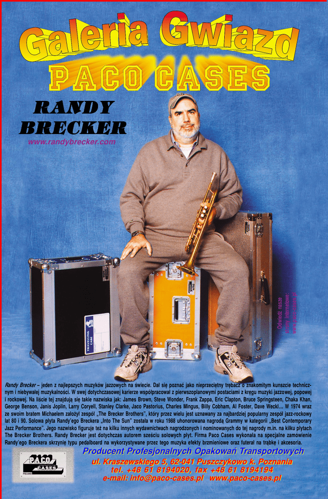 RANDY BRECKER Odwiedü nasze strony internetowe: www.paco-cases.pl www.randybrecker.com Randy Brecker ñ jeden z najlepszych muzykÛw jazzowych na úwiecie. Da≥ siÍ poznaÊ jako nieprzeciÍtny trÍbacz o znakomitym kunszcie technicznym i niebywa≥ej muzykalnoúci. W swej dotychczasowej karierze wspÛ≥pracowa≥ z pierwszoplanowymi postaciami z krÍgu muzyki jazzowej, popowej i rockowej. Na liúcie tej znajdujπ siÍ takie nazwiska jak: James Brown, Steve Wonder, Frank Zappa, Eric Clapton, Bruce Springsteen, Chaka Khan, George Benson, Janis Joplin, Larry Coryell, Stanley Clarke, Jaco Pastorius, Charles Mingus, Billy Cobham, Al Foster, Dave WecklÖ W 1974 wraz ze swoim bratem Michaelem za≥oøy≥ zespÛ≥ ÑThe Brecker Brothersî, ktÛry przez wielu jest uznawany za najbardziej popularny zespÛ≥ jazz-rockowy lat 80 i 90. Solowa p≥yta Randyíego Breckera ÑInto The Sunî zosta≥a w roku 1988 uhonorowana nagrodπ Grammy w kategorii ÑBest Contemporary Jazz Performanceî. Jego nazwisko figuruje teø na kilku innych wydawnictwach nagrodzonych i nominowanych do tej nagrody m.in. na kilku p≥ytach The Brecker Brothers. Randy Brecker jest dotychczas autorem szeúciu solowych p≥yt. Firma Paco Cases wykona≥a na specjalne zamÛwienie Randyíego Breckera skrzyniÍ typu pedalboard na wykorzystywane przez tego muzyka efekty brzmieniowe oraz futera≥ na trπbkÍ i akcesoria. Producent Profesjonalnych OpakowaÒ Transportowych ul. Kraszewskiego 5, 62-041 Puszczykowo k. Poznania tel. +48 61 8194020, fax +48 61 8194194 e-mail: [email protected] www.paco-cases.pl