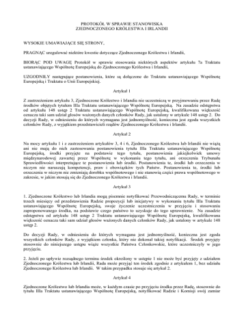 PROTOKÓŁ W SPRAWIE STANOWISKA ZJEDNOCZONEGO KRÓLESTWA I IRLANDII WYSOKIE UMAWIAJĄCE SIĘ STRONY, PRAGNĄC uregulować niektóre kwestie dotyczące Zjednoczonego Królestwa i Irlandii, BIORĄC POD UWAGĘ Protokół w sprawie stosowania niektórych aspektów artykułu 7a Traktatu ustanawiającego Wspólnotę Europejską do Zjednoczonego Królestwa i Irlandii, UZGODNIŁY następujące postanowienia, które są dołączone do Traktatu ustanawiającego Wspólnotę Europejską i Traktatu o Unii Europejskiej. Artykuł 1 Z zastrzeżeniem artykułu 3, Zjednoczone Królestwo i Irlandia nie uczestniczą w przyjmowaniu przez Radę środków objętych tytułem IIIa Traktatu ustanawiającego Wspólnotę Europejską. Na zasadzie odstępstwa od artykułu 148 ustęp 2 Traktatu ustanawiającego Wspólnotę Europejską, kwalifikowana większość oznacza taki sam udział głosów ważonych danych członków Rady, jak ustalony w artykule 148 ustęp 2. Do decyzji Rady, w odniesieniu do których wymagana jest jednomyślność, konieczna jest zgoda wszystkich członków Rady, z wyjątkiem przedstawicieli rządów Zjednoczonego Królestwa i Irlandii. Artykuł 2 Na mocy artykułu 1 i z zastrzeżeniem artykułów 3, 4 i 6, Zjednoczonego Królestwa lub Irlandii nie wiążą ani nie mają do nich zastosowania postanowienia tytułu IIIa Traktatu ustanawiającego Wspólnotę Europejską, środki przyjęte na podstawie tego tytułu, postanowienia jakiejkolwiek umowy międzynarodowej zawartej przez Wspólnotę w wykonaniu tego tytułu, ani orzeczenia Trybunału Sprawiedliwości interpretujące te postanowienia lub środki. Postanowienia te, środki lub orzeczenia w niczym nie naruszają kompetencji, praw i obowiązków tych Państw. Postanowienia te, środki lub orzeczenia w niczym nie zmieniają dorobku wspólnotowego i nie stanowią części prawa wspólnotowego w zakresie, w jakim stosują się do Zjednoczonego Królestwa i Irlandii. Artykuł 3 1. Zjednoczone Królestwo lub Irlandia mogą pisemnie notyfikować Przewodniczącemu Rady, w terminie trzech miesięcy od przedstawienia Radzie propozycji lub inicjatywy w wykonaniu tytułu IIIa Traktatu ustanawiającego Wspólnotę Europejską, swoje życzenie uczestniczenia w przyjęciu i stosowaniu zaproponowanego środka, na podstawie czego państwo to uzyskuje do tego uprawnienie. Na zasadzie odstępstwa od artykułu 148 ustęp 2 Traktatu ustanawiającego Wspólnotę Europejską, kwalifikowana większość oznacza taki sam udział głosów ważonych danych członków Rady, jak ustalony w artykule 148 ustęp 2. Do decyzji Rady, w odniesieniu do których wymagana jest jednomyślność, konieczna jest zgoda wszystkich członków Rady, z wyjątkiem członka, który nie dokonał takiej notyfikacji. Środek przyjęty stosownie do niniejszego ustępu wiąże wszystkie Państwa Członkowskie, które uczestniczyły w jego przyjęciu. 2. Jeżeli po upływie rozsądnego terminu środek określony w ustępie 1 nie może być przyjęty z udziałem Zjednoczonego Królestwa lub Irlandii, Rada może przyjąć ten środek zgodnie z artykułem 1, bez udziału Zjednoczonego Królestwa lub Irlandii. W takim przypadku stosuje się artykuł 2. Artykuł 4 Zjednoczone Królestwo lub Irlandia może, w każdym czasie po przyjęciu środka przez Radę, stosownie do tytułu IIIa Traktatu ustanawiającego Wspólnotę Europejską, notyfikować Radzie i Komisji swój zamiar przyjęcia tego środka. W tym przypadku procedura przewidziana w artykule 5a ustęp 3 Traktatu ustanawiającego Wspólnotę Europejską stosuje się mutatis mutandis. Artykuł 5 Państwa Członkowskiego, które nie jest związane środkiem przyjętym stosownie do tytułu IIIa Traktatu ustanawiającego Wspólnotę Europejską, nie obciążają skutki finansowe tego środka, inne niż koszty administracyjne ponoszone przez instytucje. Artykuł 6 Jeżeli w przypadkach określonych w niniejszym Protokole Zjednoczone Królestwo lub Irlandia są związane środkiem przyjętym przez Radę stosownie do tytułu IIIa Traktatu ustanawiającego Wspólnotę Europejską, odpowiednie postanowienia tego Traktatu, w tym artykuł 73p, stosują się do tego państwa w związku z tym środkiem. Artykuł 7 Artykuły 3 i 4 nie naruszają Protokołu włączającego dorobek Schengen w ramy Unii Europejskiej. Artykuł 8 Irlandia może na piśmie notyfikować Przewodniczącemu Rady swoją wolę niepodlegania już dalej postanowieniom niniejszego Protokołu. W tym przypadku wobec Irlandii stosują się zwykłe postanowienia traktatowe.
