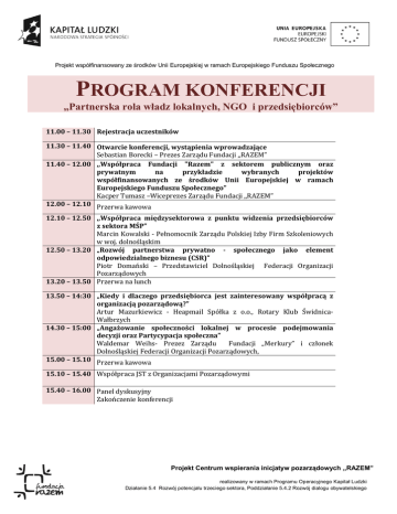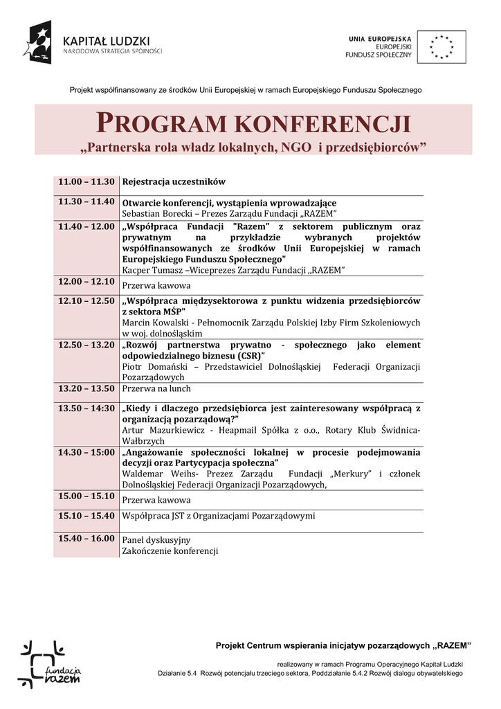 Projekt współfinansowany ze środków Unii Europejskiej w ramach Europejskiego Funduszu Społecznego PROGRAM KONFERENCJI „Partnerska rola władz lokalnych, NGO i przedsiębiorców” 11.00 – 11.30 Rejestracja uczestników 11.30 – 11.40 Otwarcie konferencji, wystąpienia wprowadzające Sebastian Borecki – Prezes Zarządu Fundacji ,,RAZEM” 11.40 – 12.00 ,,Współpraca Fundacji "Razem" z sektorem publicznym oraz prywatnym na przykładzie wybranych projektów współfinansowanych ze środków Unii Europejskiej w ramach Europejskiego Funduszu Społecznego" Kacper Tumasz –Wiceprezes Zarządu Fundacji ,,RAZEM” 12.00 – 12.10 Przerwa kawowa 12.10 – 12.50 ,,Współpraca międzysektorowa z punktu widzenia przedsiębiorców z sektora MŚP" Marcin Kowalski - Pełnomocnik Zarządu Polskiej Izby Firm Szkoleniowych w woj. dolnośląskim 12.50 – 13.20 „Rozwój partnerstwa prywatno - społecznego jako element odpowiedzialnego biznesu (CSR)” Piotr Domański – Przedstawiciel Dolnośląskiej Federacji Organizacji Pozarządowych 13.20 – 13.50 Przerwa na lunch 13.50 – 14:30 „Kiedy i dlaczego przedsiębiorca jest zainteresowany współpracą z organizacją pozarządową?” Artur Mazurkiewicz - Heapmail Spółka z o.o., Rotary Klub ŚwidnicaWałbrzych 14.30 – 15:00 „Angażowanie społeczności lokalnej w procesie podejmowania decyzji oraz Partycypacja społeczna” Waldemar Weihs- Prezez Zarządu Fundacji „Merkury” i członek Dolnośląskiej Federacji Organizacji Pozarządowych, 15.00 – 15.10 Przerwa kawowa 15.10 – 15.40 Współpraca JST z Organizacjami Pozarządowymi 15.40 – 16.00 Panel dyskusyjny Zakończenie konferencji Projekt Centrum wspierania inicjatyw pozarządowych ,,RAZEM” realizowany w ramach Programu Operacyjnego Kapitał Ludzki Działanie 5.4 Rozwój potencjału trzeciego sektora, Poddziałanie 5.4.2 Rozwój dialogu obywatelskiego