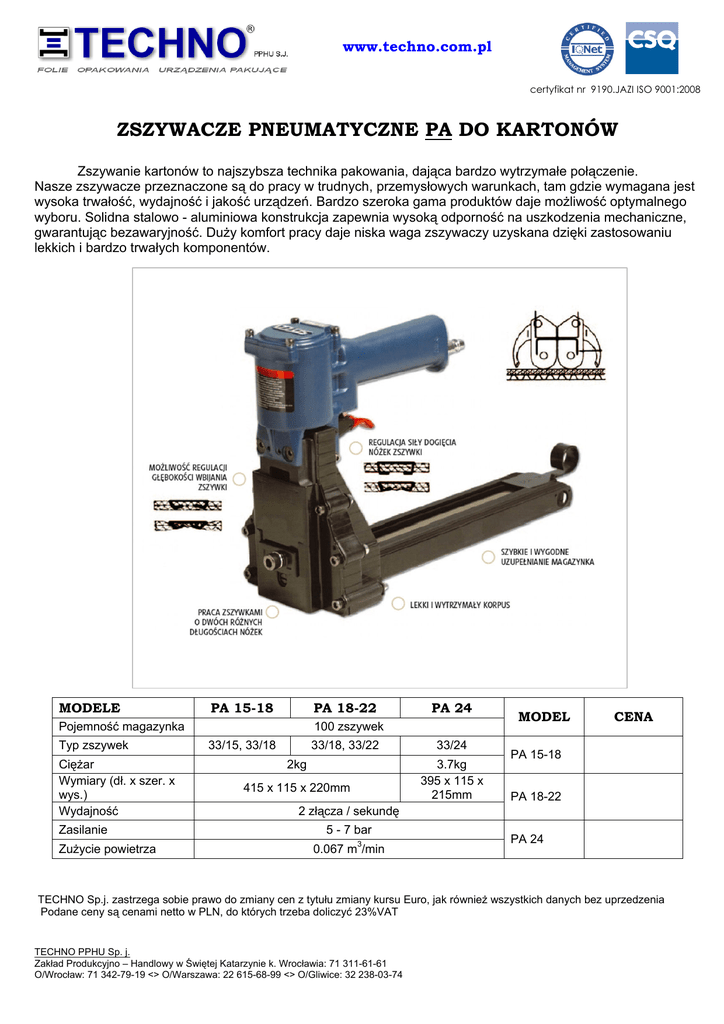 www.techno.com.pl certyfikat nr 9190.JAZI ISO 9001:2008 ZSZYWACZE PNEUMATYCZNE PA DO KARTONÓW Zszywanie kartonów to najszybsza technika pakowania, dająca bardzo wytrzymałe połączenie. Nasze zszywacze przeznaczone są do pracy w trudnych, przemysłowych warunkach, tam gdzie wymagana jest wysoka trwałość, wydajność i jakość urządzeń. Bardzo szeroka gama produktów daje moŜliwość optymalnego wyboru. Solidna stalowo - aluminiowa konstrukcja zapewnia wysoką odporność na uszkodzenia mechaniczne, gwarantując bezawaryjność. DuŜy komfort pracy daje niska waga zszywaczy uzyskana dzięki zastosowaniu lekkich i bardzo trwałych komponentów. MODELE PA 15-18 PA 18-22 Pojemność magazynka Typ zszywek CięŜar Wymiary (dł. x szer. x wys.) Wydajność Zasilanie ZuŜycie powietrza PA 24 100 zszywek 33/15, 33/18 33/18, 33/22 2kg 415 x 115 x 220mm 33/24 3.7kg 395 x 115 x 215mm MODEL CENA PA 15-18 PA 18-22 2 złącza / sekundę 5 - 7 bar 0.067 m3/min PA 24 TECHNO Sp.j. zastrzega sobie prawo do zmiany cen z tytułu zmiany kursu Euro, jak równieŜ wszystkich danych bez uprzedzenia Podane ceny są cenami netto w PLN, do których trzeba doliczyć 23%VAT TECHNO PPHU Sp. j. Zakład Produkcyjno – Handlowy w Świętej Katarzynie k. Wrocławia: 71 311-61-61 O/Wrocław: 71 342-79-19 <> O/Warszawa: 22 615-68-99 <> O/Gliwice: 32 238-03-74