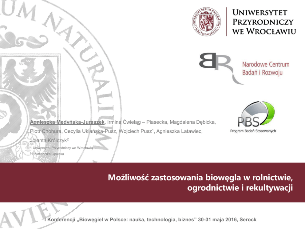 Agnieszka Medyńska-Juraszek, Irmina Ćwieląg – Piasecka, Magdalena Dębicka, Piotr Chohura, Cecylia Uklańska-Pusz, Wojciech Pusz1, Agnieszka Latawiec, Jolanta Królczyk2 1 Uniwersytet Przyrodniczy we Wrocławiu 2 Politechnika Opolska Możliwość zastosowania biowęgla w rolnictwie, ogrodnictwie i rekultywacji I Konferencji „Biowęgiel w Polsce: nauka, technologia, biznes” 30-31 maja 2016, Serock Kierunki badań ROLNICTWO OGRODNICTWO REKULTYWACJA Możliwość wykorzystania Wykorzystanie biowęgla Wykorzystanie biowęgla biowęgla jako dodatku do gleb w uprawie szklarniowej warzyw w procesie rekultywacji gleb mało urodzajnych i zanieczyszczonych metalami zdegradowanych na skutek ciężkimi. intensywnego użytkowania rolniczego. Doświadczenie polowe Doświadczenia wegetacyjne Doświadczenia wazonowe prowadzone we współpracy we współpracy Uniwersytetu prowadzone w Instytucie Nauk Politechniki Opolskiej i Przyrodniczego we Wrocławiu, o Glebie i Ochrony Uniwersytetu Przyrodniczego Świdnickiej Fabryki Urządzeń Środowiska, Uniwersytetu we Wrocławiu od 2014 roku Przemysłowych i gospodarstwa Przyrodniczego we Wrocławiu ogrodniczego IDEA AGRO Sp. od 2012 roku. z o.o. od 2013 roku. Obecnie realizowany wspólnie projekt finansowany w ramach III Programu Badań Stosowanych Nr projektu PBS3/B8/22/2015 Korzyści związane z zastosowaniem biowęgla w glebie 1. Poprawa właściwości fizycznych: struktury i tekstury zwiększenie porowatości poprawa właściwości wodno-powietrznych temperatury zwiększa pojemność cieplną gleb Korzyści związane z zastosowaniem biowęgla w glebie 2. Poprawa właściwości chemicznych zwiększenie pojemności sorpcyjnej magazynowanie składników pokarmowych i zapobieganie ich wymywaniu z gleby sorpcja zanieczyszczeń i ich immoblizacja w glebie regulacja odczynu gleb zwiększenie dostępności niektórych składników pokarmowych zmniejszenie toksyczności niektórych pierwiastków (np. Al, Fe, metali ciężkich) dla roślin Korzyści związane z zastosowaniem biowęgla w glebie potencjalne działanie nawozowe potencjalne źródło składników pokarmowych dla roślin (Ca, Mg, K, P, Zn, Cu, Mn, Fe, B i in.) www.biogrow.co.nz Korzyści związane z zastosowaniem biowęgla w glebie 3. Poprawa właściwości biologicznych wzrost aktywności biologicznej gleb zwiększenie liczebności mikroorganizmów dzięki poprawie właściwości wodnych i dużej porowatości materiału wzrost rozwoju mikoryz grzybowych wzrost liczby i aktywności dżdżownic zmniejszenie liczebności niektórych patogenów roślinnych www.nature.com www.bioforsk.no Korzyści związane z zastosowaniem biowęgla w glebie Możliwe negatywne oddziaływania biowęgla w glebie zwiększenie erozji wodnej i powietrznej gleb kompaktacja gleby może być konkurencyjny dla roślin w pobieraniu wody może ograniczać dostępność niektórych składników pokarmowych ograniczenie aktywności biologicznej gleb o małej zasobności w materię organiczną i składniki pokarmowe ryzyko zanieczyszczenia gleby metalami ciężkimi, WWA, PCB, dioksynami i furanami negatywne oddziaływanie na mezofaunę glebową wpływ na krążenie azotu w glebie (procesy nitryfikacji i denitryfikacji) – może ograniczać pobieranie azotu przez rośliny efekt starzenia się biowęgla Wpływ na wzrost i plonowanie roślin większość badań dotycząca biowęgla prowadzona była w warunkach klimatu tropikalnego i niemożna odnieść uzyskanych wyników do warunków występujących w naszej strefie klimatycznej stwierdzono pozytywny wpływ na plonowanie wielu gatunków roślin uprawnych (kukurydzy, ryżu, soi, grochu), warzyw i owoców, a także krzewów owocowych – wzrost plonów nawet o 50% Według najnowszych badań pozytywny efekt dodatku biowęgla na wzrost i plonowanie roślin jest widoczny tylko na glebach mało urodzajnych lub silnie zdegradowanych. Zawartość składników pokarmowych w biowęglu zależy od rodzaju materiału wsadowego i przebiegu procesu termicznego Zawartość składników pokarmowych i % udział form dostępnych w 0,11M kwasie octowym w biowęglach ze słomy pszenicznej Rok BC 2013 BC 2014 BC 2015 Total mg/kg % Total mg/kg N K P Ca Mg Na Mn Fe B 3600 11850 4500 13335 2700 360 398 1875 no 5 84 28 41 25 17 37 20 no 4128 12120 1200 14567 2680 110 384 1805 5 % Total mg/kg 4 96 37 47 24 31 45 27 6 5234 24977 3286 12829 3098 613 306 1042 8 % 4 96 23 16 19 31 9 23 12 Biowęgiel jako dodatek do gleb użytkowanych rolniczo Biowęgiel jako dodatek do gleb użytkowanych rolniczo doświadczenie 3 Biowęgiel jako dodatek do gleb użytkowanych rolniczo 40 35 Gleba bez BC 30 Gleba z BC WA%v/v 25 20 15 10 5 0 0 0,5 1 1,5 pF 2 2,5 Biowęgiel jako dodatek do gleb użytkowanych rolniczo Zawartość Corg oznaczona na CS-MAT Wykorzystanie biowęgla do produkcji podłoży ogrodniczych – doświadczenie 4 Wykorzystanie biowęgla w produkcji szklarniowej W dniu sadzenia… 4 tygodnie później… Wykorzystanie biowęgla w produkcji szklarniowej 8 tygodni później… Wykorzystanie biowęgla w produkcji szklarniowej Produkcja pomidora Wykorzystanie biowęgla w produkcji szklarniowej 100 90 80 70 % wilg 60 Biowęgiel 50 Wełna mineralna 40 Włókno kokosowe 30 20 10 0 VI VII VIII IX Wykorzystanie biowęgla do produkcji podłoży ogrodniczych – doświadczenie 4 Wykorzystanie biowęgla w produkcji szklarniowej Zaobserwowano wyraźny wzrost biomasy korzeni i części nadziemnych roślin wraz ze wzrostem udziału biowęgla w podłożu. Korzeń Trzykrotny wzrost masy korzeni. g/roślina Części nadziemne kg/wariant 0% BC 2,3 2,4 10% BC 2,7 2,6 25% BC 3,1 3,3 50% BC 3,1 4,2 75% BC 6,1 5,0 Dwukrotny wzrost masy części nadziemnych. Wykorzystanie biowęgla w produkcji szklarniowej Wraz ze wzrostem udziału biowęgla rośnie udział dostępnych dla roślin form składników pokarmowych, w szczególności potasu, co tłumaczy wyższą biomasę roślin uprawianych na podłożach o zawartości biowęgla > 50%. Możli