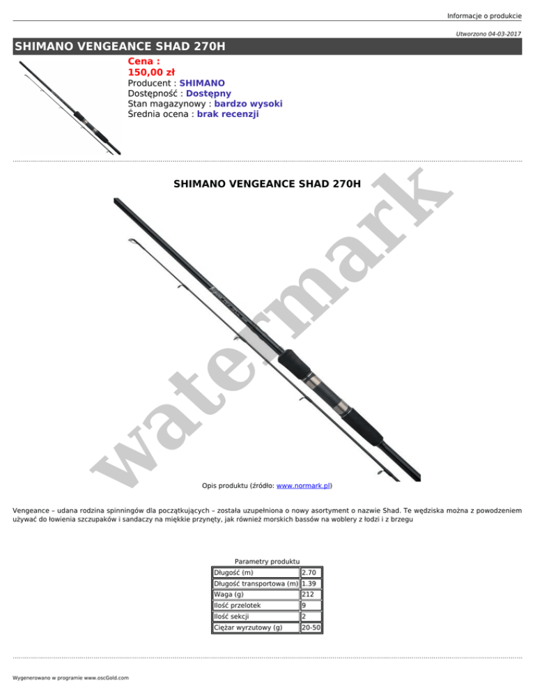Informacje o produkcie Utworzono 04-03-2017 SHIMANO VENGEANCE SHAD 270H Cena : 150,00 zł Producent : SHIMANO Dostępność : Dostępny Stan magazynowy : bardzo wysoki Średnia ocena : brak recenzji w at er m ar k SHIMANO VENGEANCE SHAD 270H Opis produktu (źródło: www.normark.pl) Vengeance – udana rodzina spinningów dla początkujących – została uzupełniona o nowy asortyment o nazwie Shad. Te wędziska można z powodzeniem używać do łowienia szczupaków i sandaczy na miękkie przynęty, jak również morskich bassów na woblery z łodzi i z brzegu Parametry produktu Długość (m) 2.70 Długość transportowa (m) 1.39 Wygenerowano w programie www.oscGold.com Waga (g) 212 Ilość przelotek 9 Ilość sekcji 2 Ciężar wyrzutowy (g) 20-50