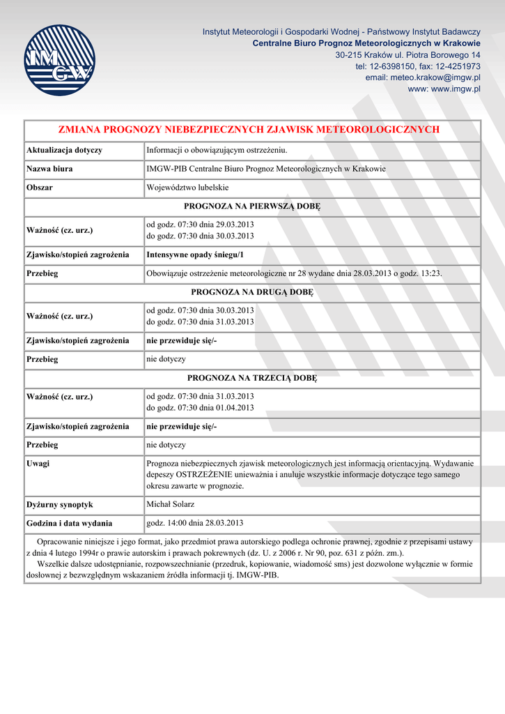 Instytut Meteorologii i Gospodarki Wodnej - Państwowy Instytut Badawczy Centralne Biuro Prognoz Meteorologicznych w Krakowie 30-215 Kraków ul. Piotra Borowego 14 tel: 12-6398150, fax: 12-4251973 email: [email protected] www: www.imgw.pl ZMIANA PROGNOZY NIEBEZPIECZNYCH ZJAWISK METEOROLOGICZNYCH Aktualizacja dotyczy Informacji o obowiązującym ostrzeżeniu. Nazwa biura IMGW-PIB Centralne Biuro Prognoz Meteorologicznych w Krakowie Obszar Województwo lubelskie PROGNOZA NA PIERWSZĄ DOBĘ Ważność (cz. urz.) od godz. 07:30 dnia 29.03.2013 do godz. 07:30 dnia 30.03.2013 Zjawisko/stopień zagrożenia Intensywne opady śniegu/1 Przebieg Obowiązuje ostrzeżenie meteorologiczne nr 28 wydane dnia 28.03.2013 o godz. 13:23. PROGNOZA NA DRUGĄ DOBĘ Ważność (cz. urz.) od godz. 07:30 dnia 30.03.2013 do godz. 07:30 dnia 31.03.2013 Zjawisko/stopień zagrożenia nie przewiduje się/- Przebieg nie dotyczy PROGNOZA NA TRZECIĄ DOBĘ Ważność (cz. urz.) od godz. 07:30 dnia 31.03.2013 do godz. 07:30 dnia 01.04.2013 Zjawisko/stopień zagrożenia nie przewiduje się/- Przebieg nie dotyczy Uwagi Prognoza niebezpiecznych zjawisk meteorologicznych jest informacją orientacyjną. Wydawanie depeszy OSTRZEŻENIE unieważnia i anuluje wszystkie informacje dotyczące tego samego okresu zawarte w prognozie. Dyżurny synoptyk Michał Solarz Godzina i data wydania godz. 14:00 dnia 28.03.2013 Opracowanie niniejsze i jego format, jako przedmiot prawa autorskiego podlega ochronie prawnej, zgodnie z przepisami ustawy z dnia 4 lutego 1994r o prawie autorskim i prawach pokrewnych (dz. U. z 2006 r. Nr 90, poz. 631 z późn. zm.). Wszelkie dalsze udostępnianie, rozpowszechnianie (przedruk, kopiowanie, wiadomość sms) jest dozwolone wyłącznie w formie dosłownej z bezwzględnym wskazaniem źródła informacji tj. IMGW-PIB.